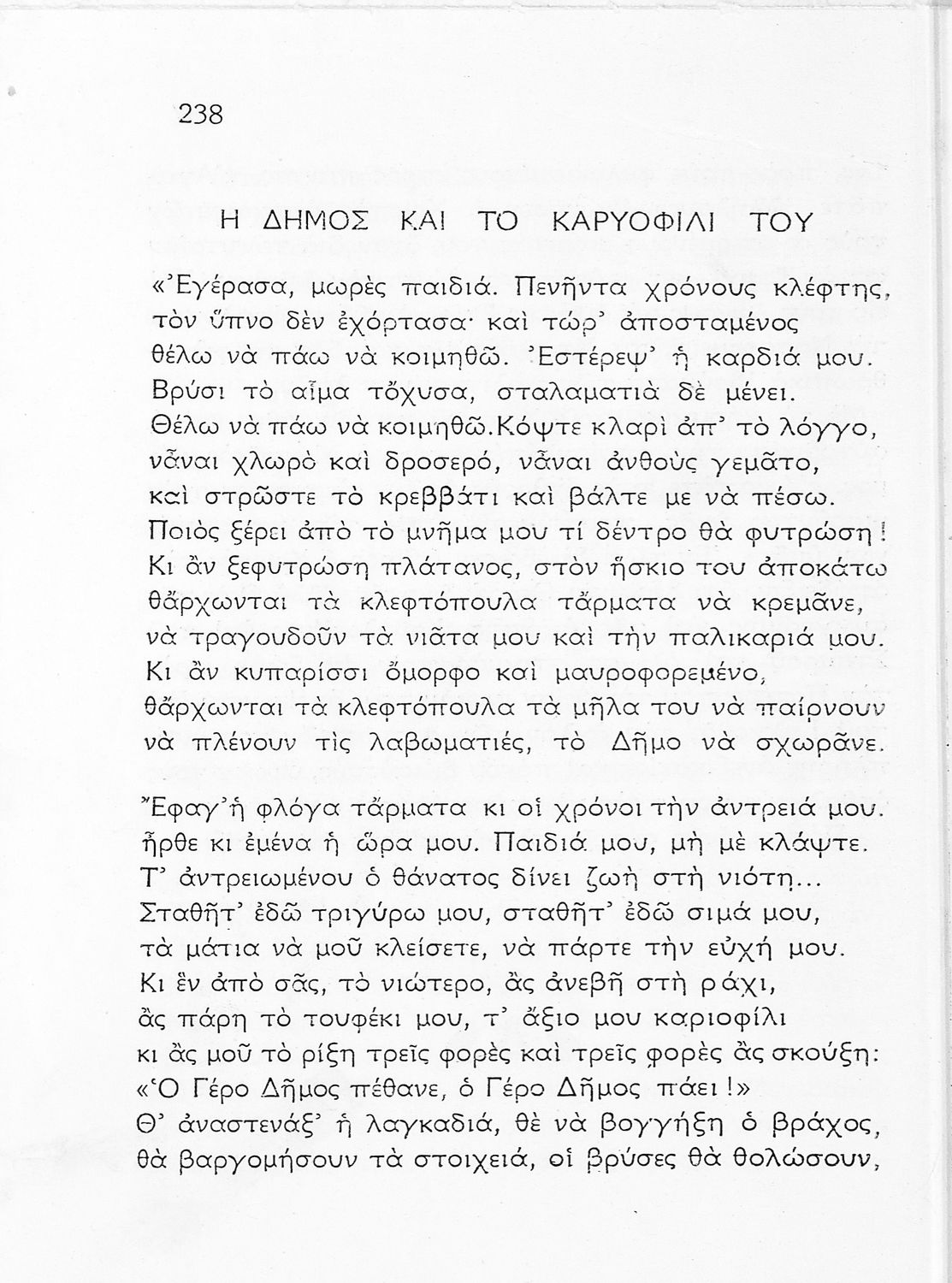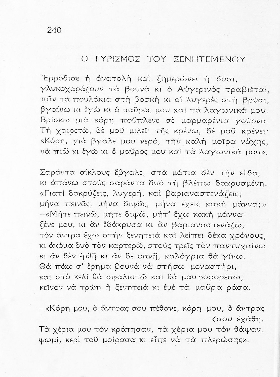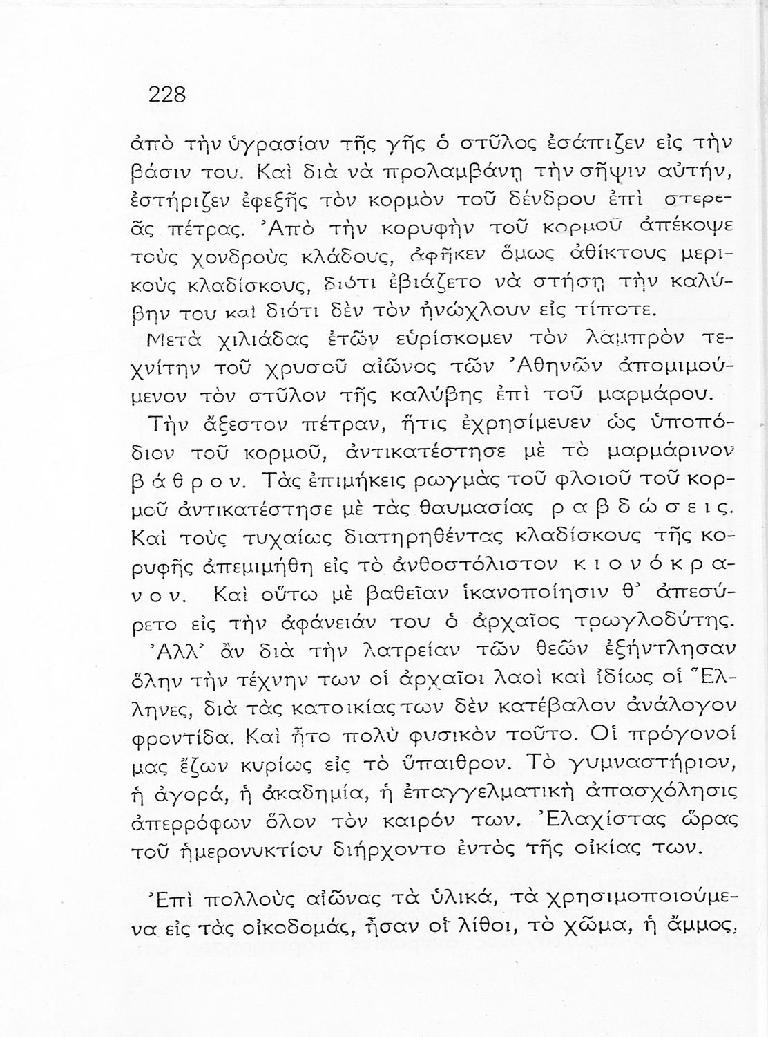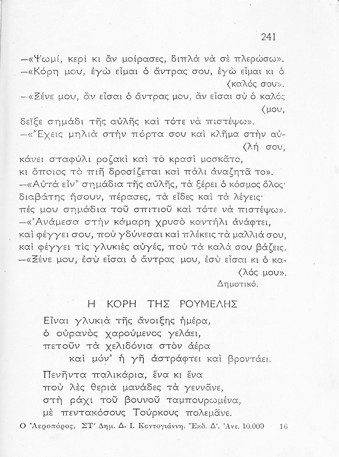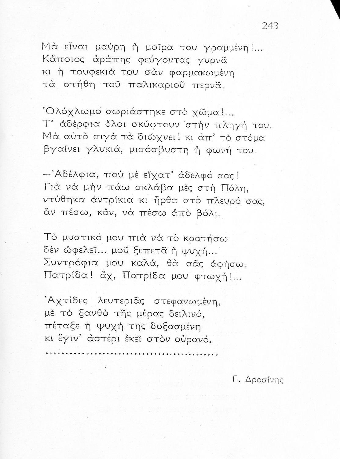 Αναγνωστικό ΣΤ΄ Δημοτικού που αποτελείται από πεζά γραμμένα σε καθαρεύουσα και ποιήματα σε δημοτική εμπνευσμένα από την οικογένεια, τη θρησκεία, την μυθολογία και ιστορία, την υγιεινή, την πατρίδα, την ελληνική φύση, την αγάπη για τα ζώα, τις καθημερινές ασχολίες και επαγγέλματα και τις ηθικές αρετές.