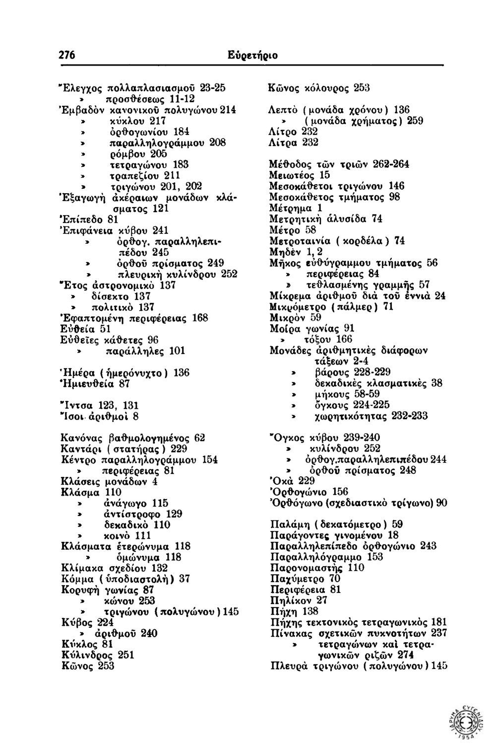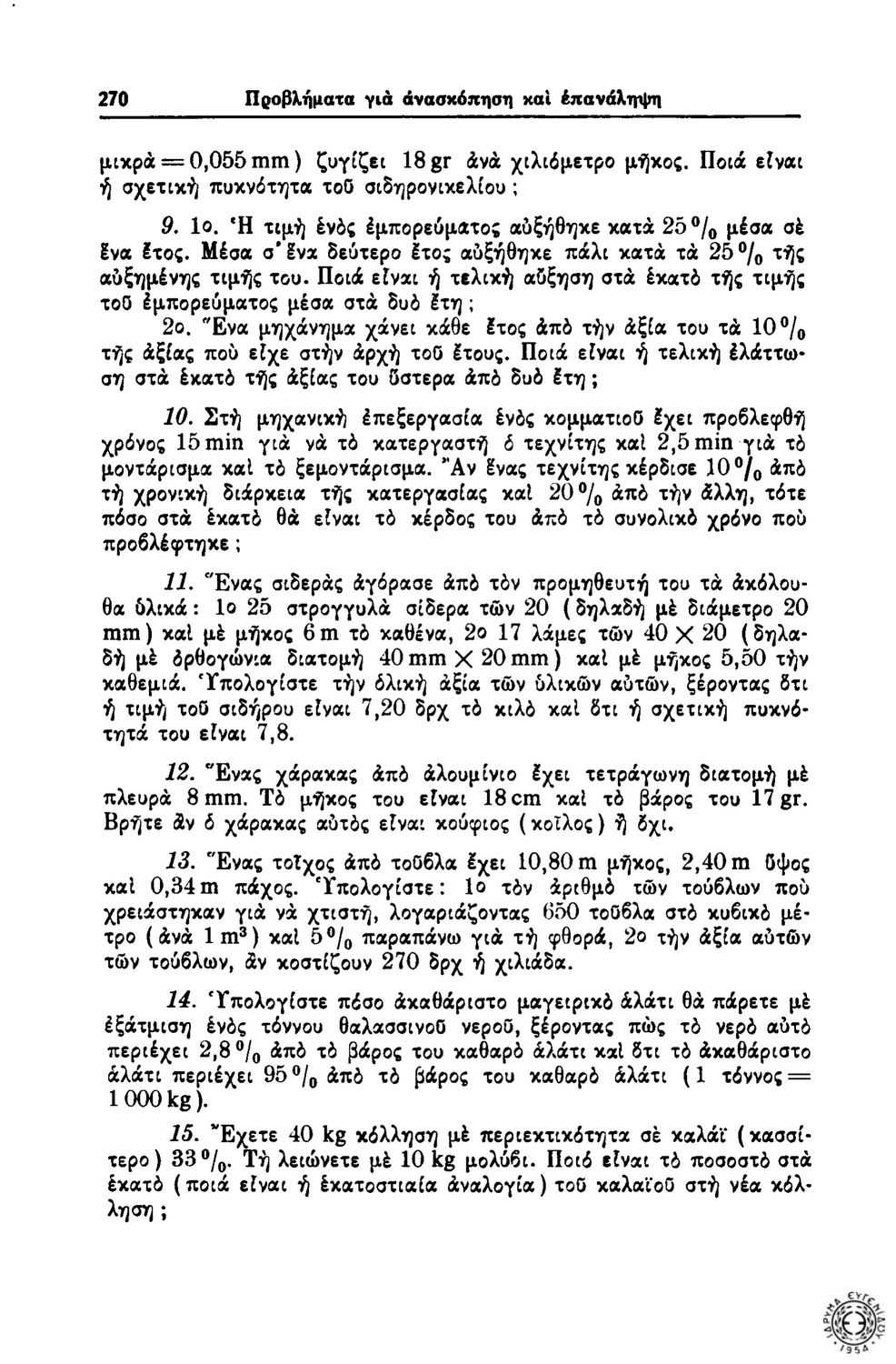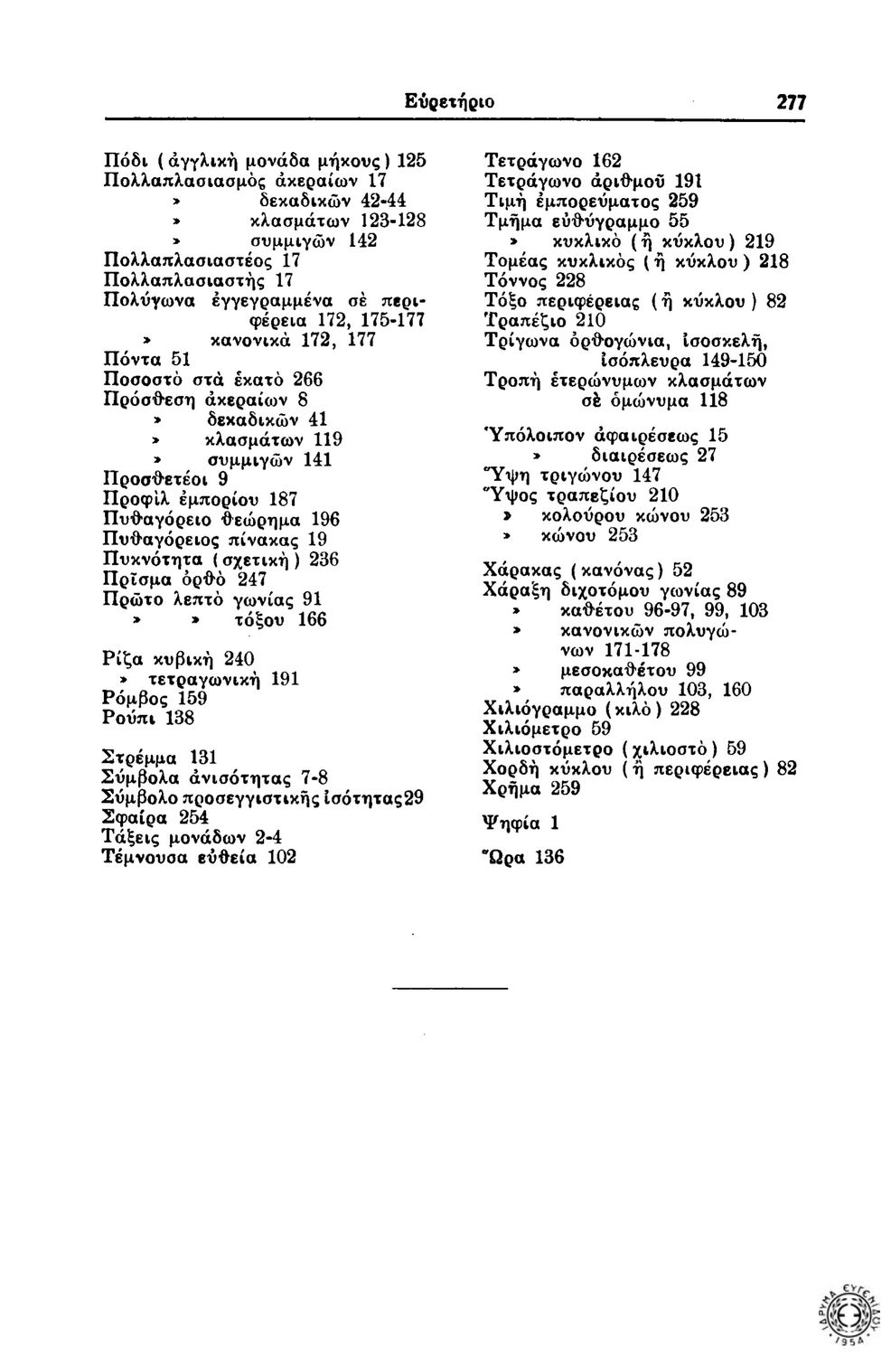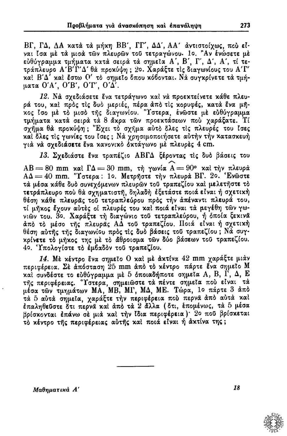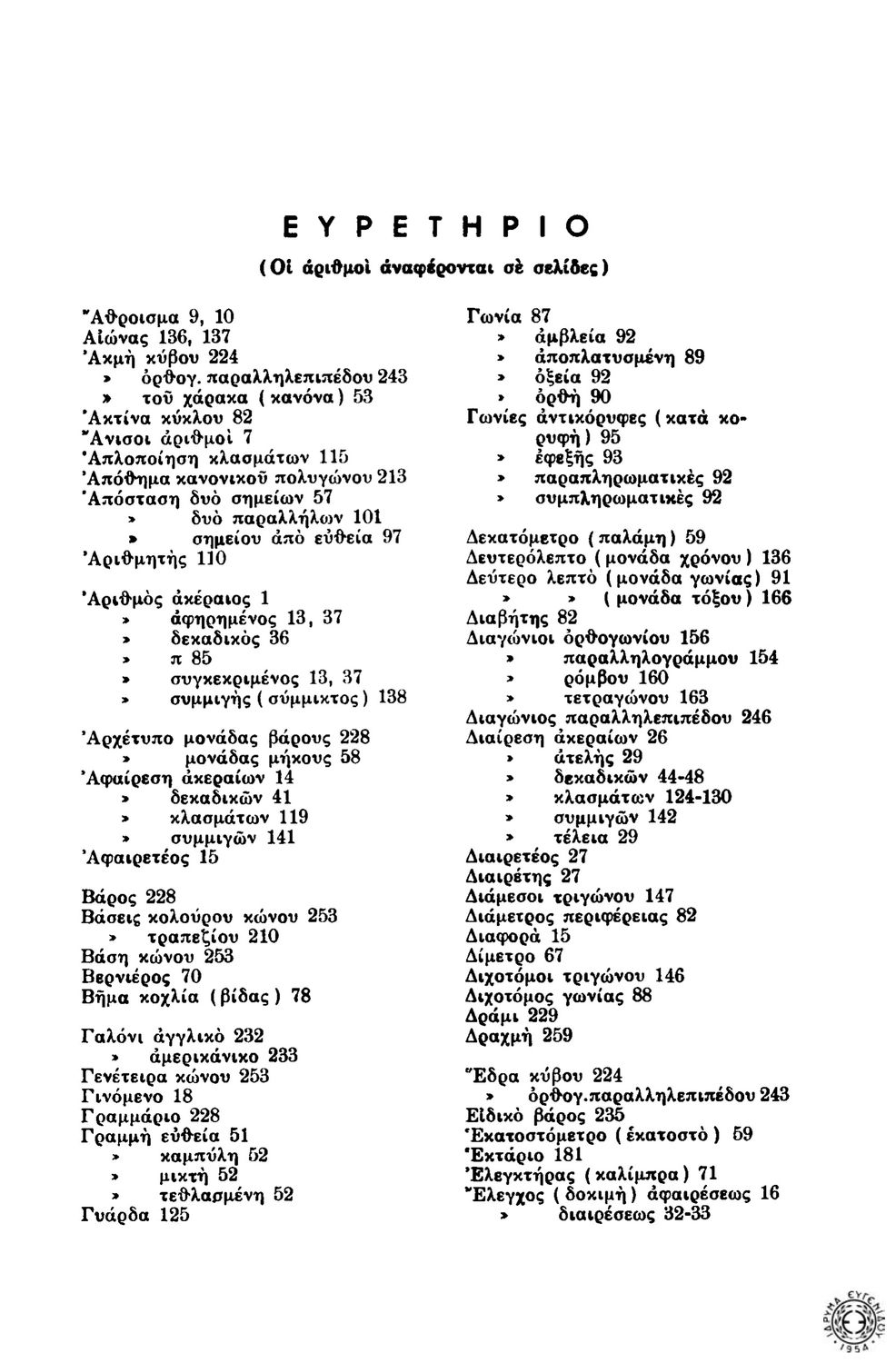 Παρουσίαση περιεχομένου: Με τον πρώτο αυτό τόμο από το τρίτομο διδακτικό σύγγραμμα «Μαθηματικά για τον Τεχνίτη» εγκαινιάστηκε η σειρά εκδόσεων του Ιδρύματος Ευγενίδου για την πρώτη βαθμίδα της επαγγελματικής τεχνικής εκπαίδευσης. Ο τόμος απαρτίζεται από δύο μέρη: στο πρώτο υπενθυμίζονται κάποια βασικά πράγματα από την Αριθμητική των ακεραίων και των δεκαδικών αριθμών. Το δεύτερο, που αποτελεί και το κύριο μέρος του τόμου, είναι προσαρμογή στα Ελληνικά του «Les Mathematiques en Ire Annee d’ apprentissage», Les Editions Foucher, Paris (1950) του Rene Cluzel.