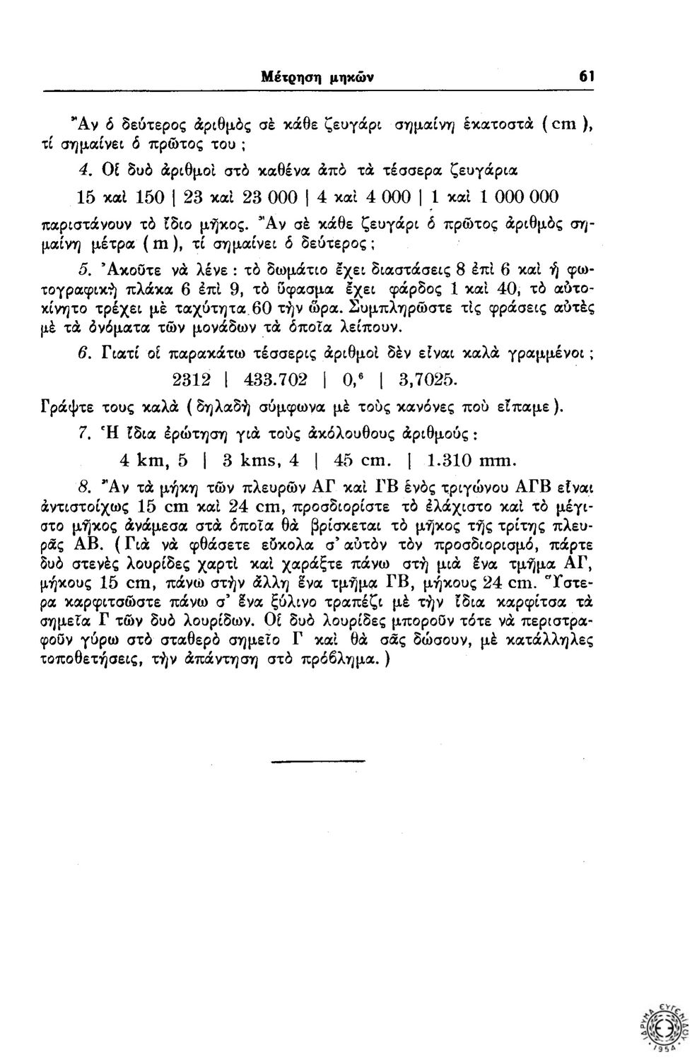 Παρουσίαση περιεχομένου: Με τον πρώτο αυτό τόμο από το τρίτομο διδακτικό σύγγραμμα «Μαθηματικά για τον Τεχνίτη» εγκαινιάστηκε η σειρά εκδόσεων του Ιδρύματος Ευγενίδου για την πρώτη βαθμίδα της επαγγελματικής τεχνικής εκπαίδευσης. Ο τόμος απαρτίζεται από δύο μέρη: στο πρώτο υπενθυμίζονται κάποια βασικά πράγματα από την Αριθμητική των ακεραίων και των δεκαδικών αριθμών. Το δεύτερο, που αποτελεί και το κύριο μέρος του τόμου, είναι προσαρμογή στα Ελληνικά του «Les Mathematiques en Ire Annee d’ apprentissage», Les Editions Foucher, Paris (1950) του Rene Cluzel.