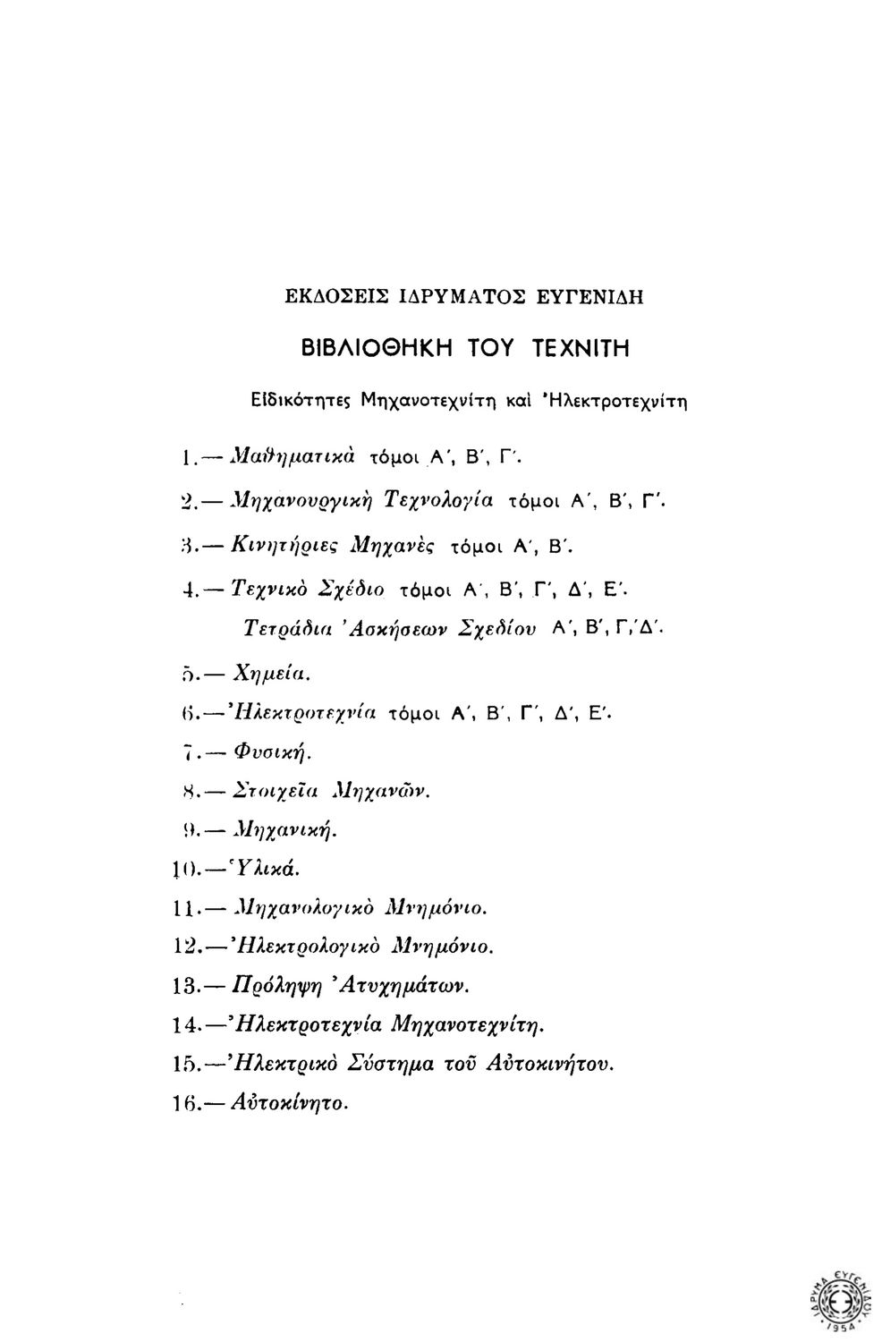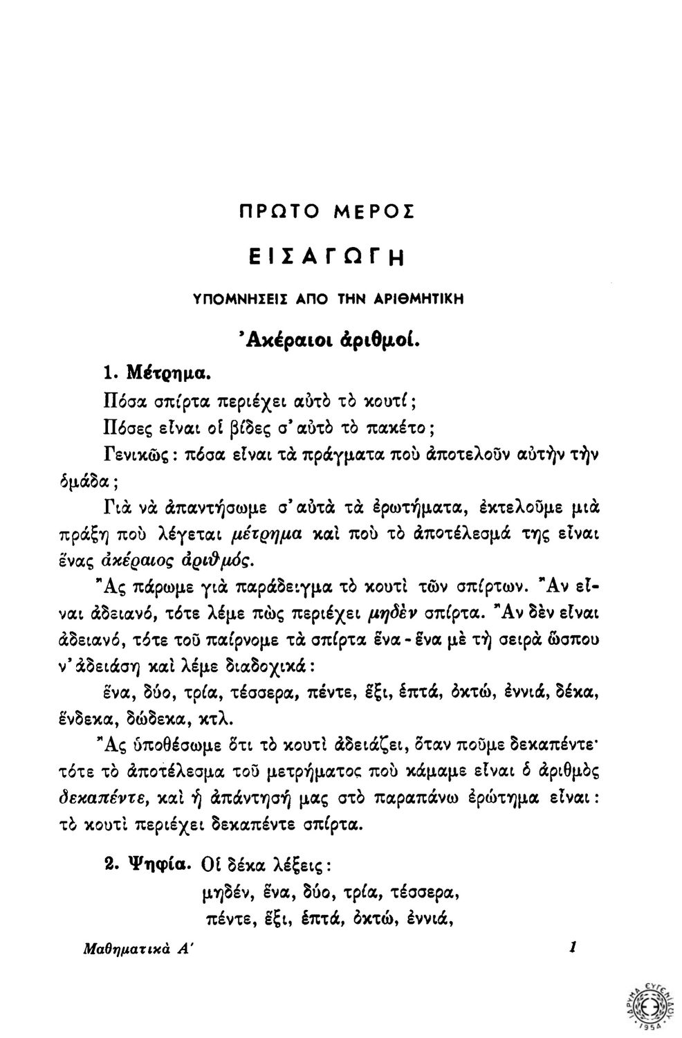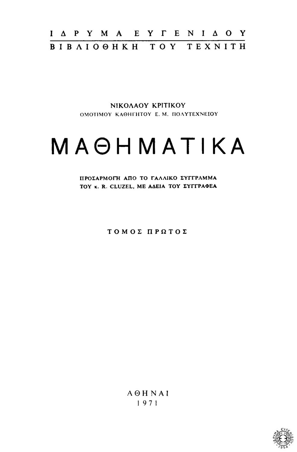 Παρουσίαση περιεχομένου: Με τον πρώτο αυτό τόμο από το τρίτομο διδακτικό σύγγραμμα «Μαθηματικά για τον Τεχνίτη» εγκαινιάστηκε η σειρά εκδόσεων του Ιδρύματος Ευγενίδου για την πρώτη βαθμίδα της επαγγελματικής τεχνικής εκπαίδευσης. Ο τόμος απαρτίζεται από δύο μέρη: στο πρώτο υπενθυμίζονται κάποια βασικά πράγματα από την Αριθμητική των ακεραίων και των δεκαδικών αριθμών. Το δεύτερο, που αποτελεί και το κύριο μέρος του τόμου, είναι προσαρμογή στα Ελληνικά του «Les Mathematiques en Ire Annee d’ apprentissage», Les Editions Foucher, Paris (1950) του Rene Cluzel.