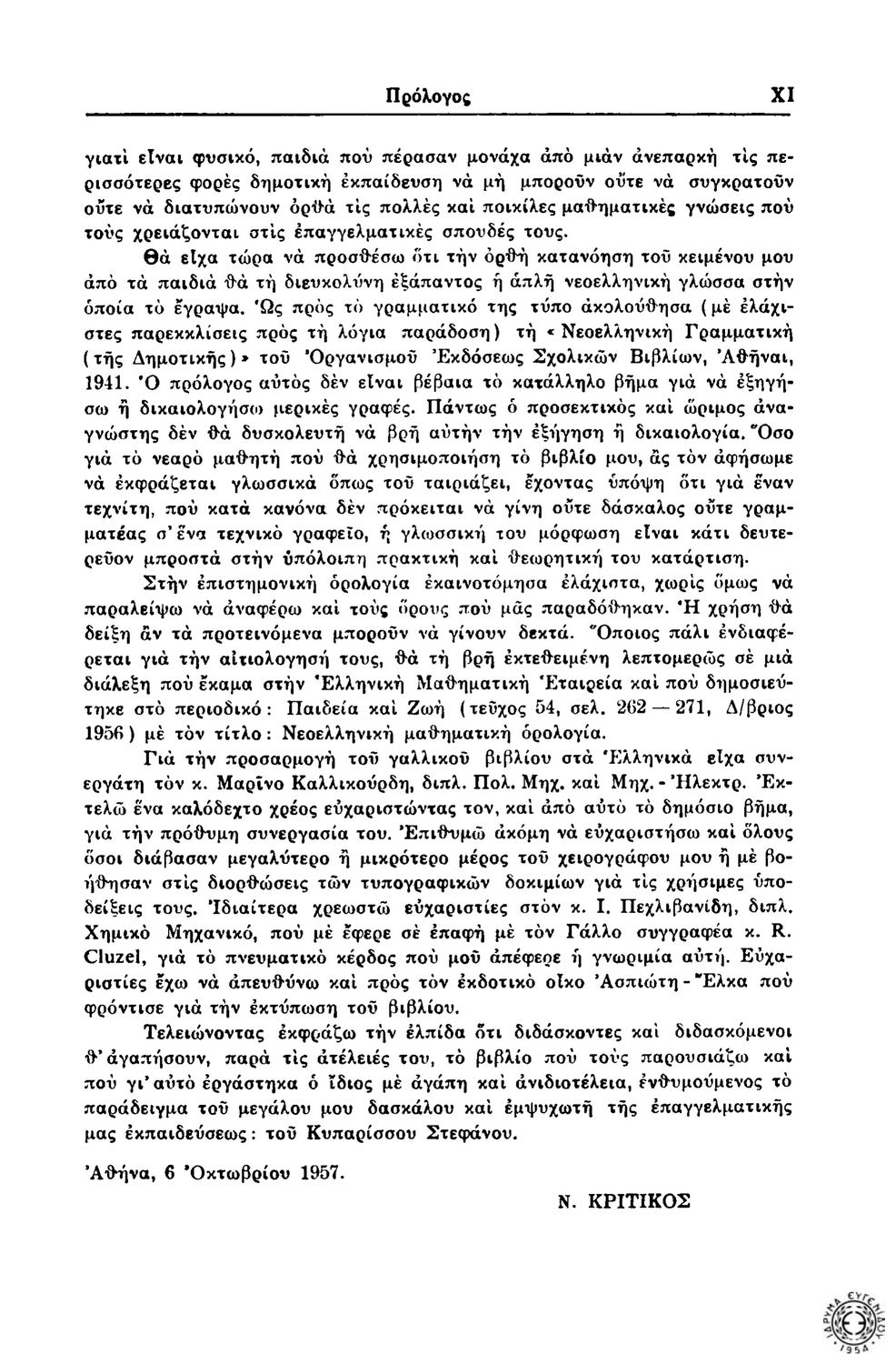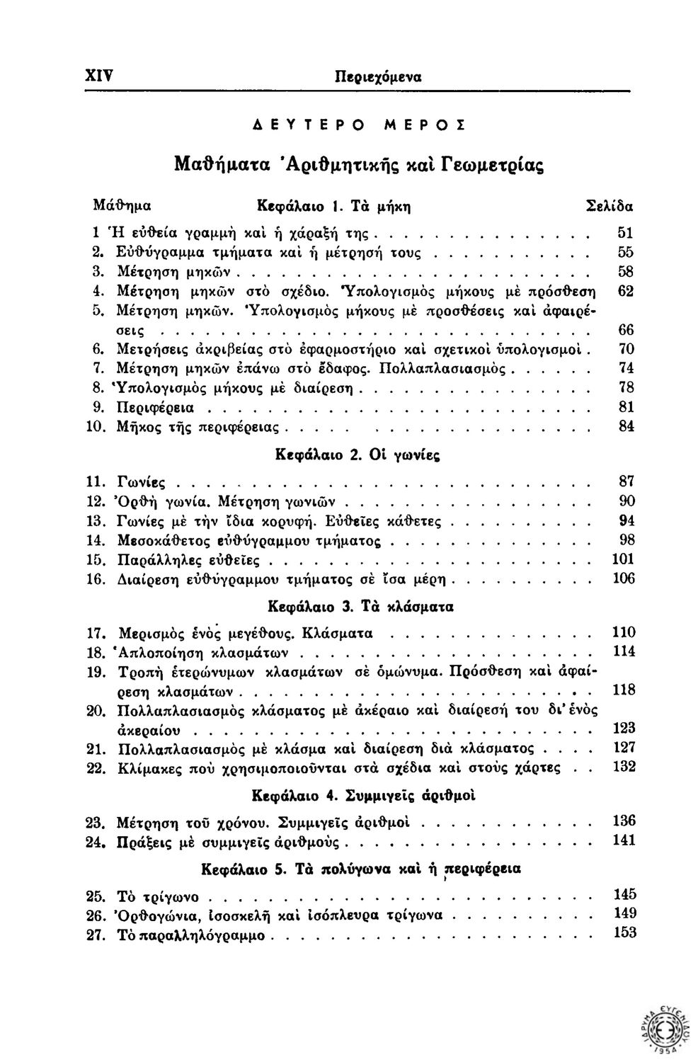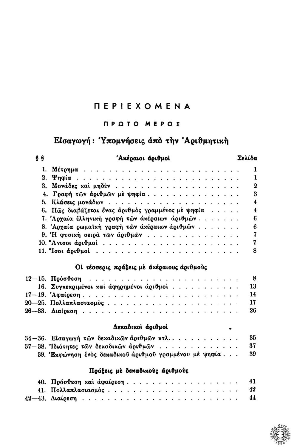 Παρουσίαση περιεχομένου: Με τον πρώτο αυτό τόμο από το τρίτομο διδακτικό σύγγραμμα «Μαθηματικά για τον Τεχνίτη» εγκαινιάστηκε η σειρά εκδόσεων του Ιδρύματος Ευγενίδου για την πρώτη βαθμίδα της επαγγελματικής τεχνικής εκπαίδευσης. Ο τόμος απαρτίζεται από δύο μέρη: στο πρώτο υπενθυμίζονται κάποια βασικά πράγματα από την Αριθμητική των ακεραίων και των δεκαδικών αριθμών. Το δεύτερο, που αποτελεί και το κύριο μέρος του τόμου, είναι προσαρμογή στα Ελληνικά του «Les Mathematiques en Ire Annee d’ apprentissage», Les Editions Foucher, Paris (1950) του Rene Cluzel.