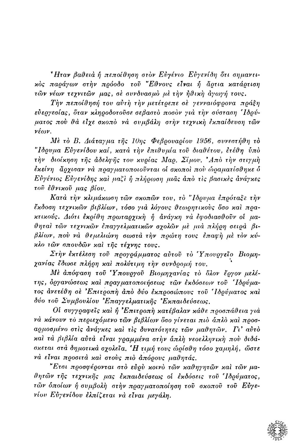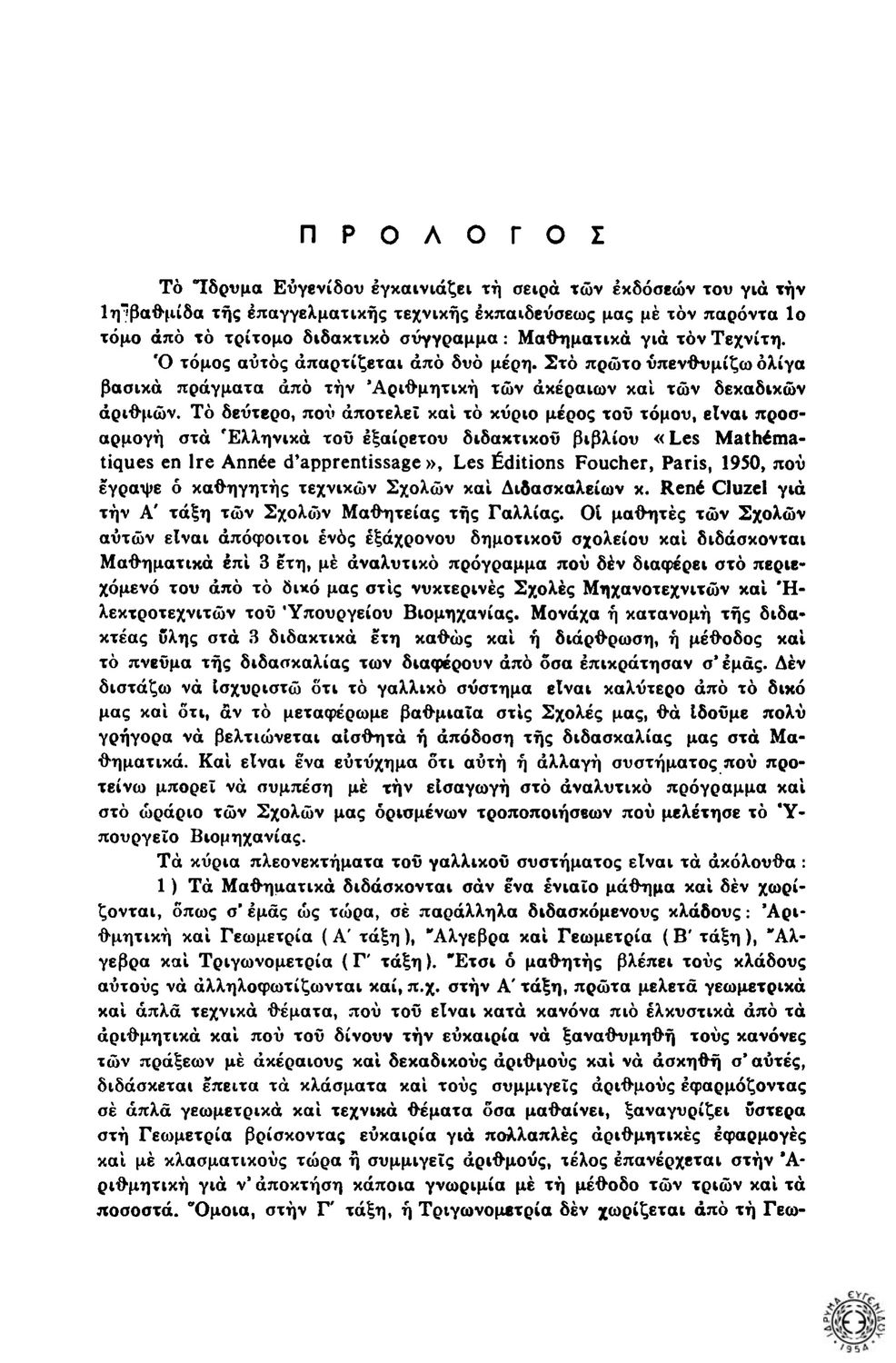 Με τον πρώτο αυτό τόμο από το τρίτομο διδακτικό σύγγραμμα «Μαθηματικά για τον Τεχνίτη» εγκαινιάστηκε η σειρά εκδόσεων του Ιδρύματος Ευγενίδου για την πρώτη βαθμίδα της επαγγελματικής τεχνικής εκπαίδευσης. Ο τόμος απαρτίζεται από δύο μέρη: στο πρώτο υπενθυμίζονται κάποια βασικά πράγματα από την Αριθμητική των ακεραίων και των δεκαδικών αριθμών. Το δεύτερο, που αποτελεί και το κύριο μέρος του τόμου, είναι προσαρμογή στα Ελληνικά του «Les Mathematiques en Ire Annee d’ apprentissage», Les Editions Foucher, Paris (1950) του Rene Cluzel.