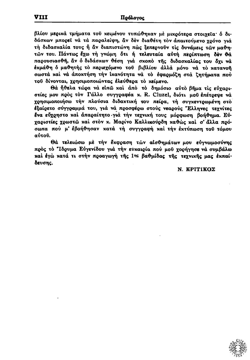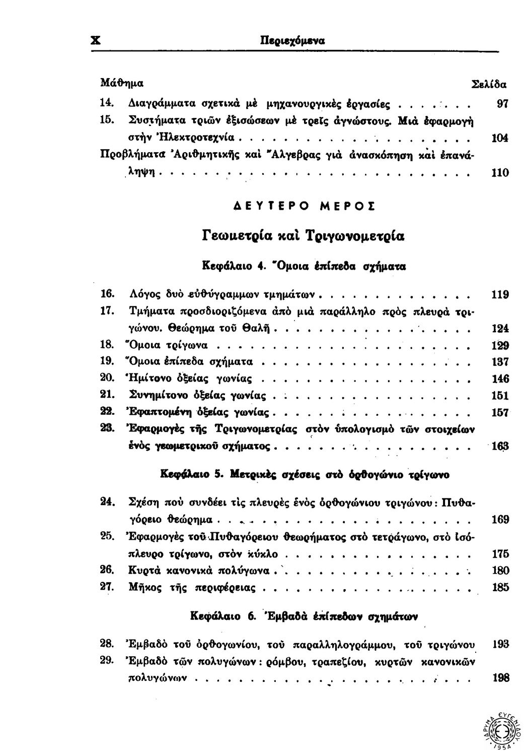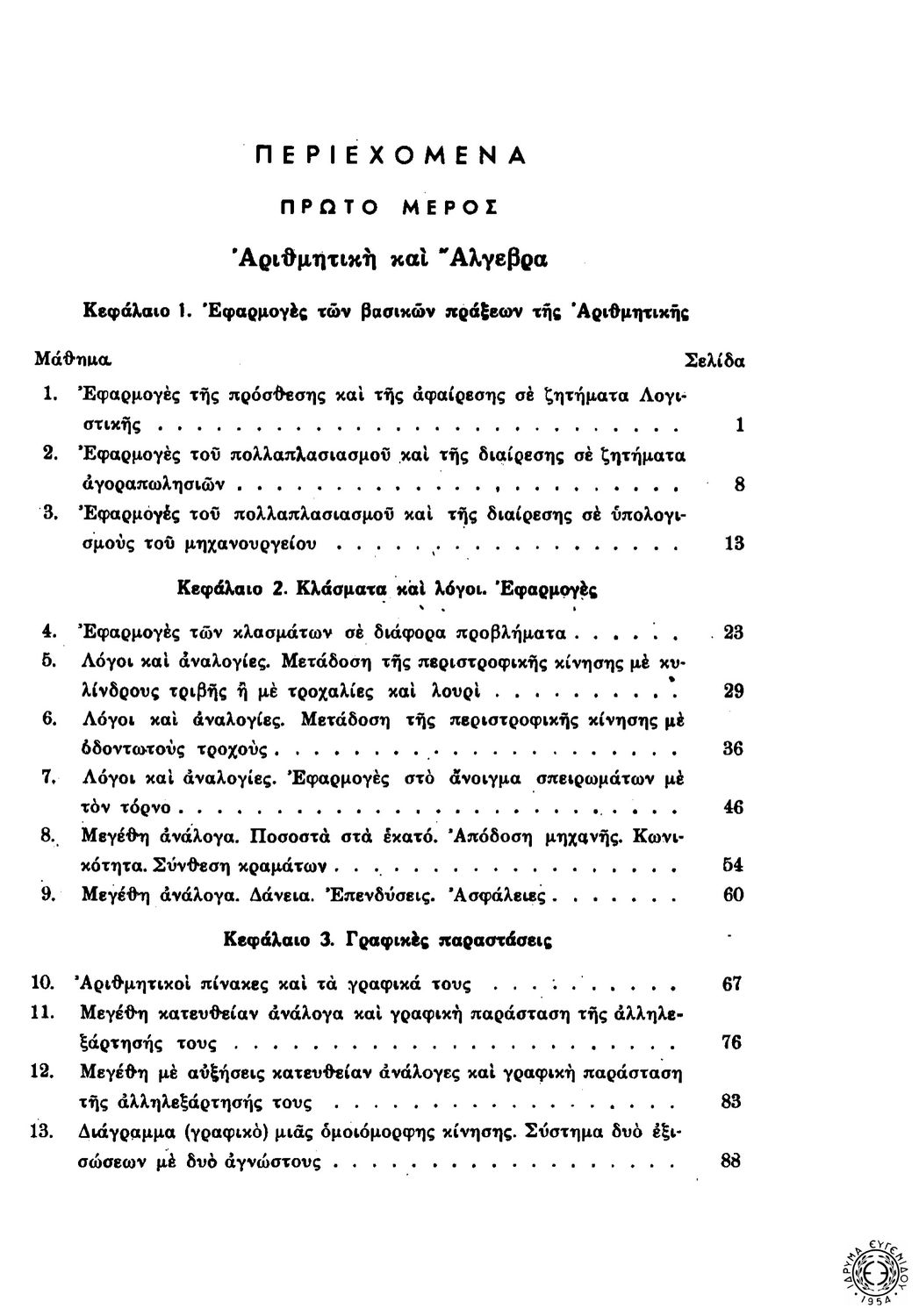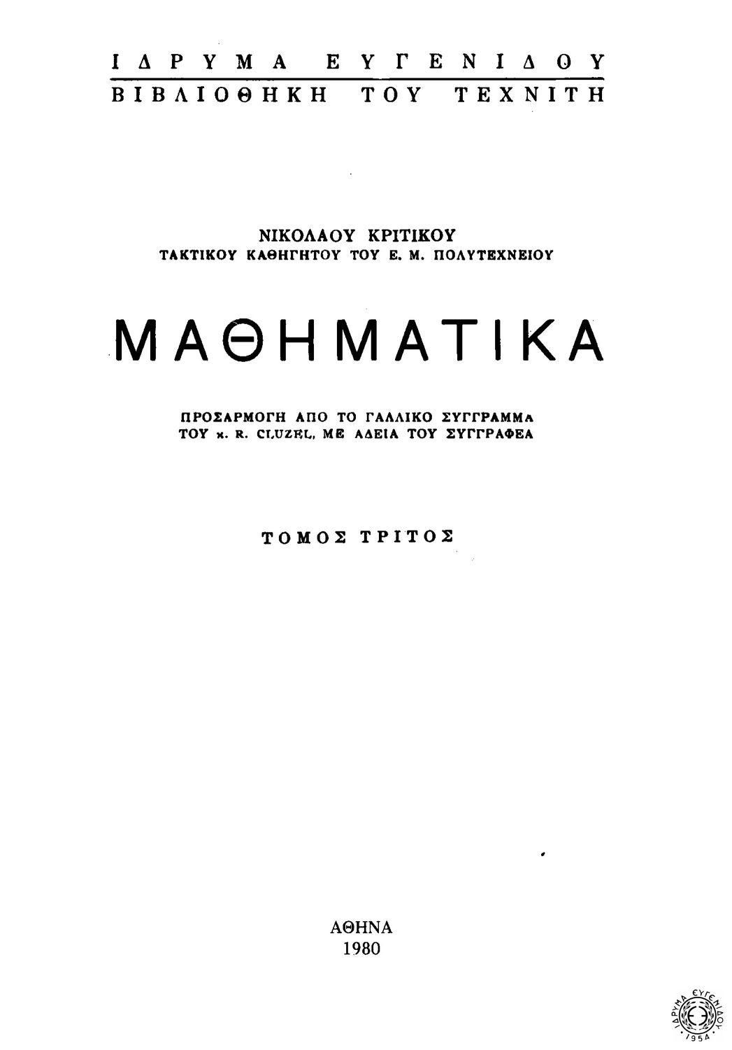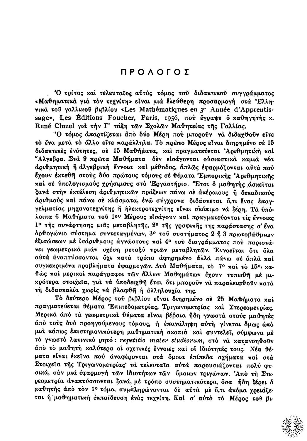 520 ## _aΟ τρίτος τόμος του διδακτικού συγγράμματος «Μαθηματικά για τον τεχνίτη» είναι μια ελεύθερη προσαρμογή στα ελληνικά του γαλλικού βιβλίου «Les Mathematiques en 3e Annee d’ Apprentissage», Les Editions Foucher, Paris, 1956, που έγραψε ο καθηγητής κ. Rene Cluzel για τη Γ΄ τάξη των Σχολών Μαθητείας της Γαλλίας. Ο τόμος απαρτίζεται από δύο μέρη, το πρώτο εκ των οποίων πραγματεύεται Αριθμητική και Άλγεβρα, ενώ το δεύτερο θέματα Επιπεδομετρίας, Τριγωνομετρίας και Στερεομετρίας.
