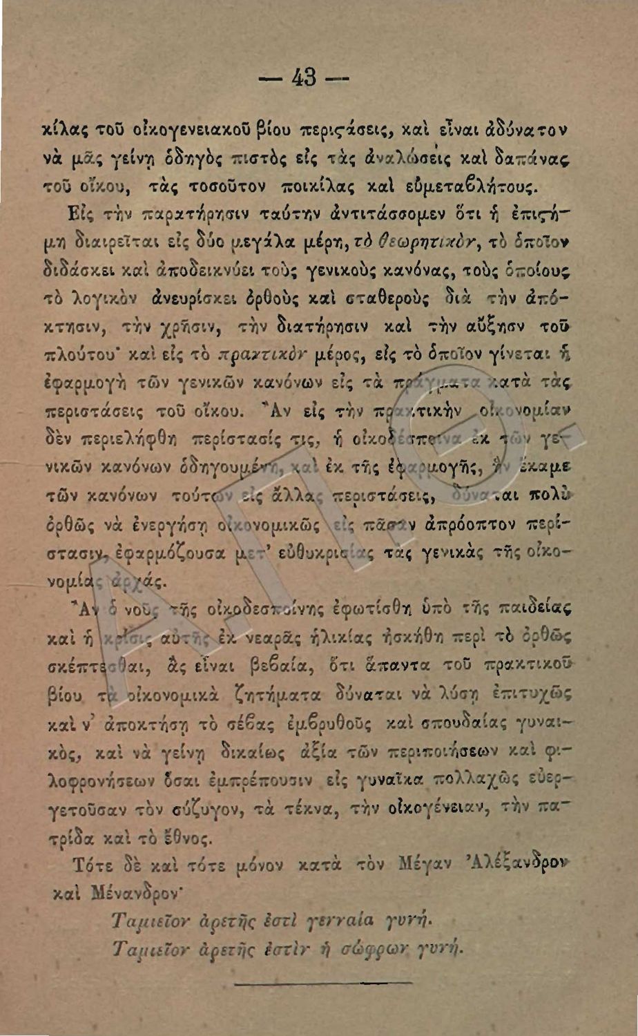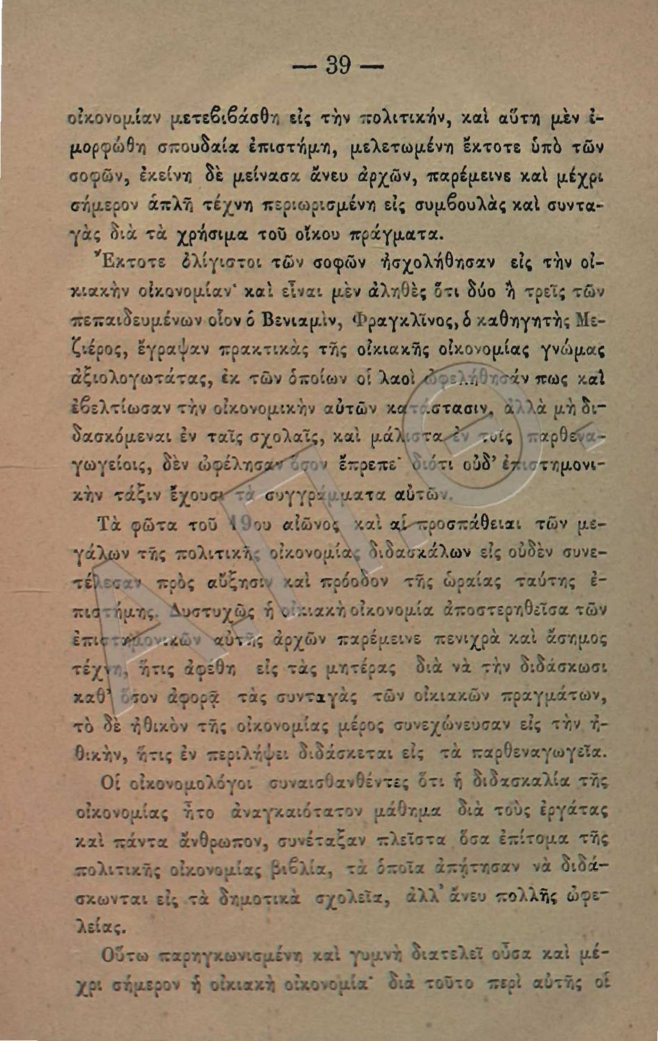 Σχολικό εγχειρίδιο για τις τάξεις του Παρθεναγωγείου για το μάθημα της Οικιακής Οικονομίας.
