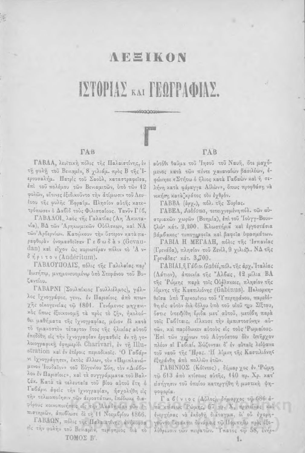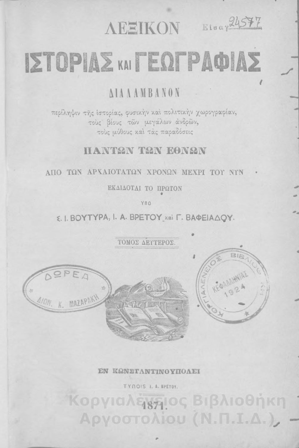 Λεξικόν Ιστορίας και Γεωγραφίας : διαλαμβάνον περίληψιν της ιστορίας, φυσικήν και πολιτικήν χωρογραφίαν, τους βίους των μεγάλων ανδρών, τους μύθους και τας παραδόσεις παντών των Εθνών από των αρχαιοτάτων χρόνων μέχρι του νυν
