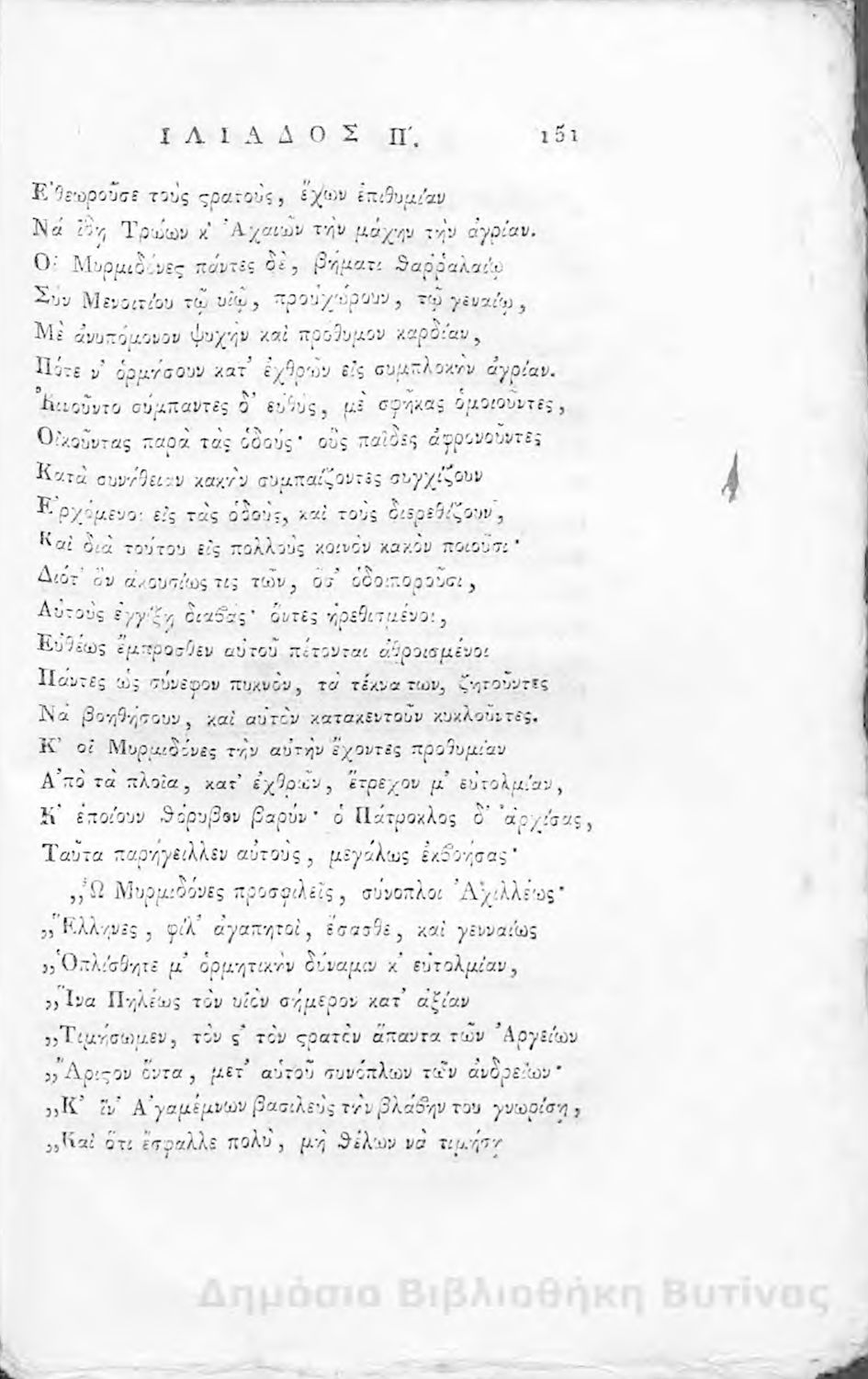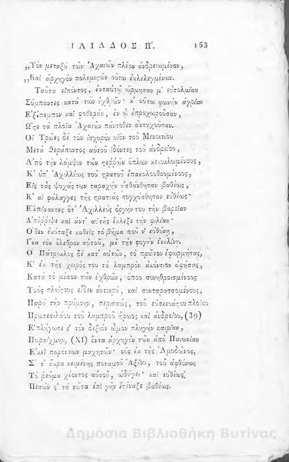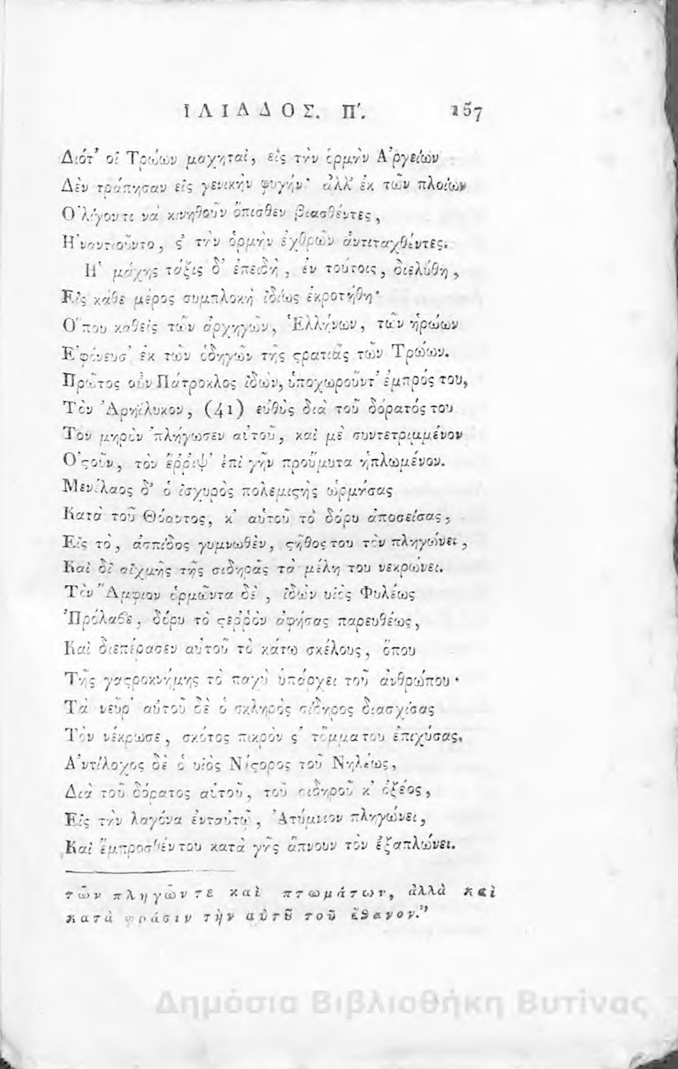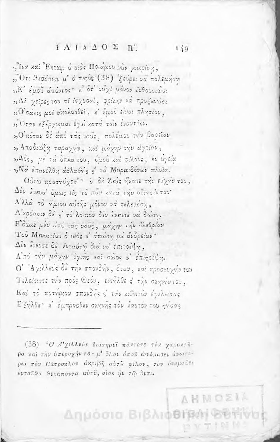 Ομήρου Ιλιάς : Παραφρασθείσα καί ομοιοκαταλήκτως στιχουργηθείσα μετά προσθήκης αναγκαίων καί επωφελών υποσημειώσεων καί αναρτήσεως της μυθολογίας, αλληγορίας καί αληθούς ιστορίας πάντων των εν αυτή εμπιπτόντων Θεών, ημιθέων και ένδόξων υποκειμένων προς χρήσιν της νεολαίας, και των προς κατάληψιν του ομηρικού καλάμου αδυνάτων