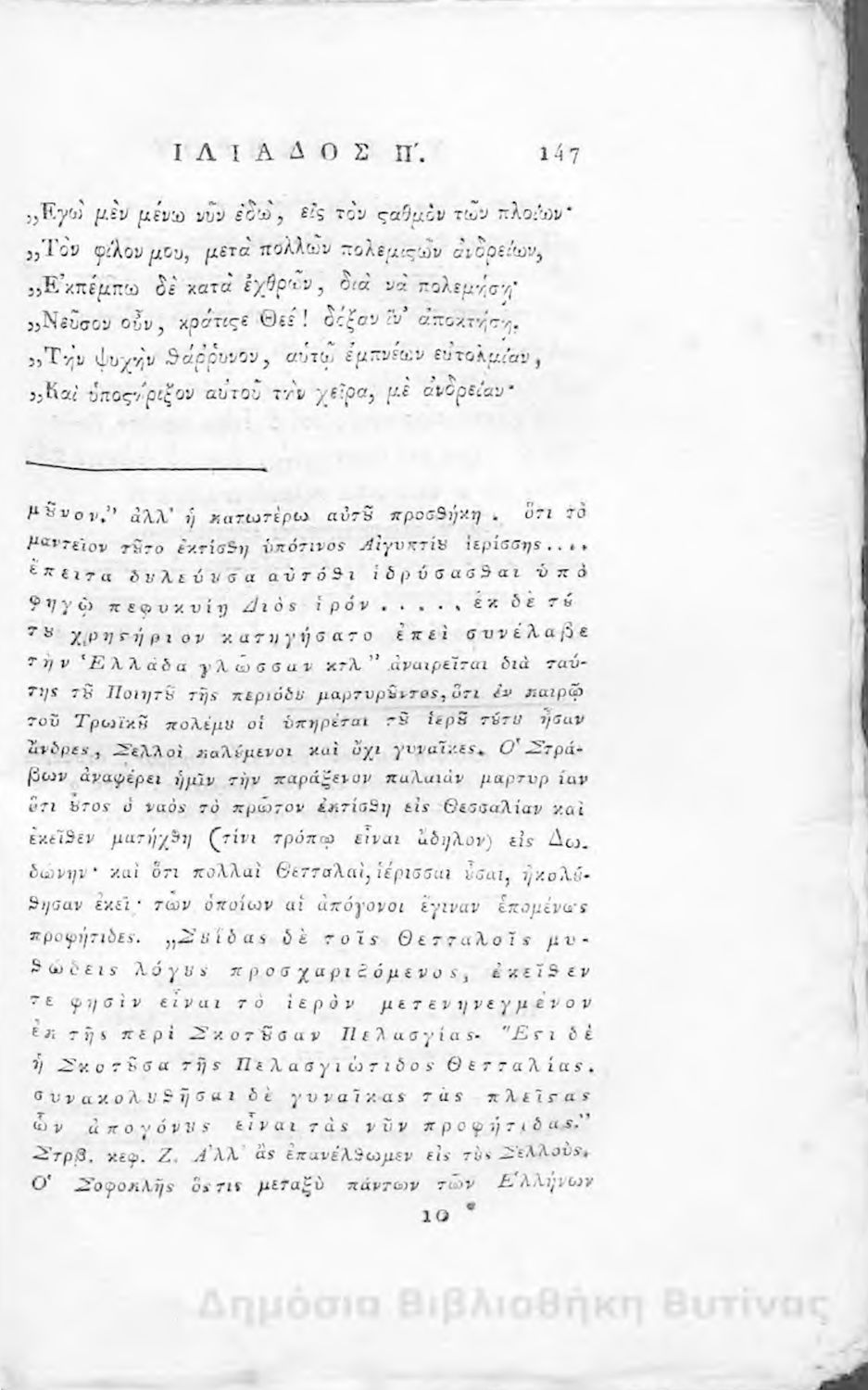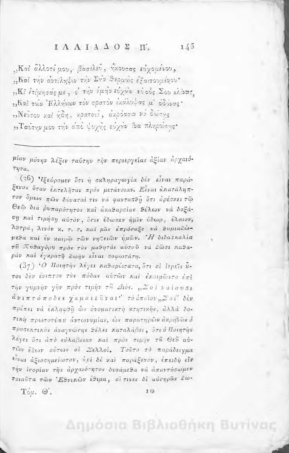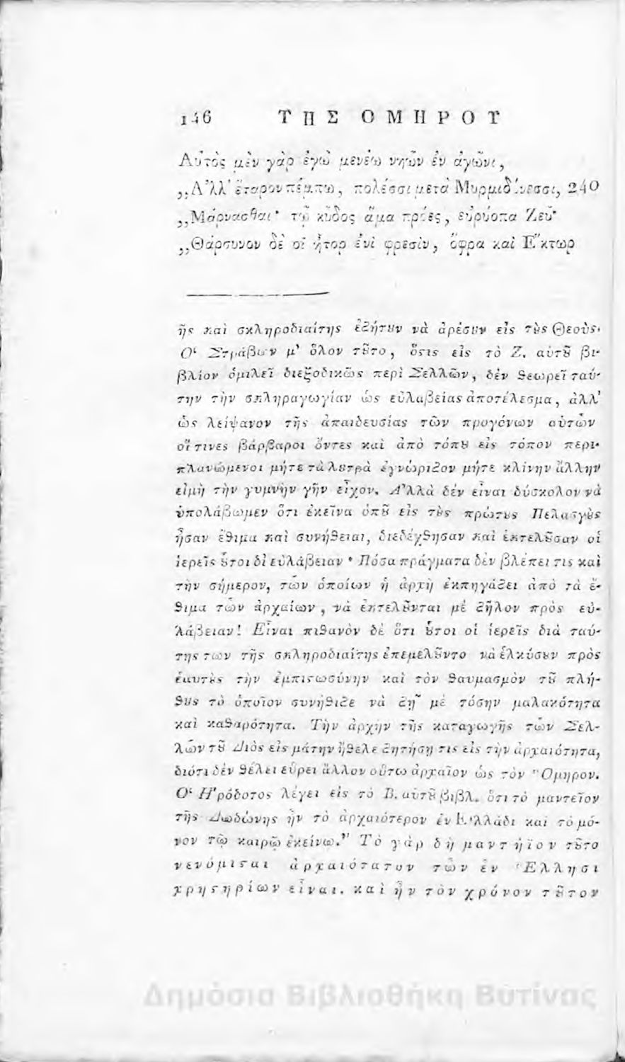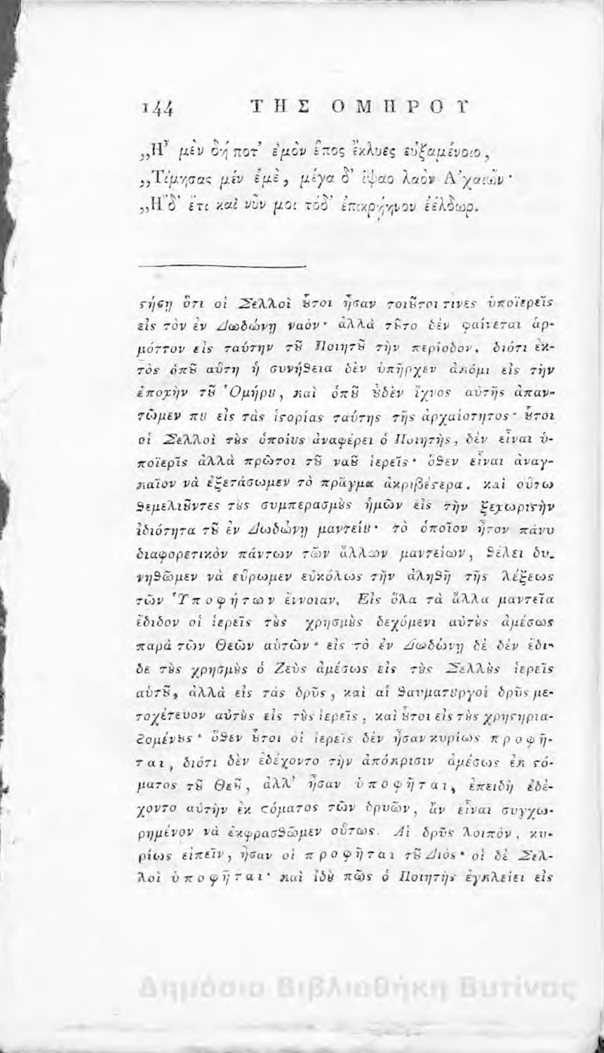 Τίτλος: Ομήρου Ιλιάς : Παραφρασθείσα καί ομοιοκαταλήκτως στιχουργηθείσα μετά προσθήκης αναγκαίων καί επωφελών υποσημειώσεων καί αναρτήσεως της μυθολογίας, αλληγορίας καί αληθούς ιστορίας πάντων των εν αυτή εμπιπτόντων Θεών, ημιθέων και ένδόξων υποκειμένων προς χρήσιν της νεολαίας, και των προς κατάληψιν του ομηρικού καλάμου αδυνάτων