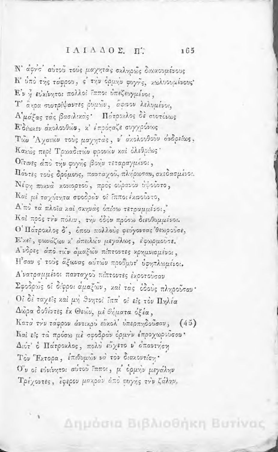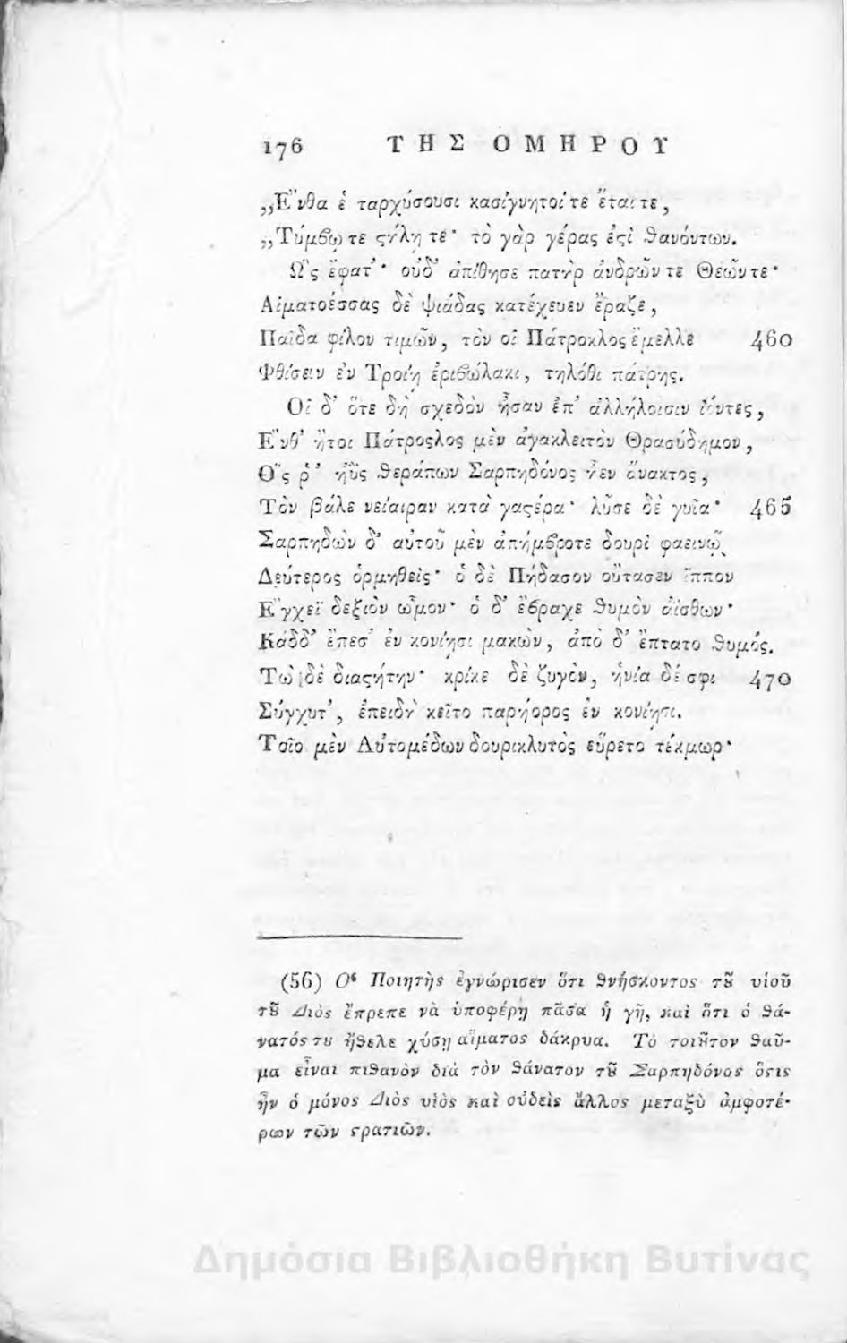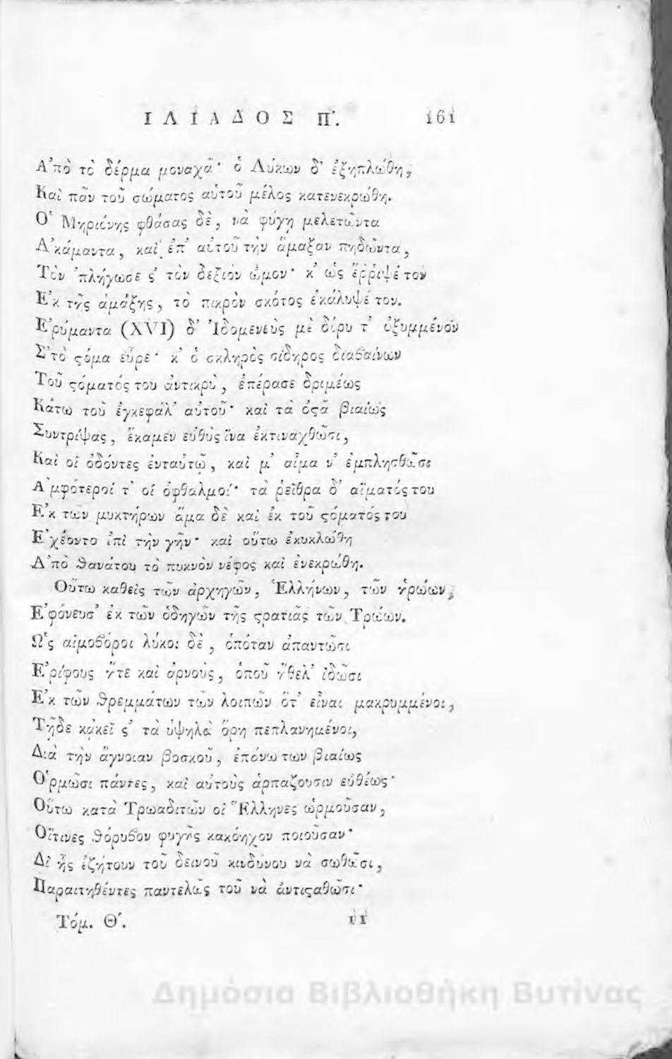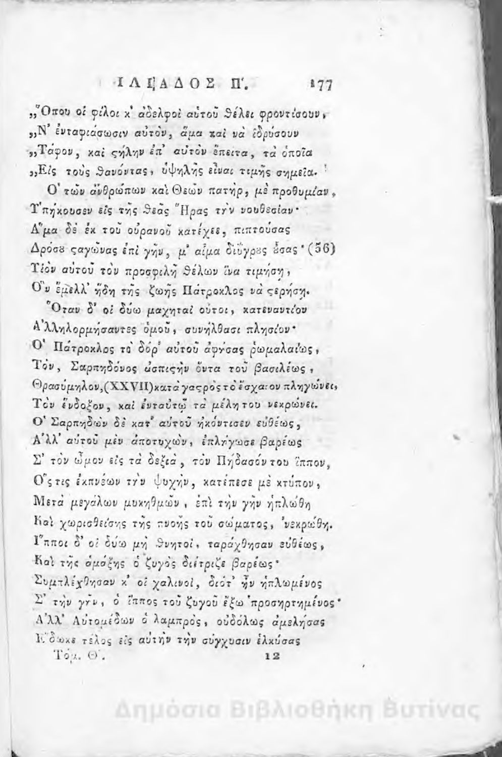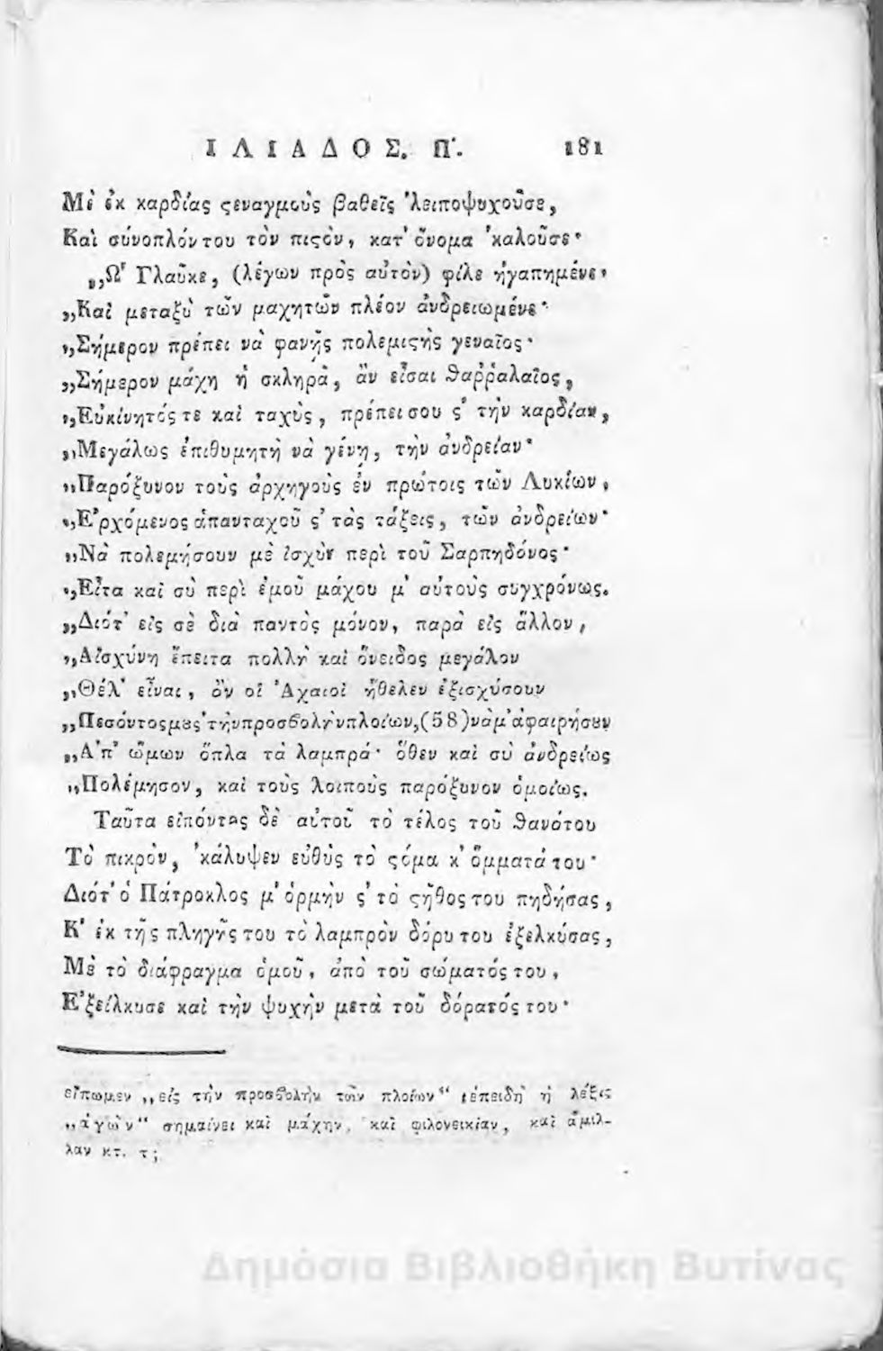 Ομήρου Ιλιάς : Παραφρασθείσα καί ομοιοκαταλήκτως στιχουργηθείσα μετά προσθήκης αναγκαίων καί επωφελών υποσημειώσεων καί αναρτήσεως της μυθολογίας, αλληγορίας καί αληθούς ιστορίας πάντων των εν αυτή εμπιπτόντων Θεών, ημιθέων και ένδόξων υποκειμένων προς χρήσιν της νεολαίας, και των προς κατάληψιν του ομηρικού καλάμου αδυνάτων