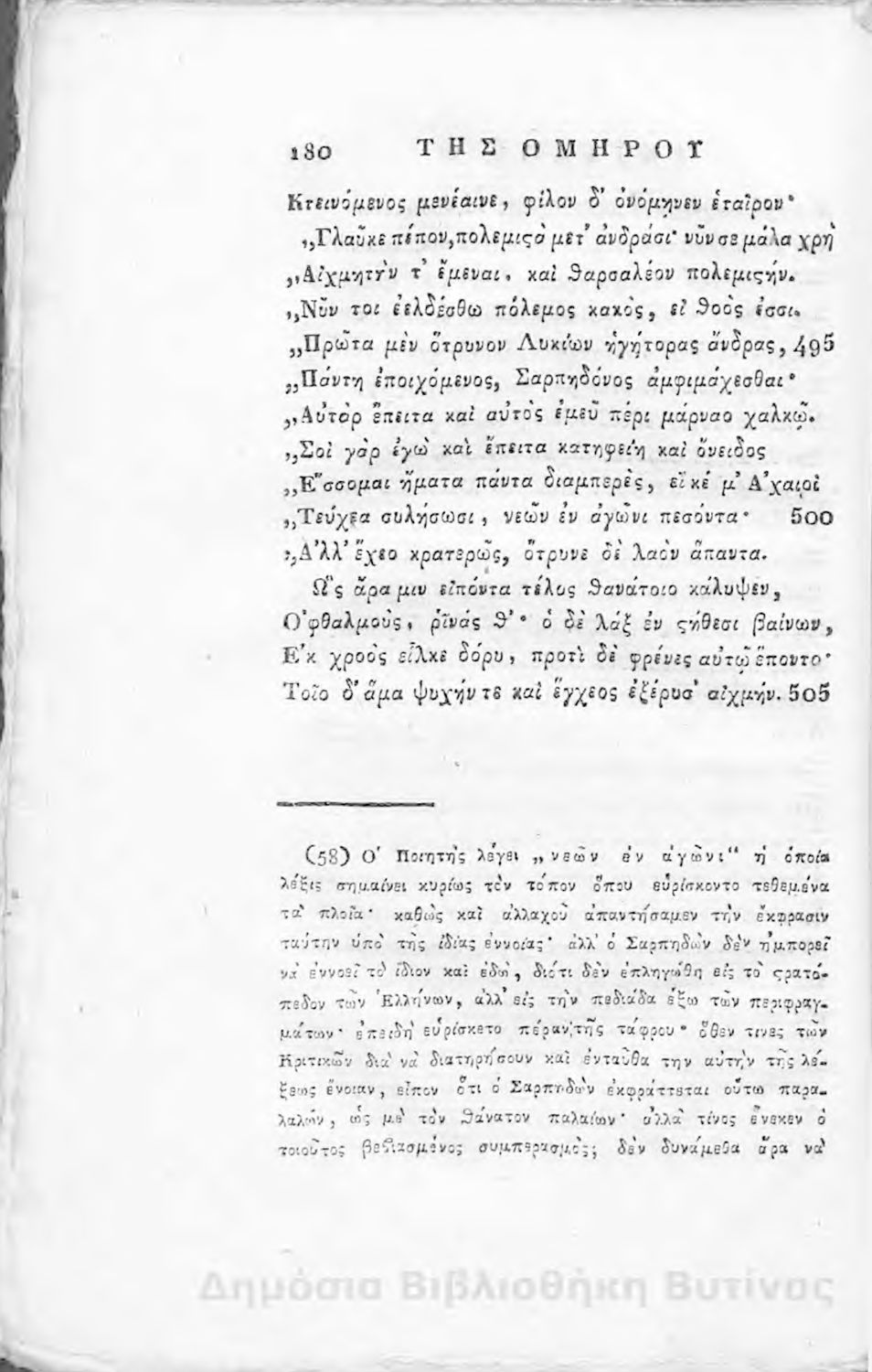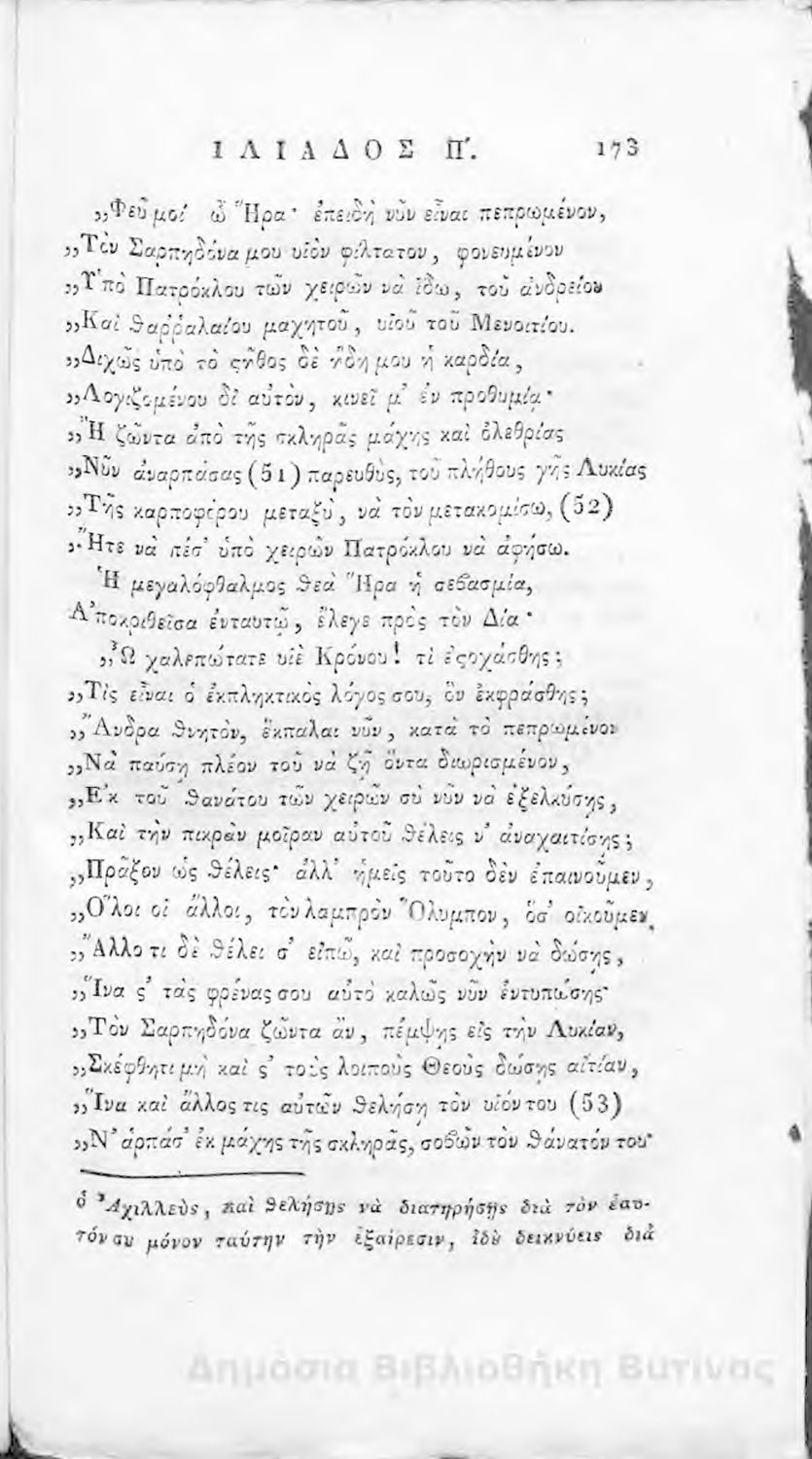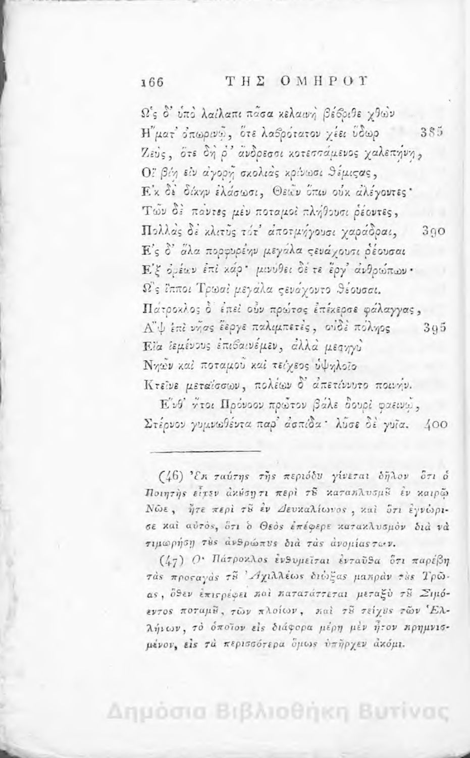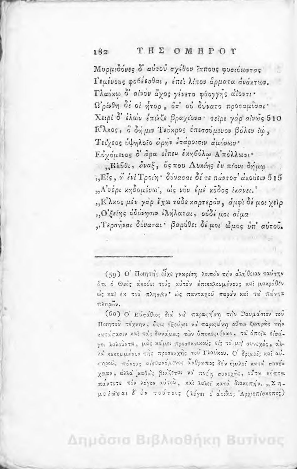 Ομήρου Ιλιάς : Παραφρασθείσα καί ομοιοκαταλήκτως στιχουργηθείσα μετά προσθήκης αναγκαίων καί επωφελών υποσημειώσεων καί αναρτήσεως της μυθολογίας, αλληγορίας καί αληθούς ιστορίας πάντων των εν αυτή εμπιπτόντων Θεών, ημιθέων και ένδόξων υποκειμένων προς χρήσιν της νεολαίας, και των προς κατάληψιν του ομηρικού καλάμου αδυνάτων