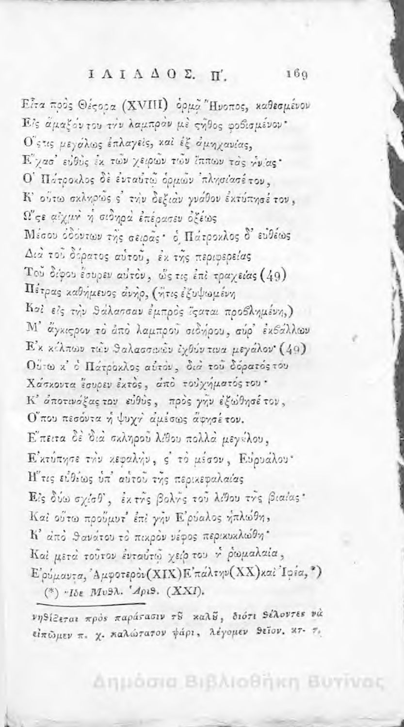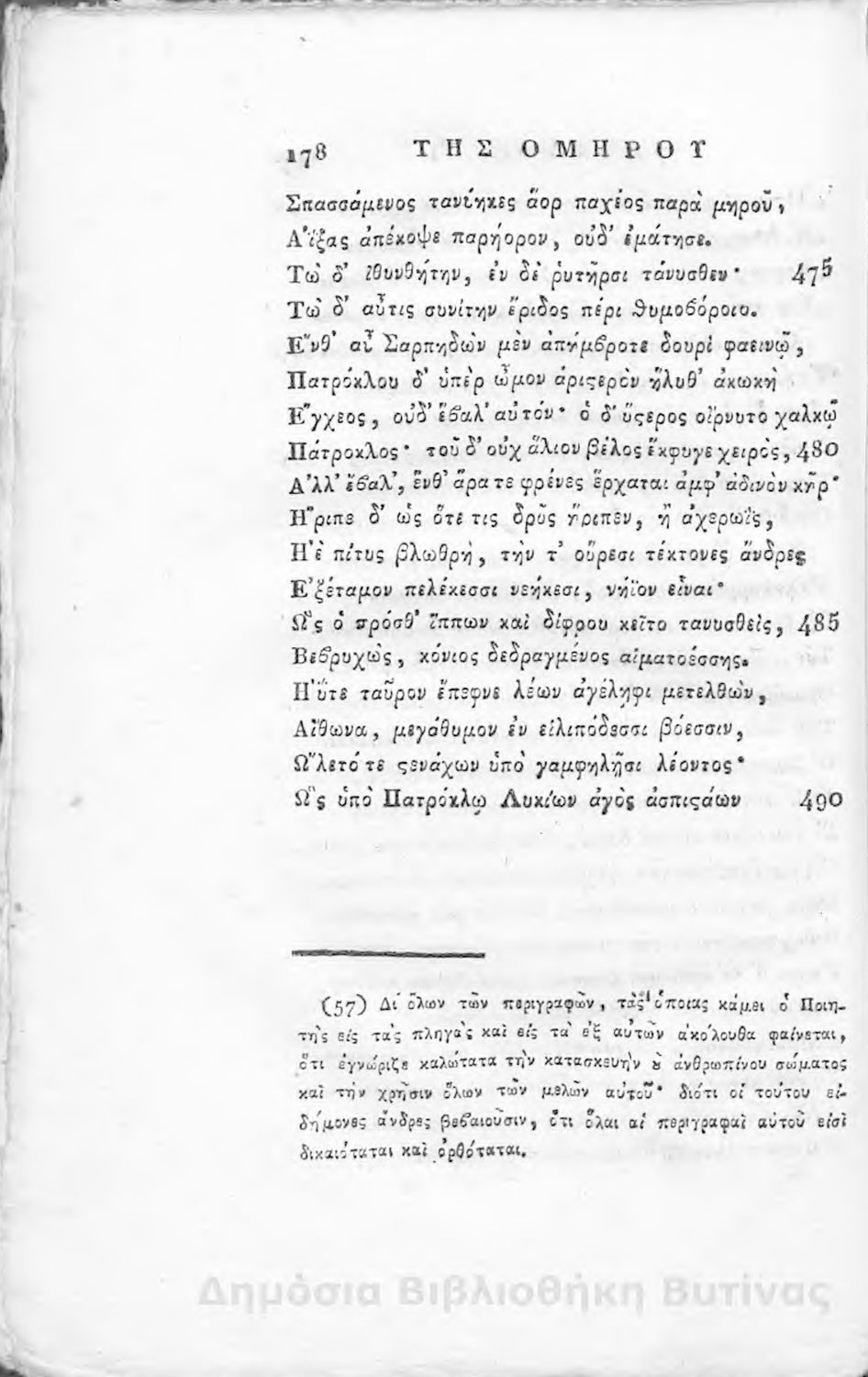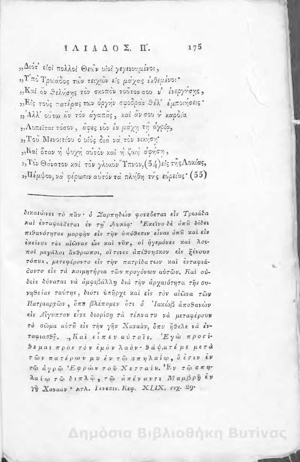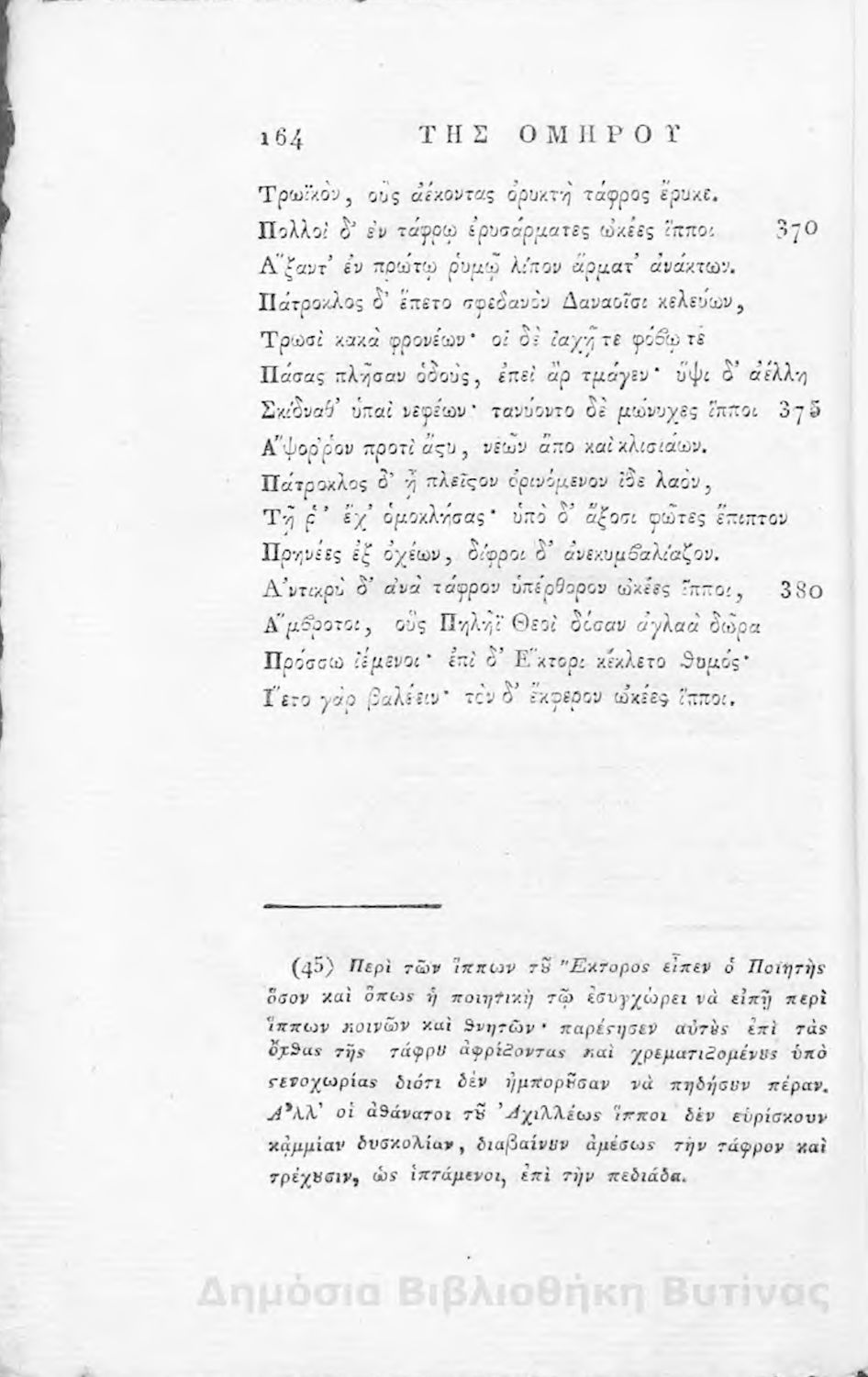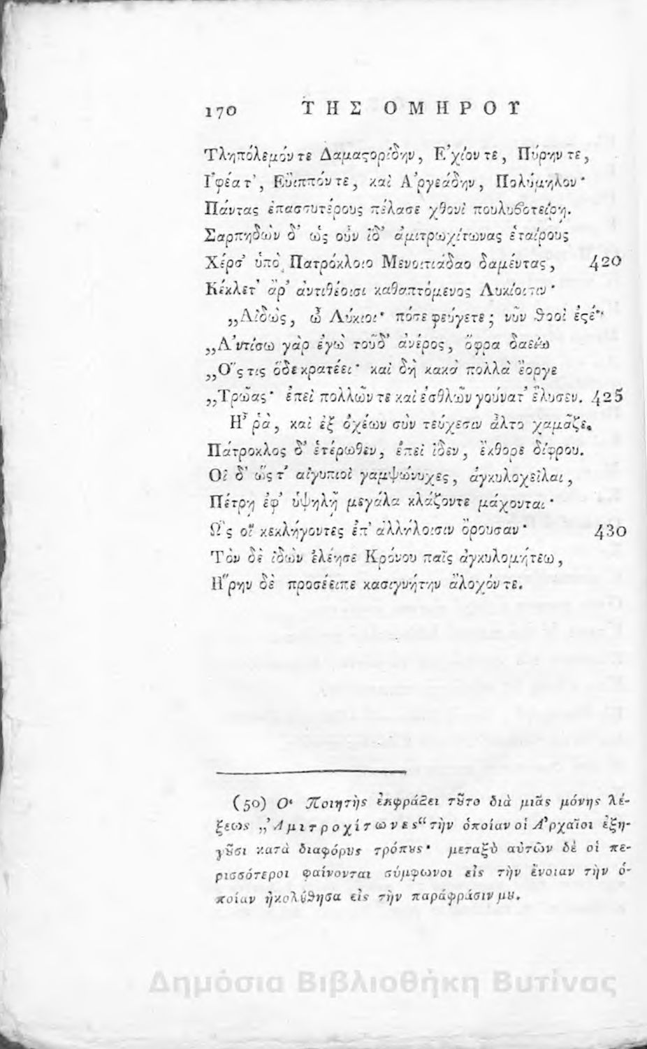 Ομήρου Ιλιάς : Παραφρασθείσα καί ομοιοκαταλήκτως στιχουργηθείσα μετά προσθήκης αναγκαίων καί επωφελών υποσημειώσεων καί αναρτήσεως της μυθολογίας, αλληγορίας καί αληθούς ιστορίας πάντων των εν αυτή εμπιπτόντων Θεών, ημιθέων και ένδόξων υποκειμένων προς χρήσιν της νεολαίας, και των προς κατάληψιν του ομηρικού καλάμου αδυνάτων