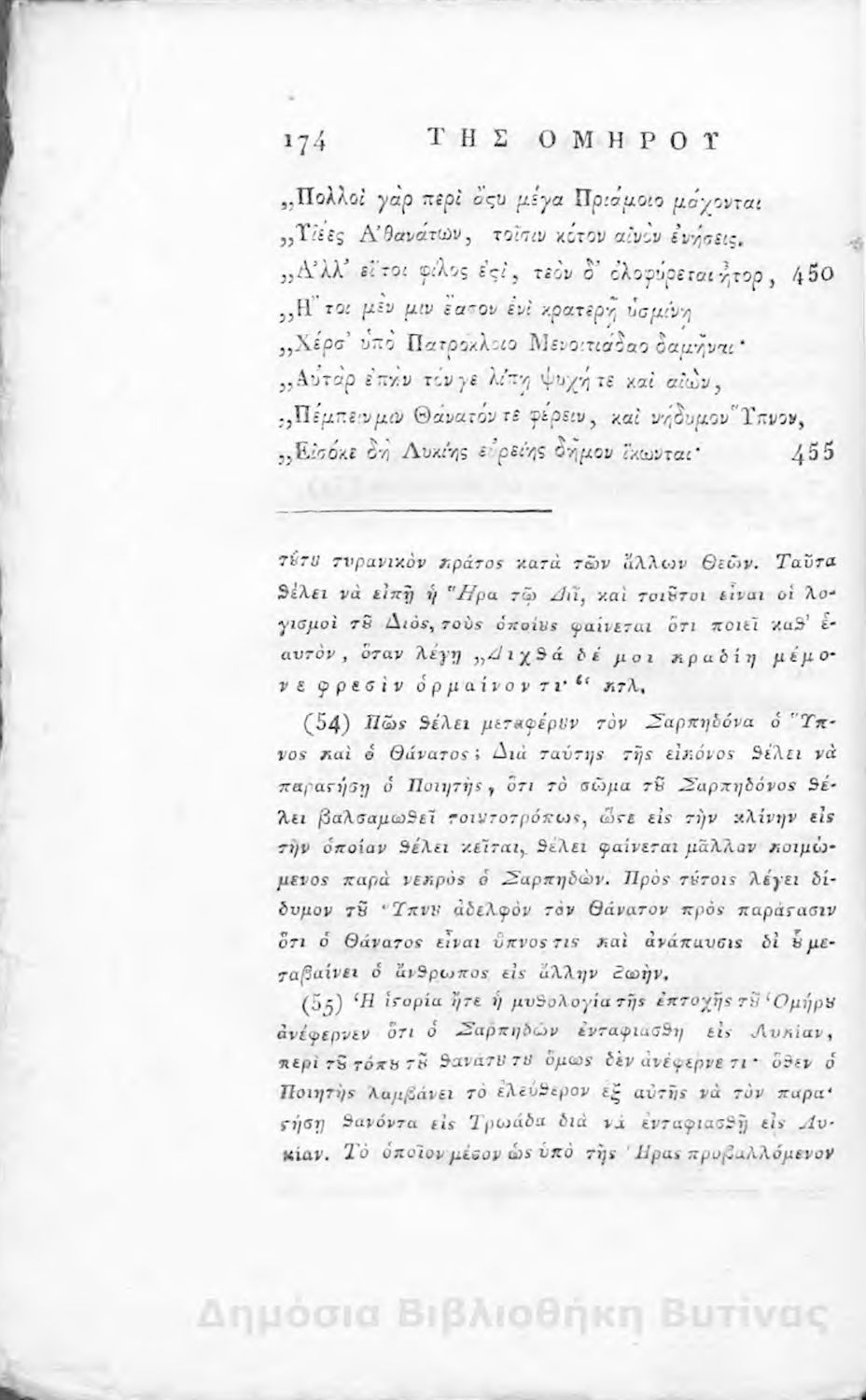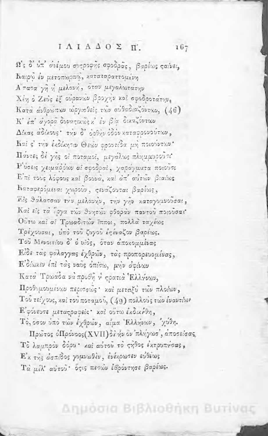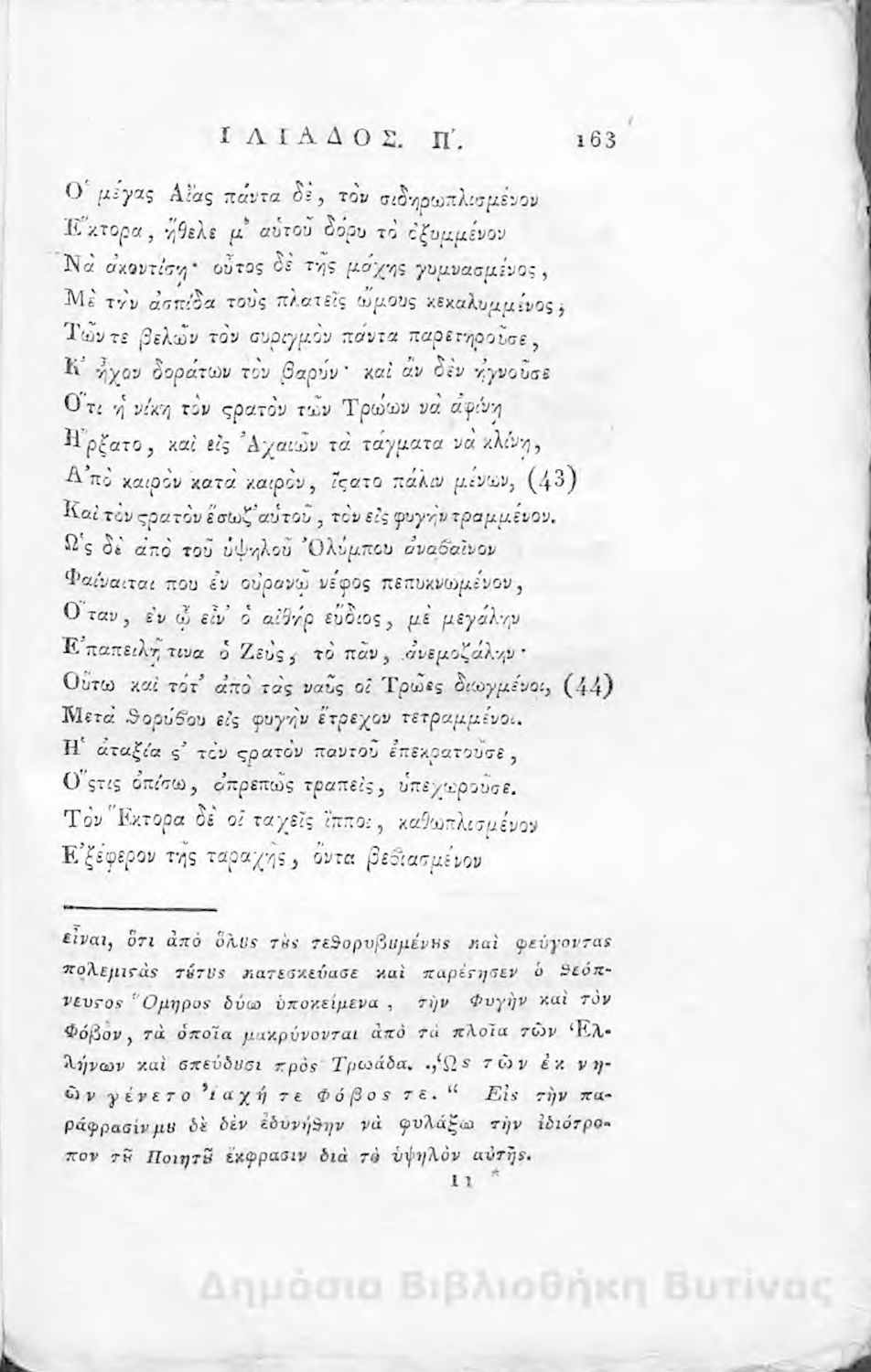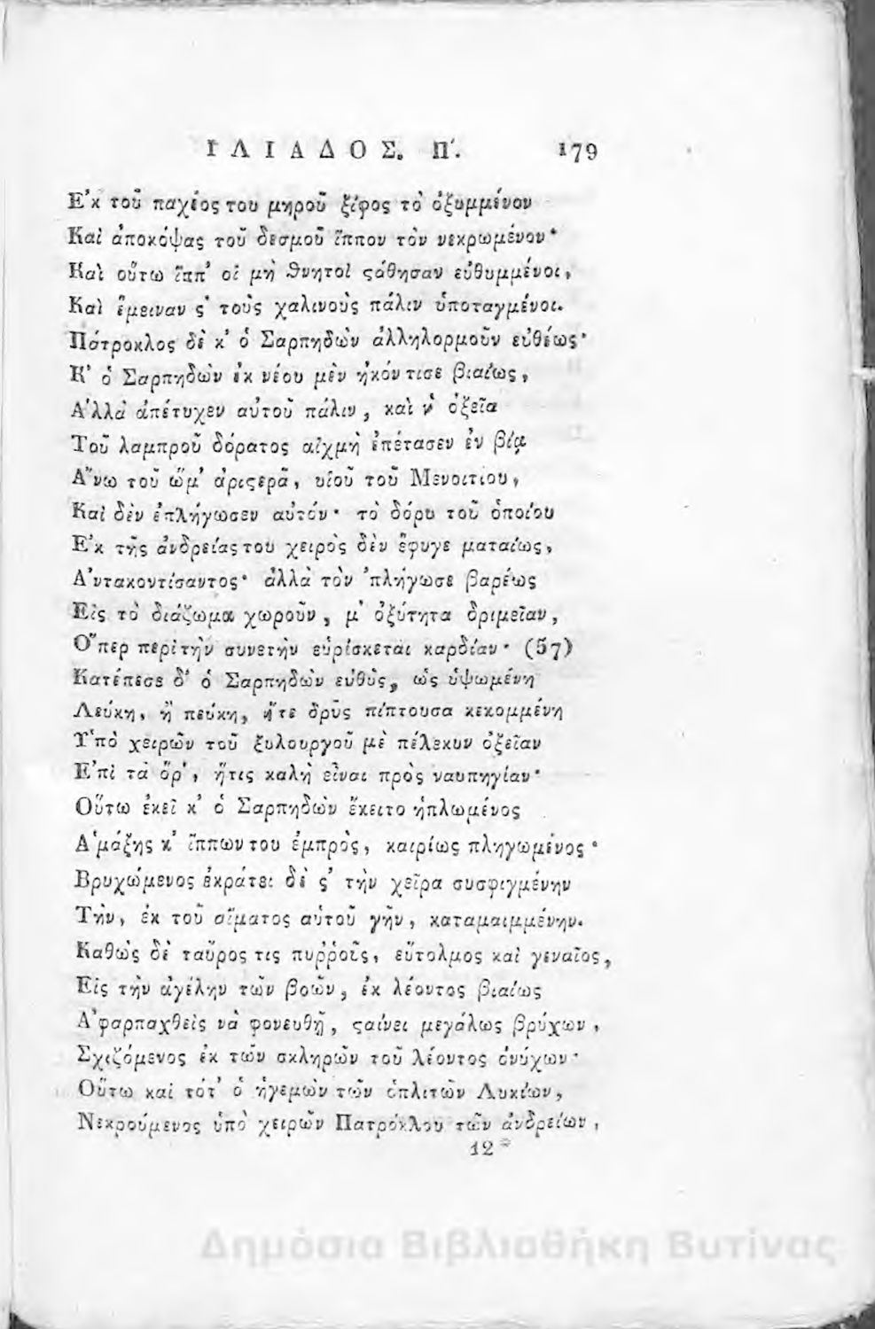 Τίτλος: Ομήρου Ιλιάς : Παραφρασθείσα καί ομοιοκαταλήκτως στιχουργηθείσα μετά προσθήκης αναγκαίων καί επωφελών υποσημειώσεων καί αναρτήσεως της μυθολογίας, αλληγορίας καί αληθούς ιστορίας πάντων των εν αυτή εμπιπτόντων Θεών, ημιθέων και ένδόξων υποκειμένων προς χρήσιν της νεολαίας, και των προς κατάληψιν του ομηρικού καλάμου αδυνάτων