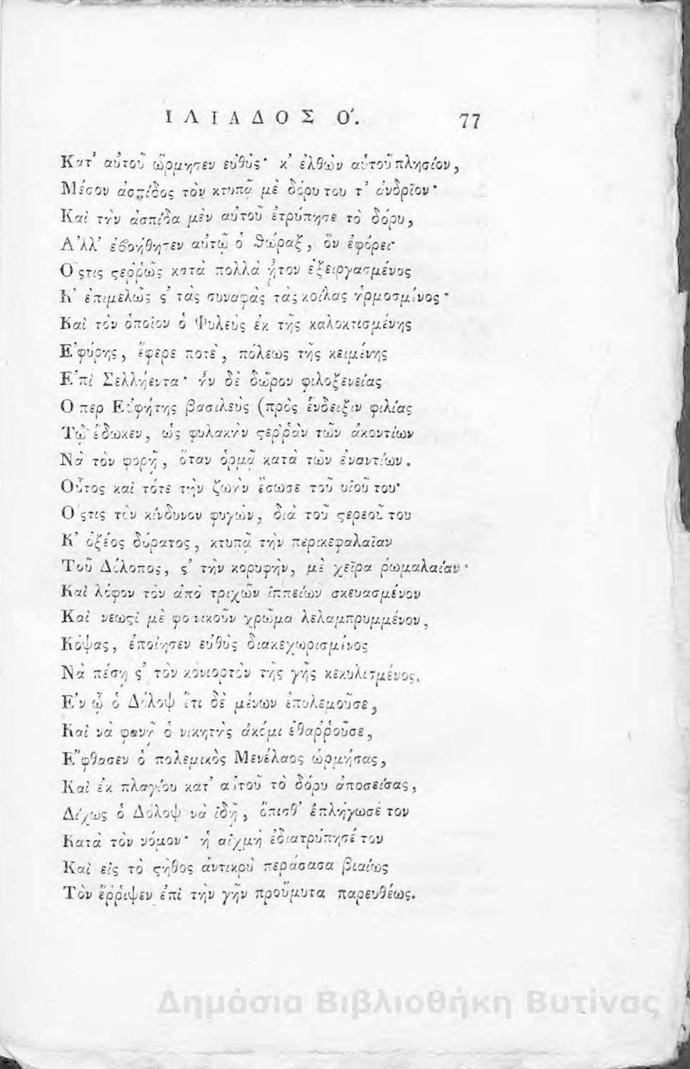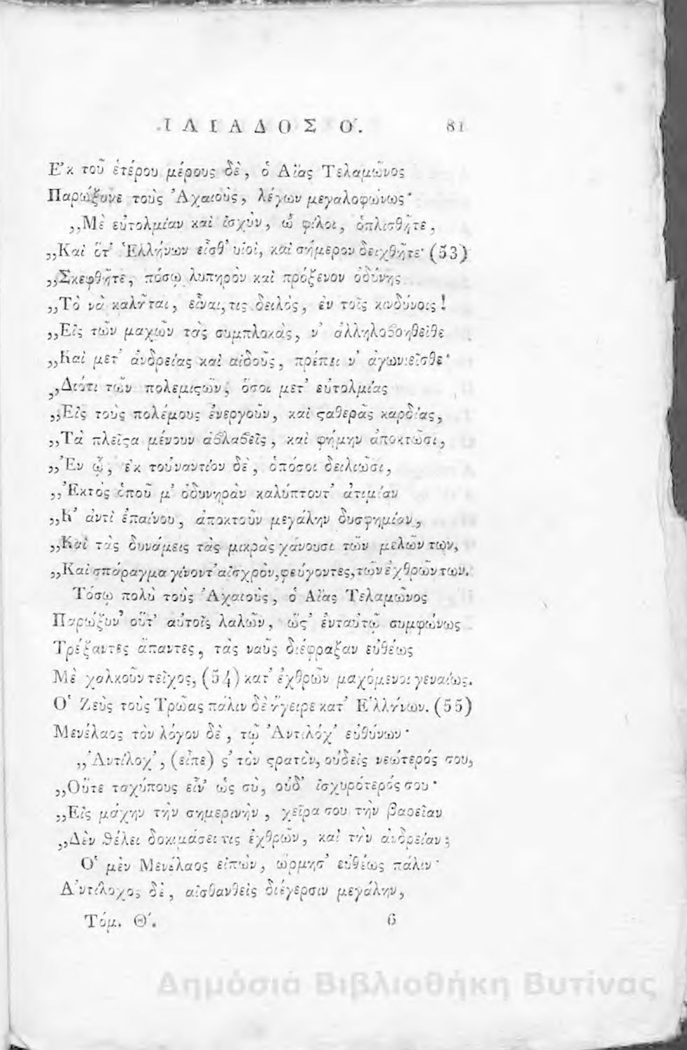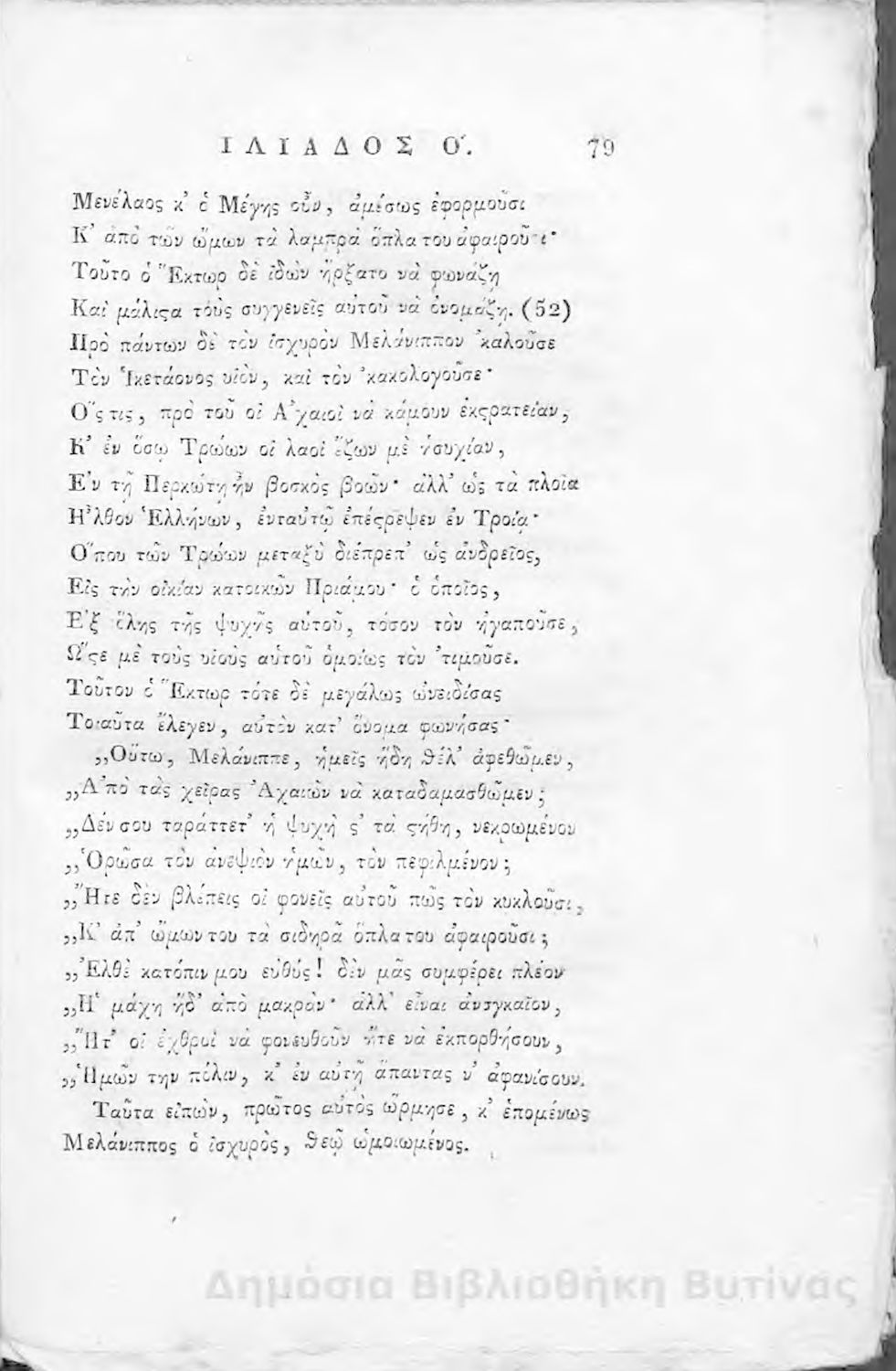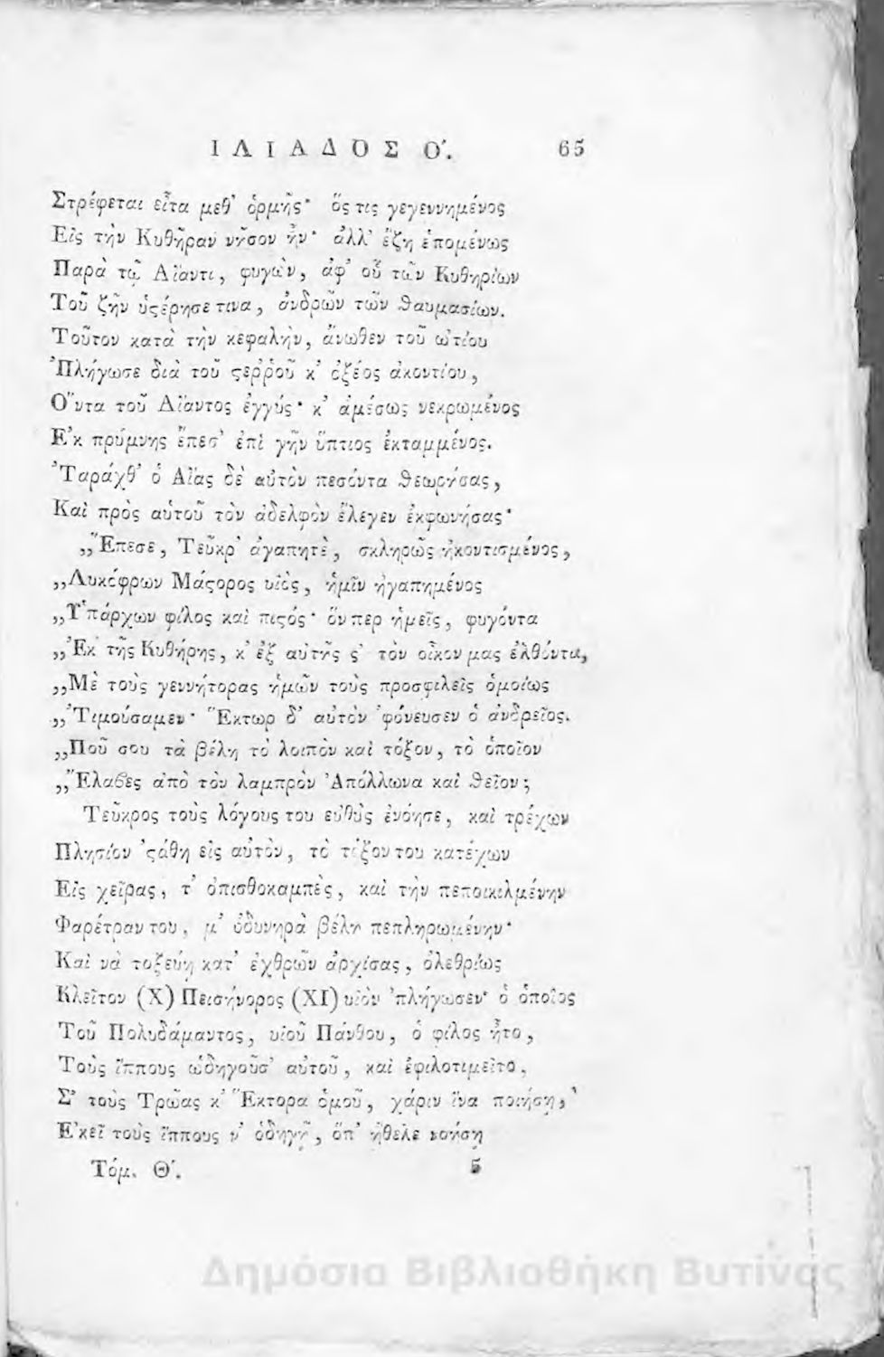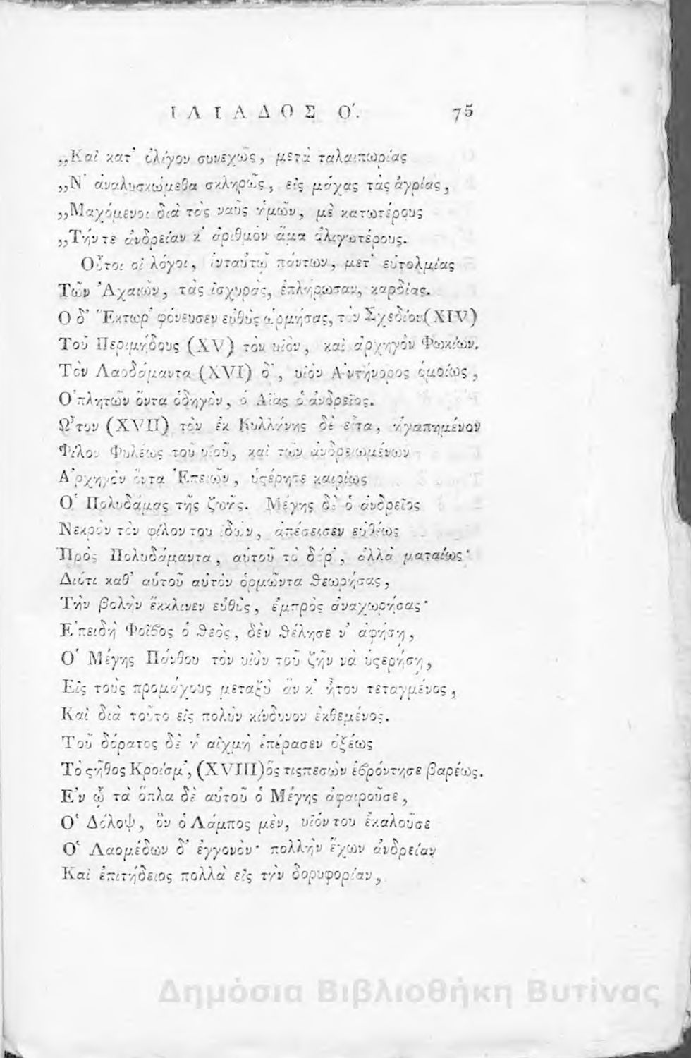 Ομήρου Ιλιάς : Παραφρασθείσα καί ομοιοκαταλήκτως στιχουργηθείσα μετά προσθήκης αναγκαίων καί επωφελών υποσημειώσεων καί αναρτήσεως της μυθολογίας, αλληγορίας καί αληθούς ιστορίας πάντων των εν αυτή εμπιπτόντων Θεών, ημιθέων και ένδόξων υποκειμένων προς χρήσιν της νεολαίας, και των προς κατάληψιν του ομηρικού καλάμου αδυνάτων