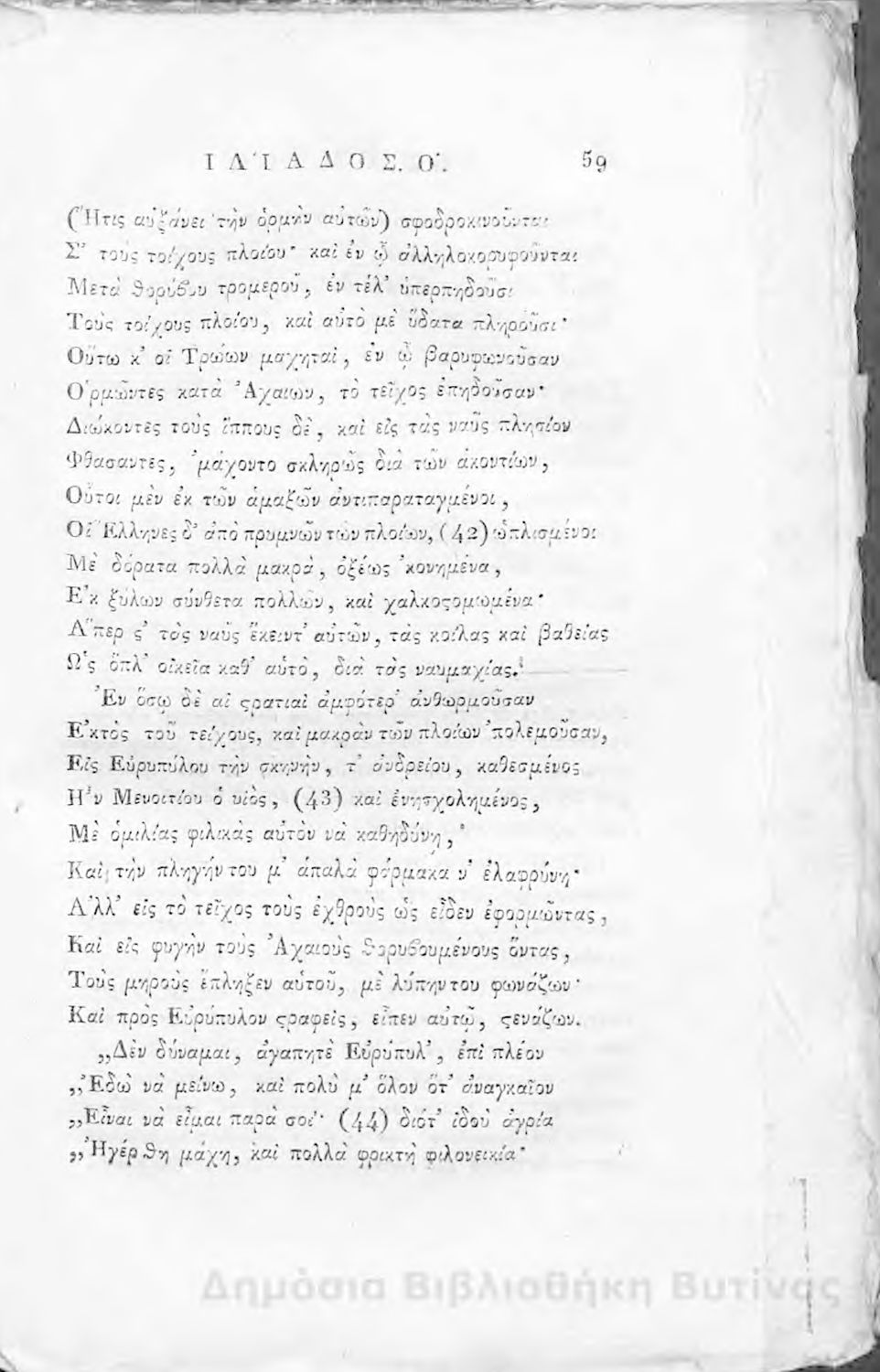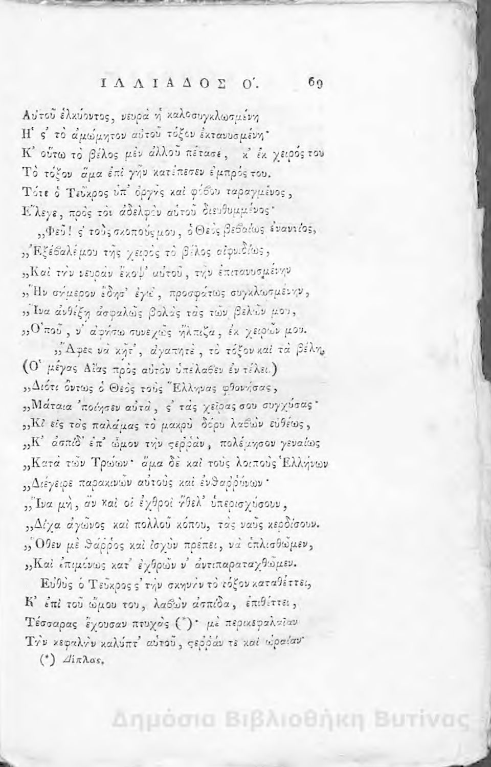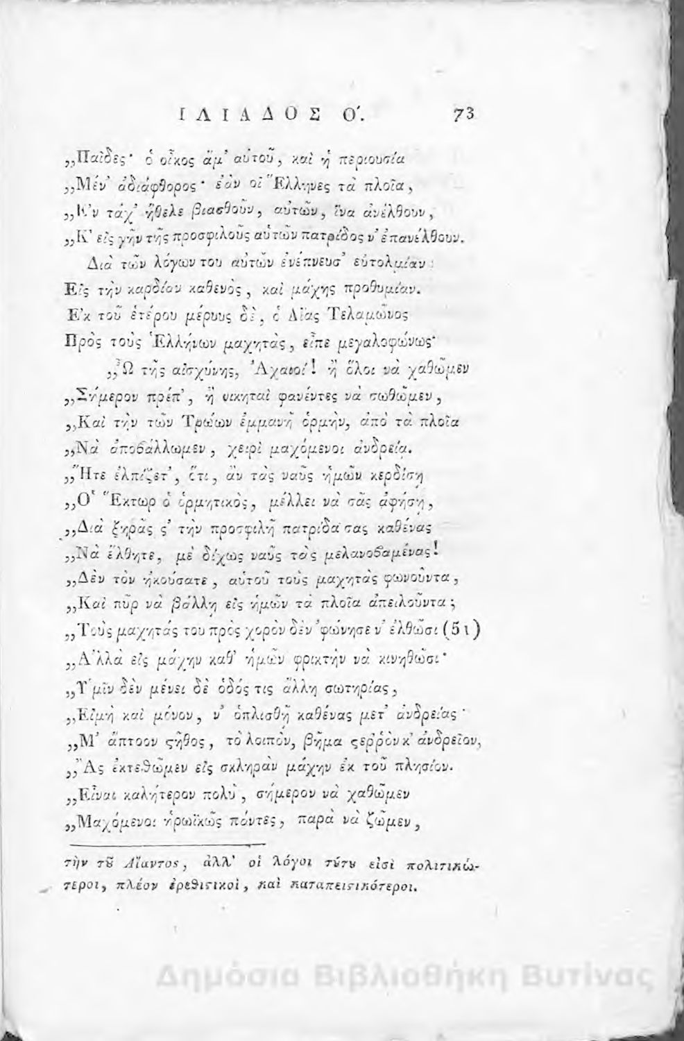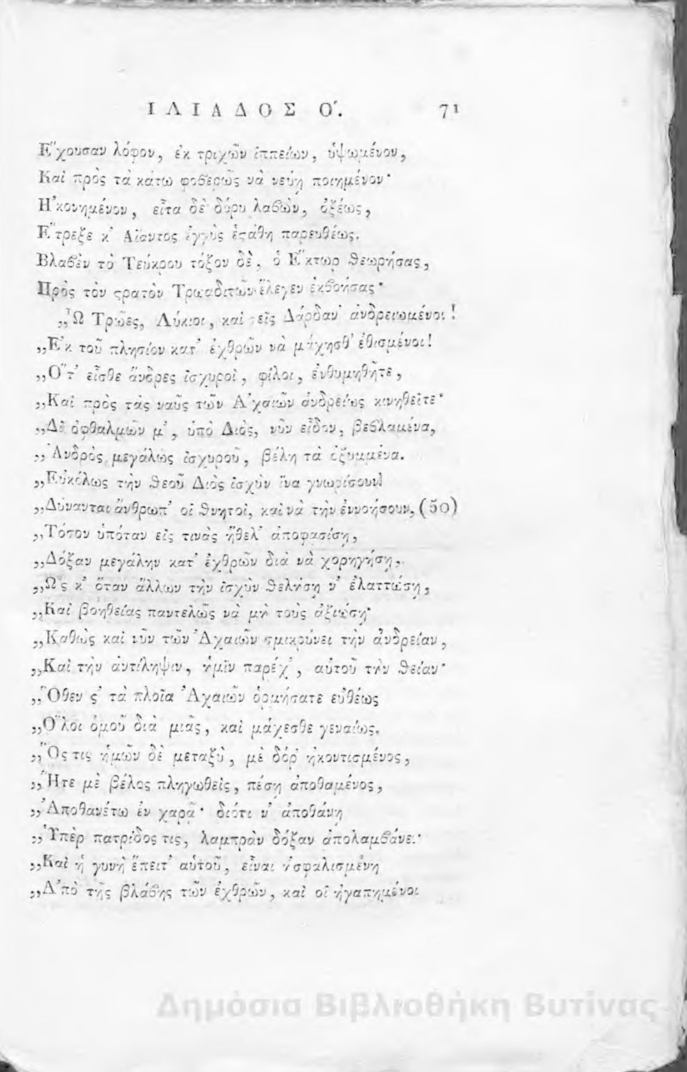 Ομήρου Ιλιάς : Παραφρασθείσα καί ομοιοκαταλήκτως στιχουργηθείσα μετά προσθήκης αναγκαίων καί επωφελών υποσημειώσεων καί αναρτήσεως της μυθολογίας, αλληγορίας καί αληθούς ιστορίας πάντων των εν αυτή εμπιπτόντων Θεών, ημιθέων και ένδόξων υποκειμένων προς χρήσιν της νεολαίας, και των προς κατάληψιν του ομηρικού καλάμου αδυνάτων