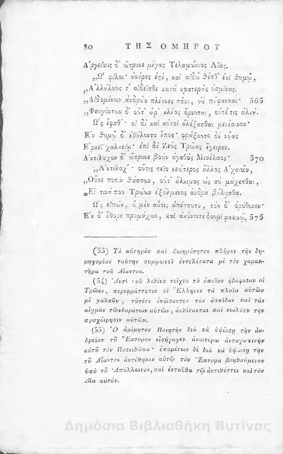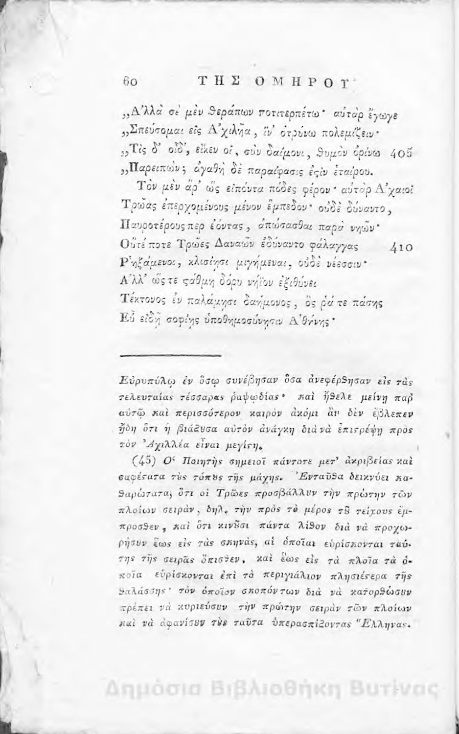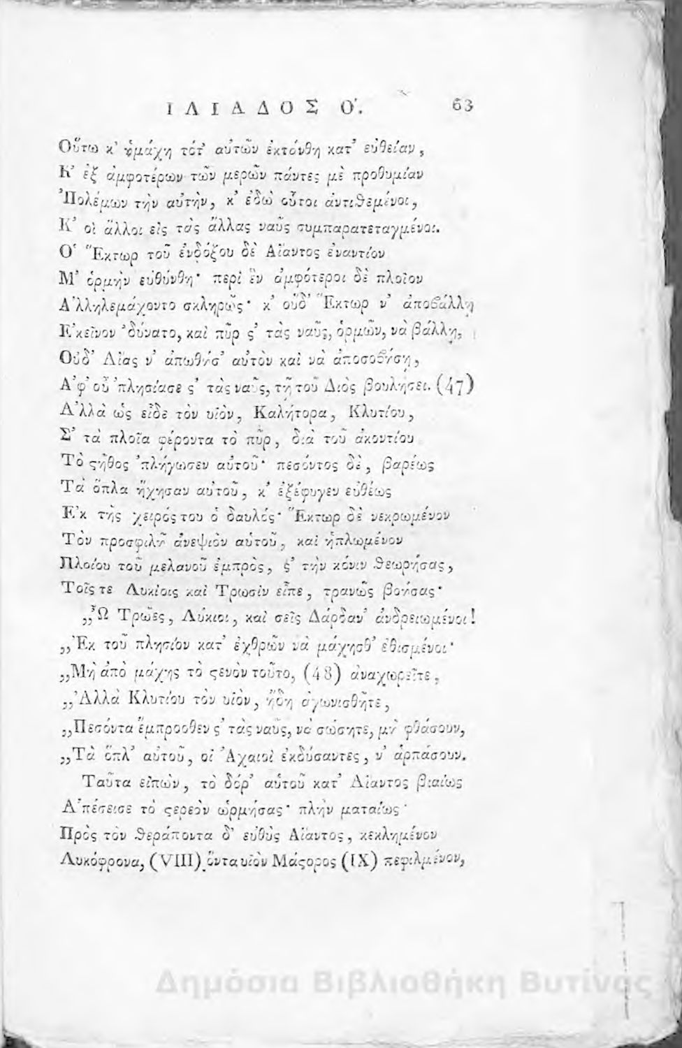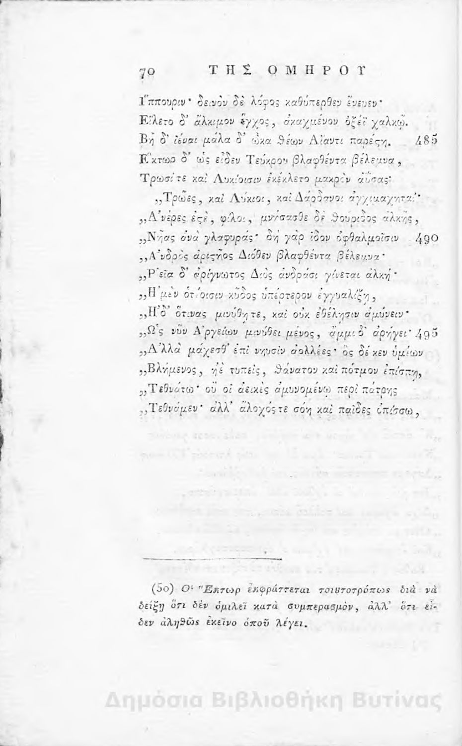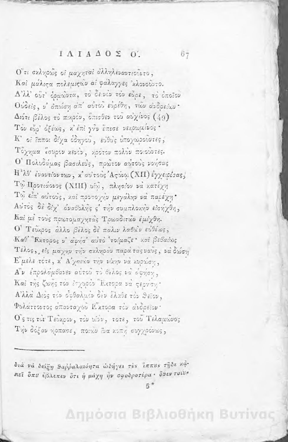Ομήρου Ιλιάς : Παραφρασθείσα καί ομοιοκαταλήκτως στιχουργηθείσα μετά προσθήκης αναγκαίων καί επωφελών υποσημειώσεων καί αναρτήσεως της μυθολογίας, αλληγορίας καί αληθούς ιστορίας πάντων των εν αυτή εμπιπτόντων Θεών, ημιθέων και ένδόξων υποκειμένων προς χρήσιν της νεολαίας, και των προς κατάληψιν του ομηρικού καλάμου αδυνάτων