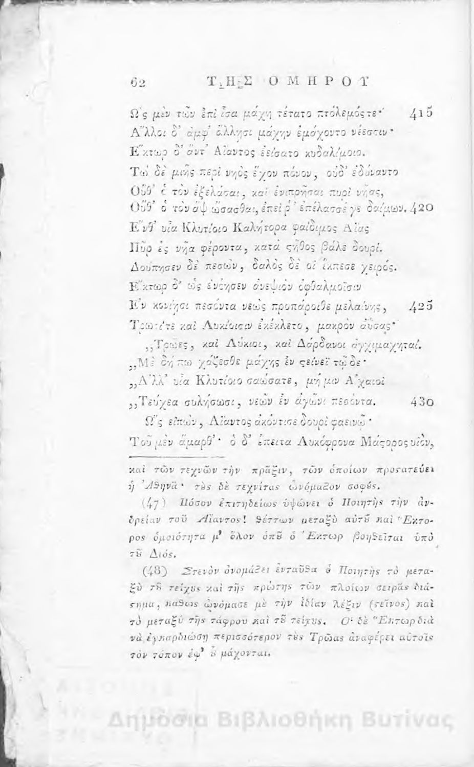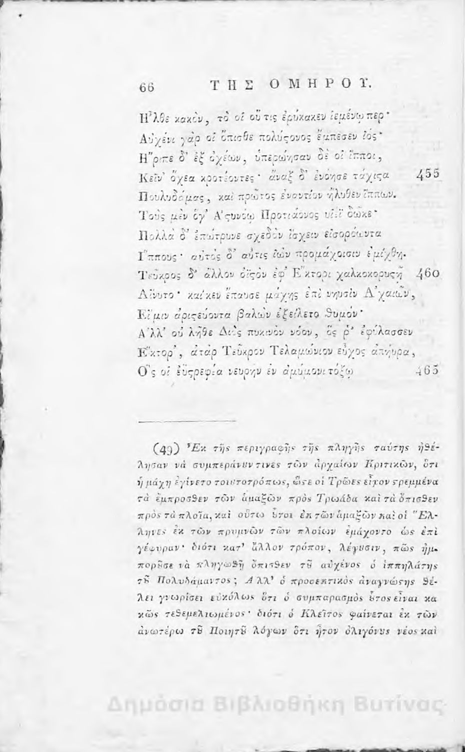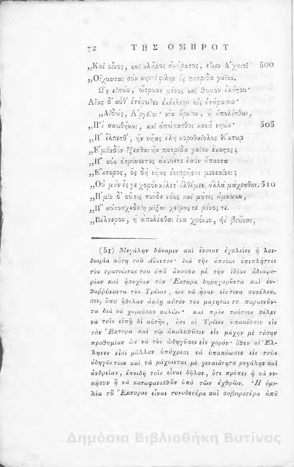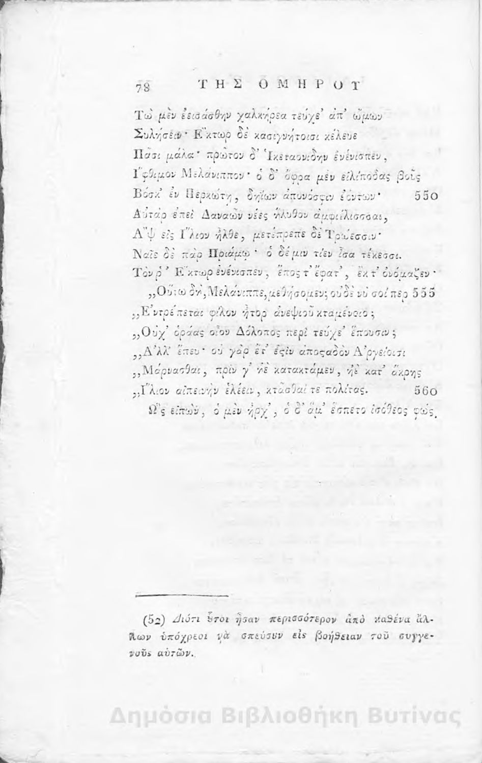 Ομήρου Ιλιάς : Παραφρασθείσα καί ομοιοκαταλήκτως στιχουργηθείσα μετά προσθήκης αναγκαίων καί επωφελών υποσημειώσεων καί αναρτήσεως της μυθολογίας, αλληγορίας καί αληθούς ιστορίας πάντων των εν αυτή εμπιπτόντων Θεών, ημιθέων και ένδόξων υποκειμένων προς χρήσιν της νεολαίας, και των προς κατάληψιν του ομηρικού καλάμου αδυνάτων