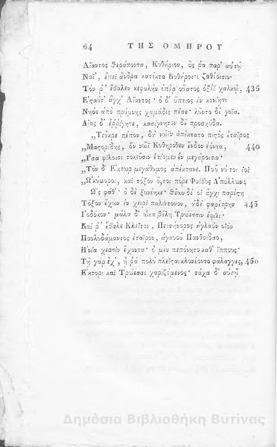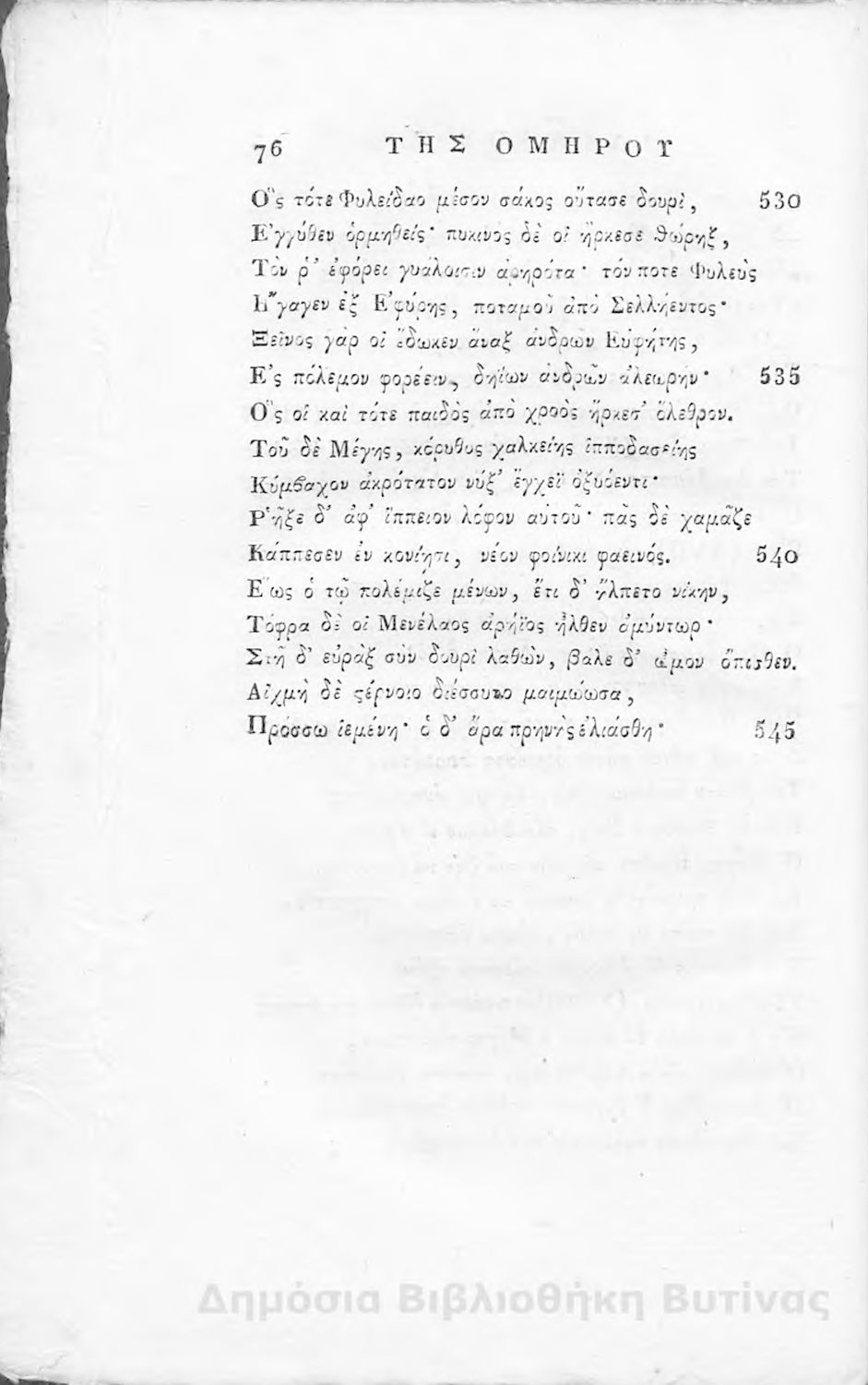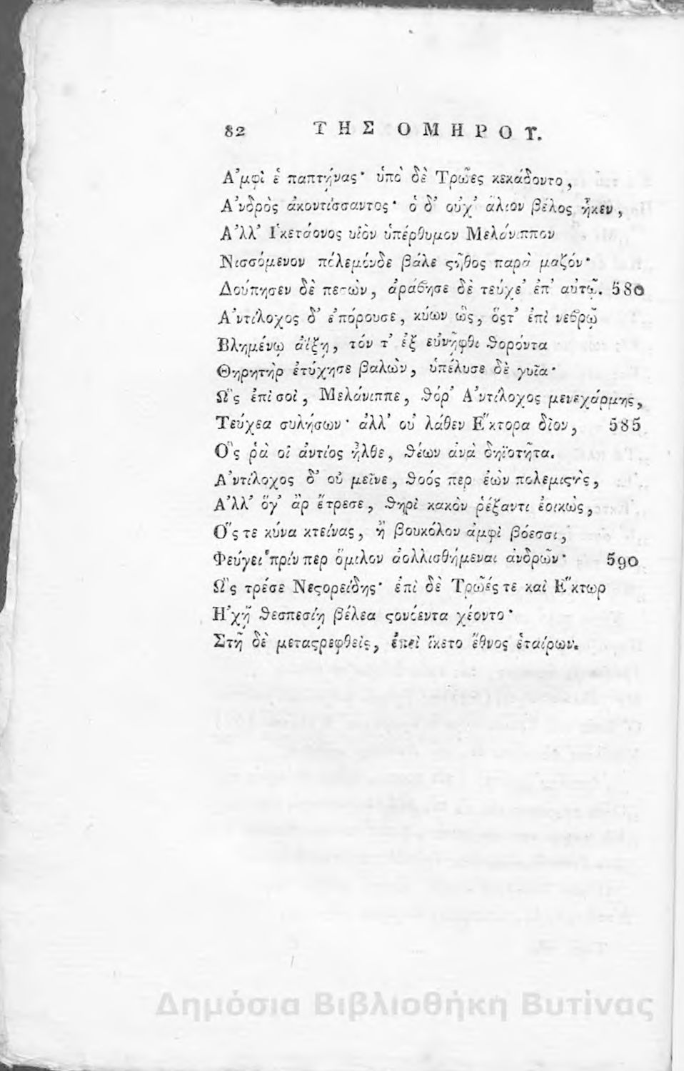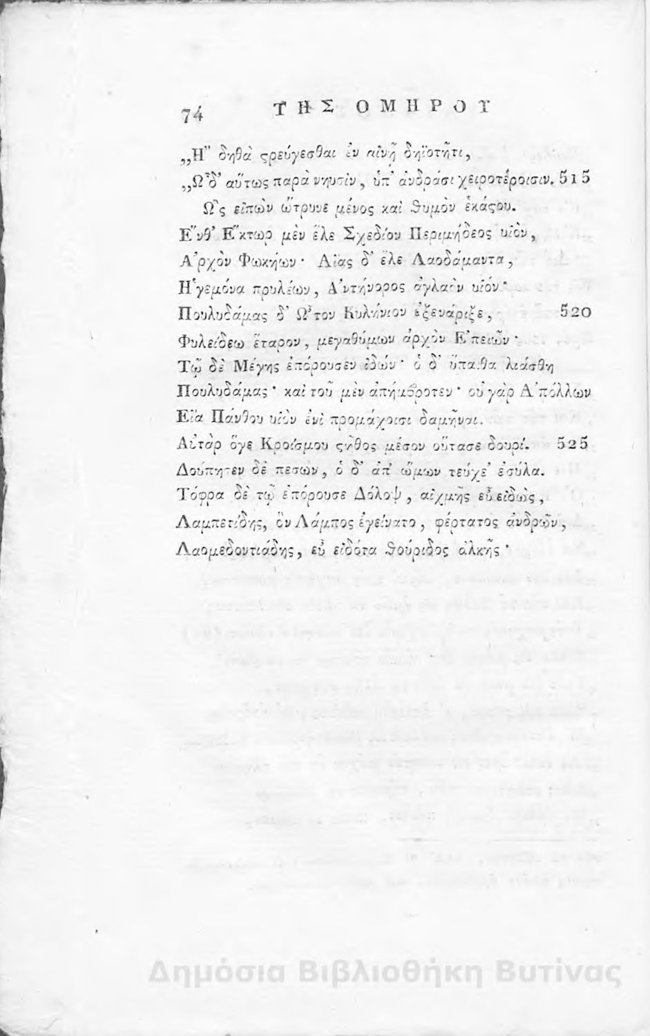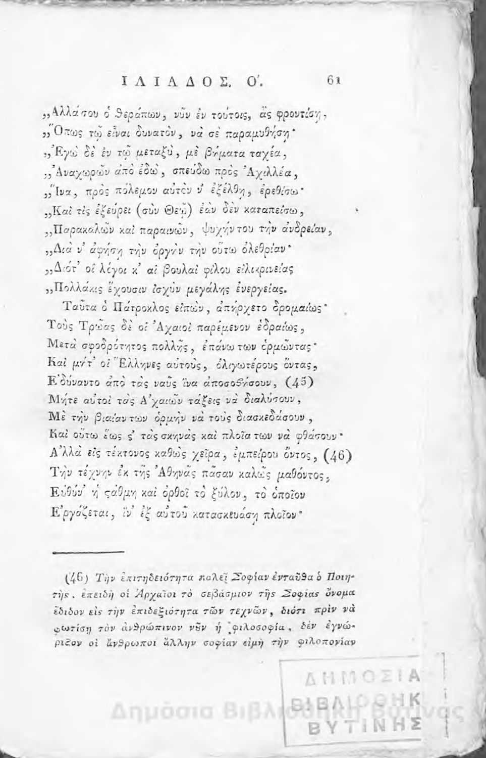 Ομήρου Ιλιάς : Παραφρασθείσα καί ομοιοκαταλήκτως στιχουργηθείσα μετά προσθήκης αναγκαίων καί επωφελών υποσημειώσεων καί αναρτήσεως της μυθολογίας, αλληγορίας καί αληθούς ιστορίας πάντων των εν αυτή εμπιπτόντων Θεών, ημιθέων και ένδόξων υποκειμένων προς χρήσιν της νεολαίας, και των προς κατάληψιν του ομηρικού καλάμου αδυνάτων