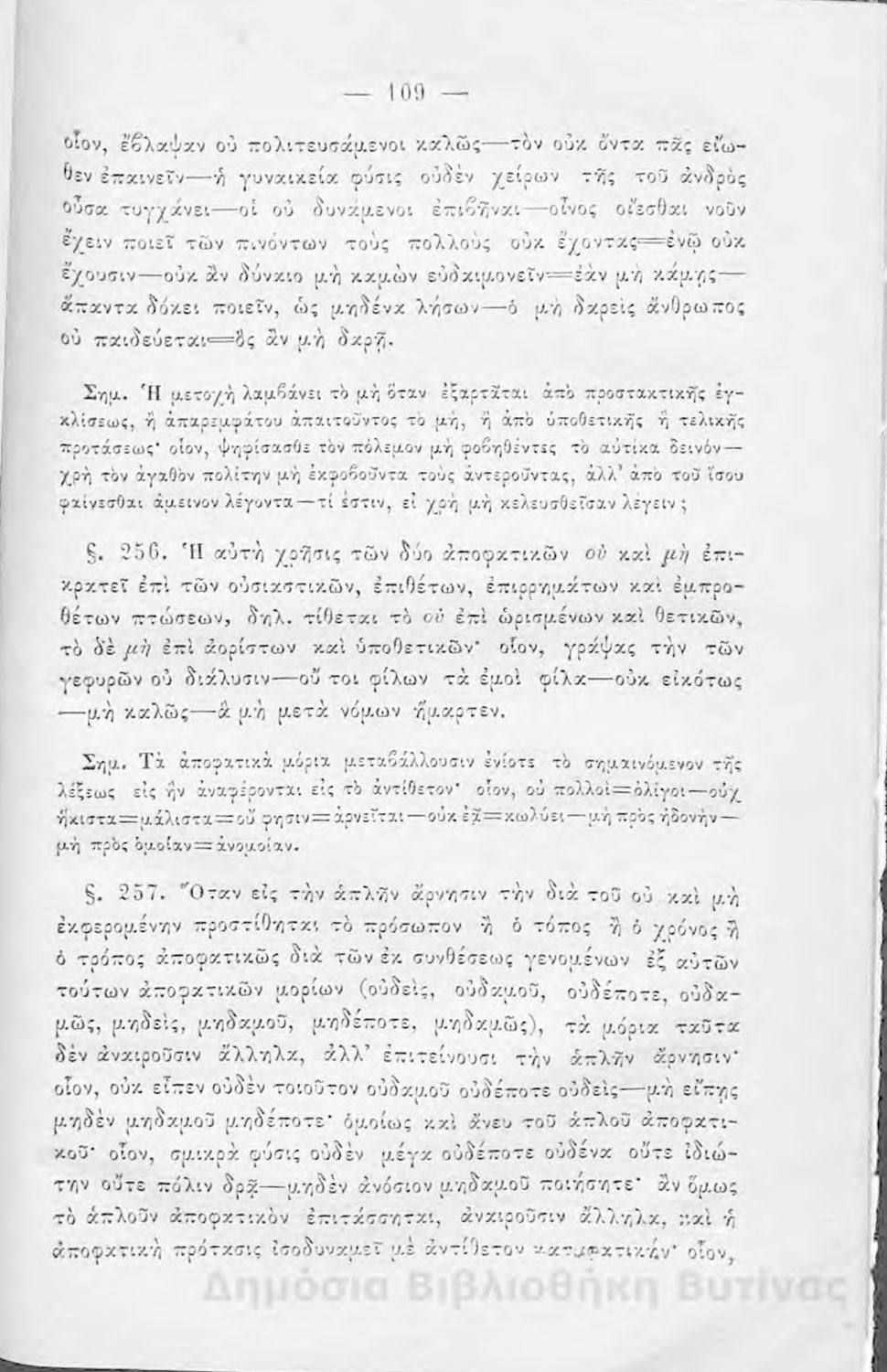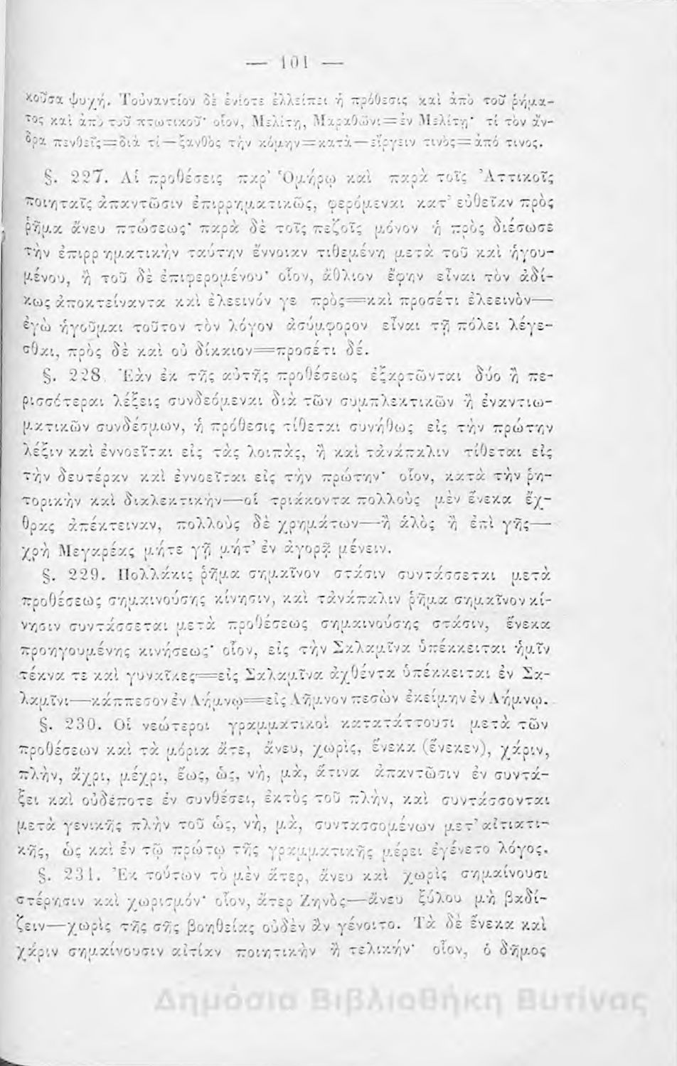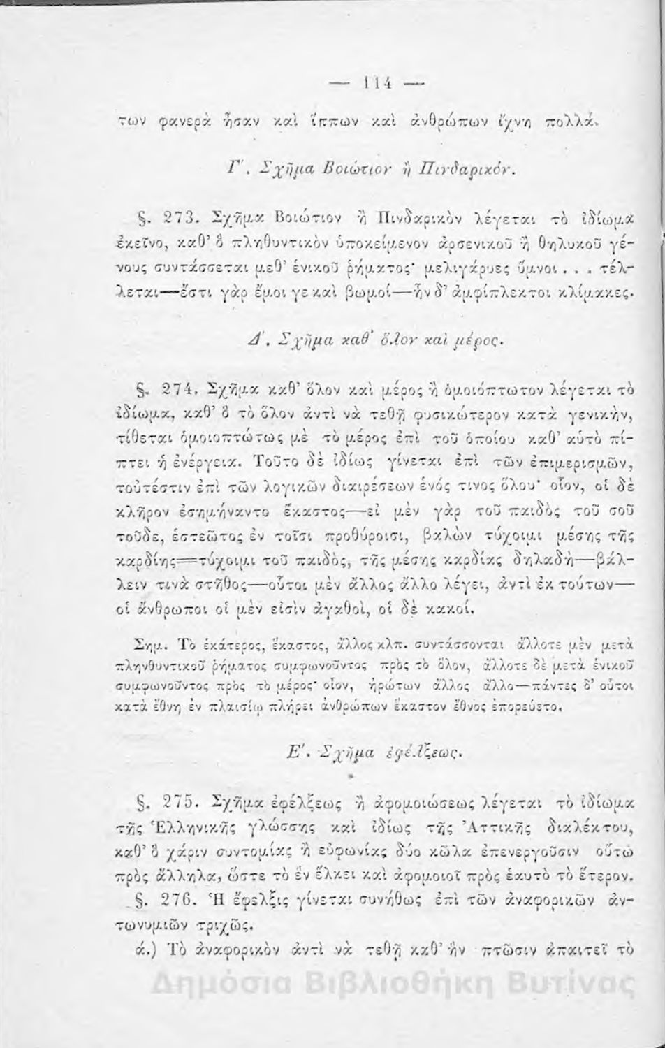 Σχολικό εγχειρίδιο Αρχαίων Ελληνικών για τους μαθητές των Ελληνικών Σχολείων και Παρθεναγωγείων που εξετάζει τα μέρη του λόγου και την σύνταξή τους.