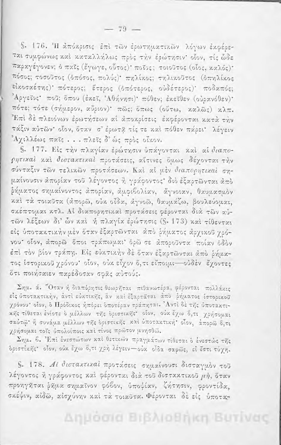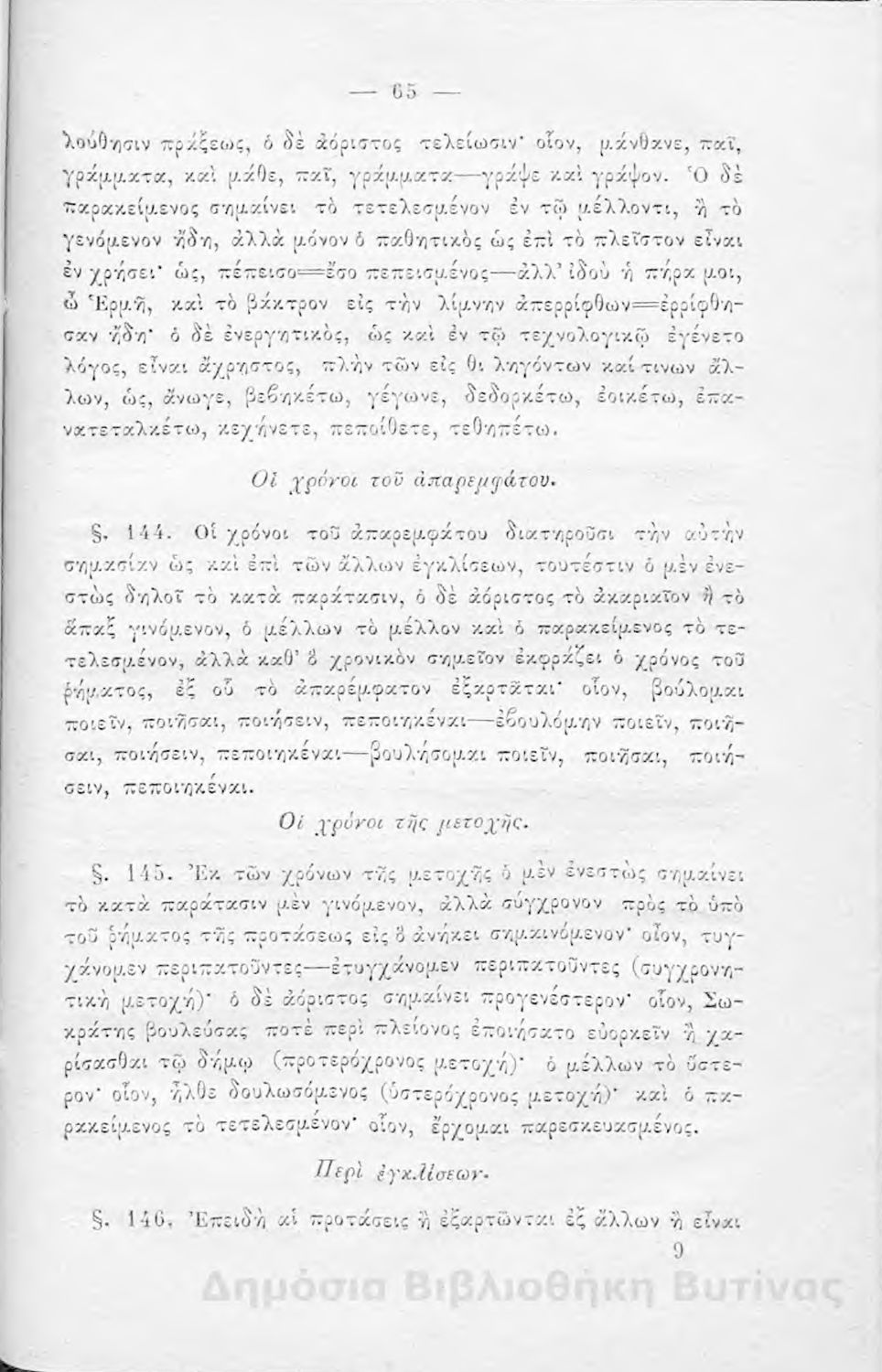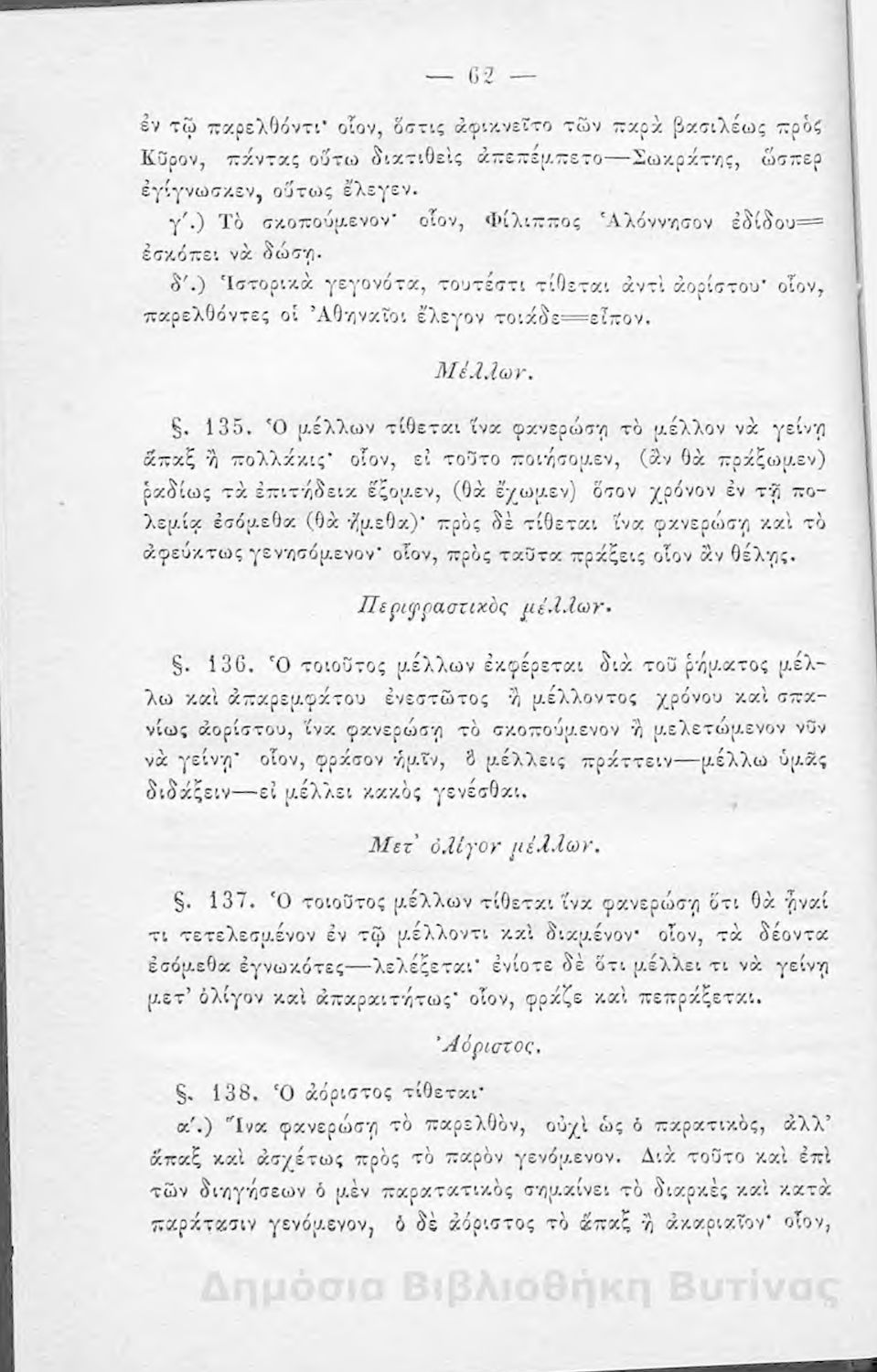 Σχολικό εγχειρίδιο Αρχαίων Ελληνικών για τους μαθητές των Ελληνικών Σχολείων και Παρθεναγωγείων που εξετάζει τα μέρη του λόγου και την σύνταξή τους.