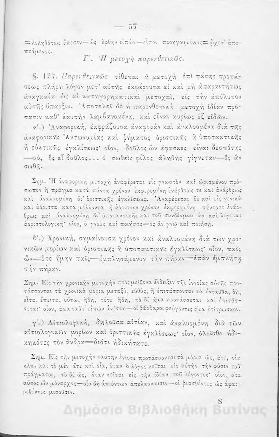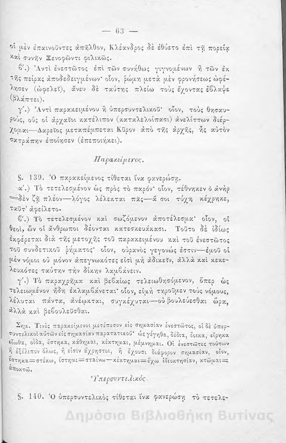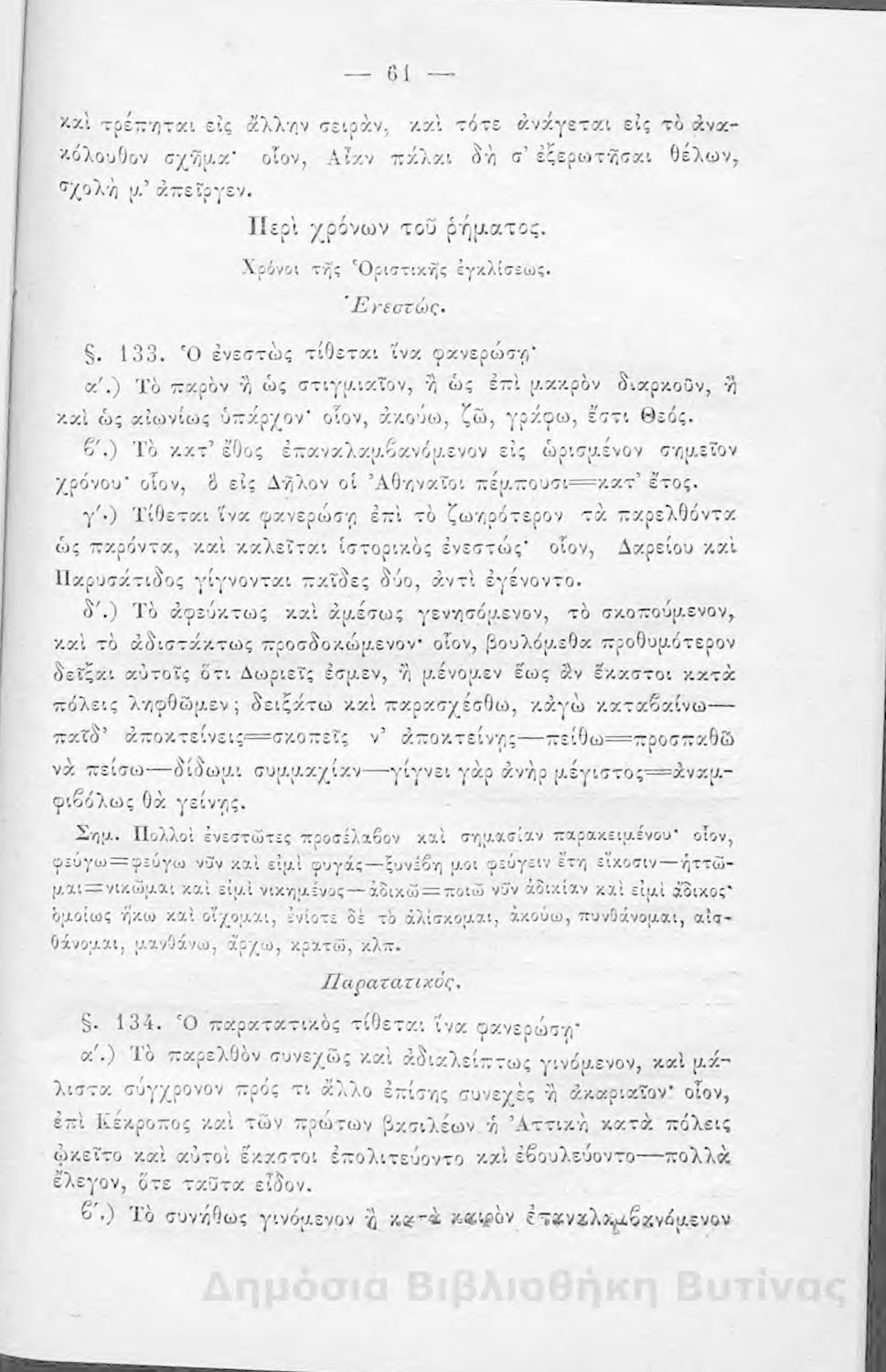 Σχολικό εγχειρίδιο Αρχαίων Ελληνικών για τους μαθητές των Ελληνικών Σχολείων και Παρθεναγωγείων που εξετάζει τα μέρη του λόγου και την σύνταξή τους.