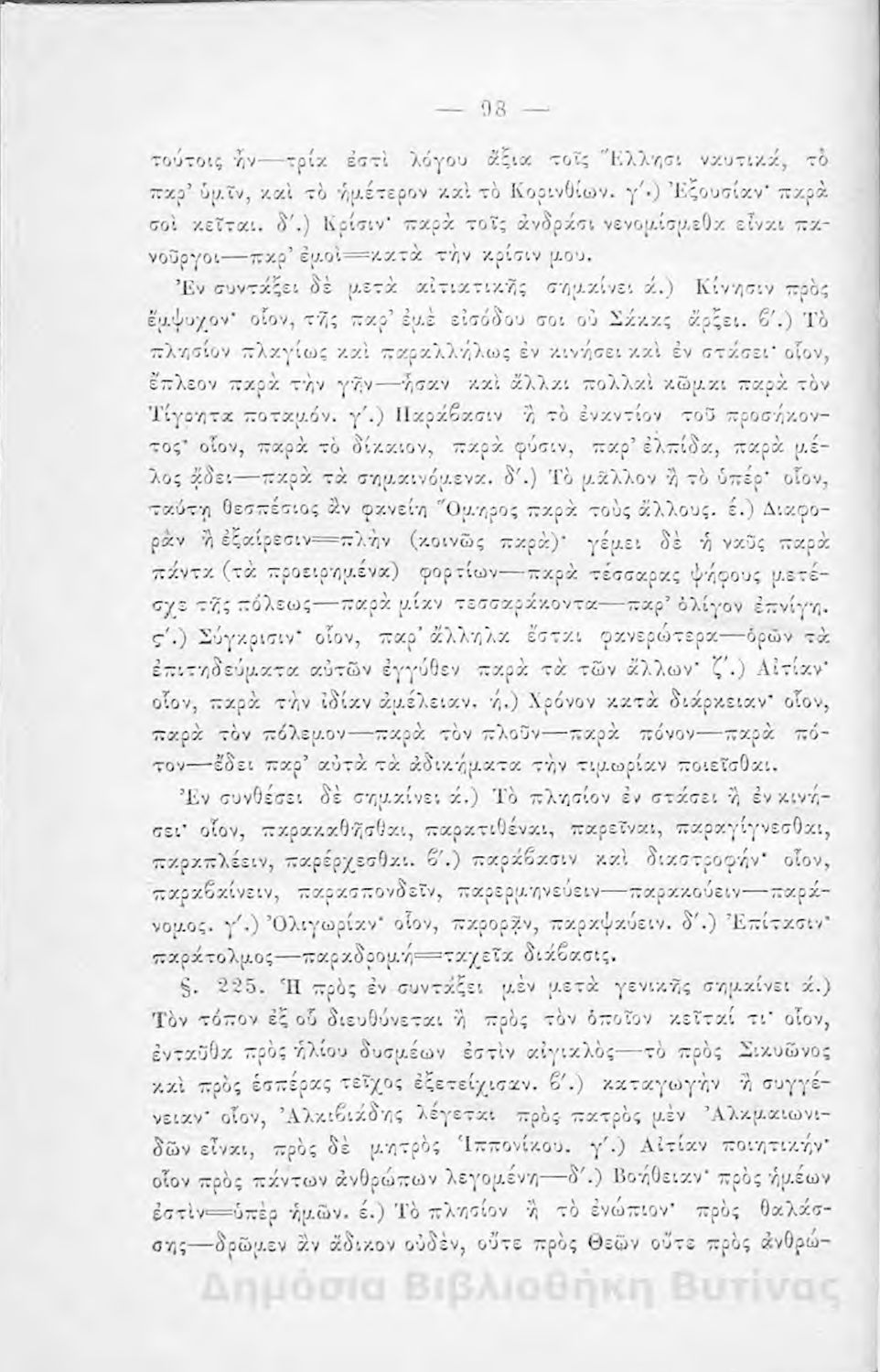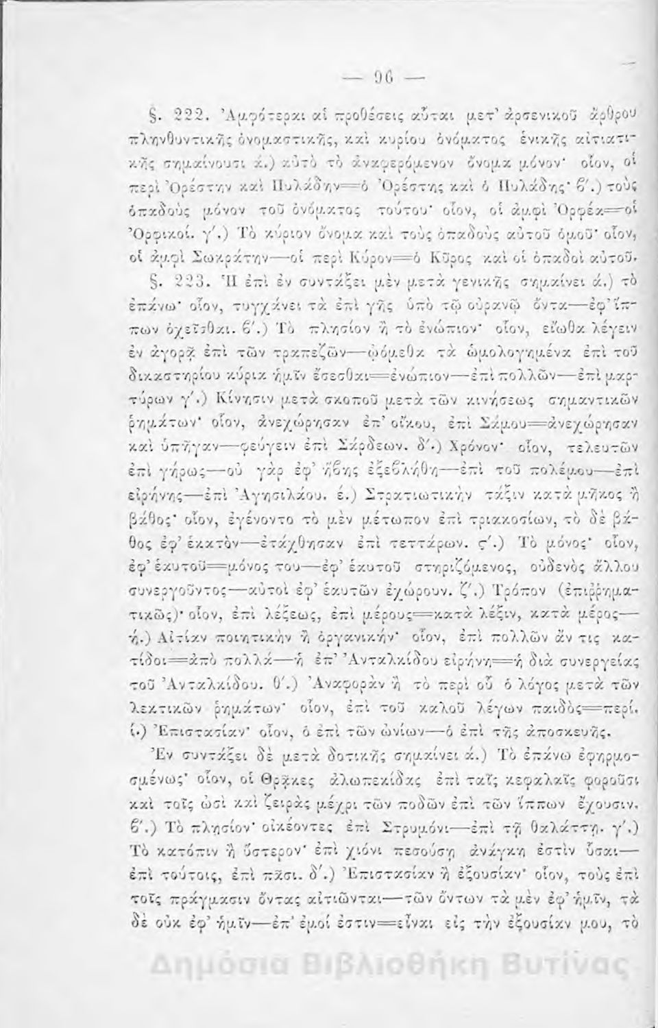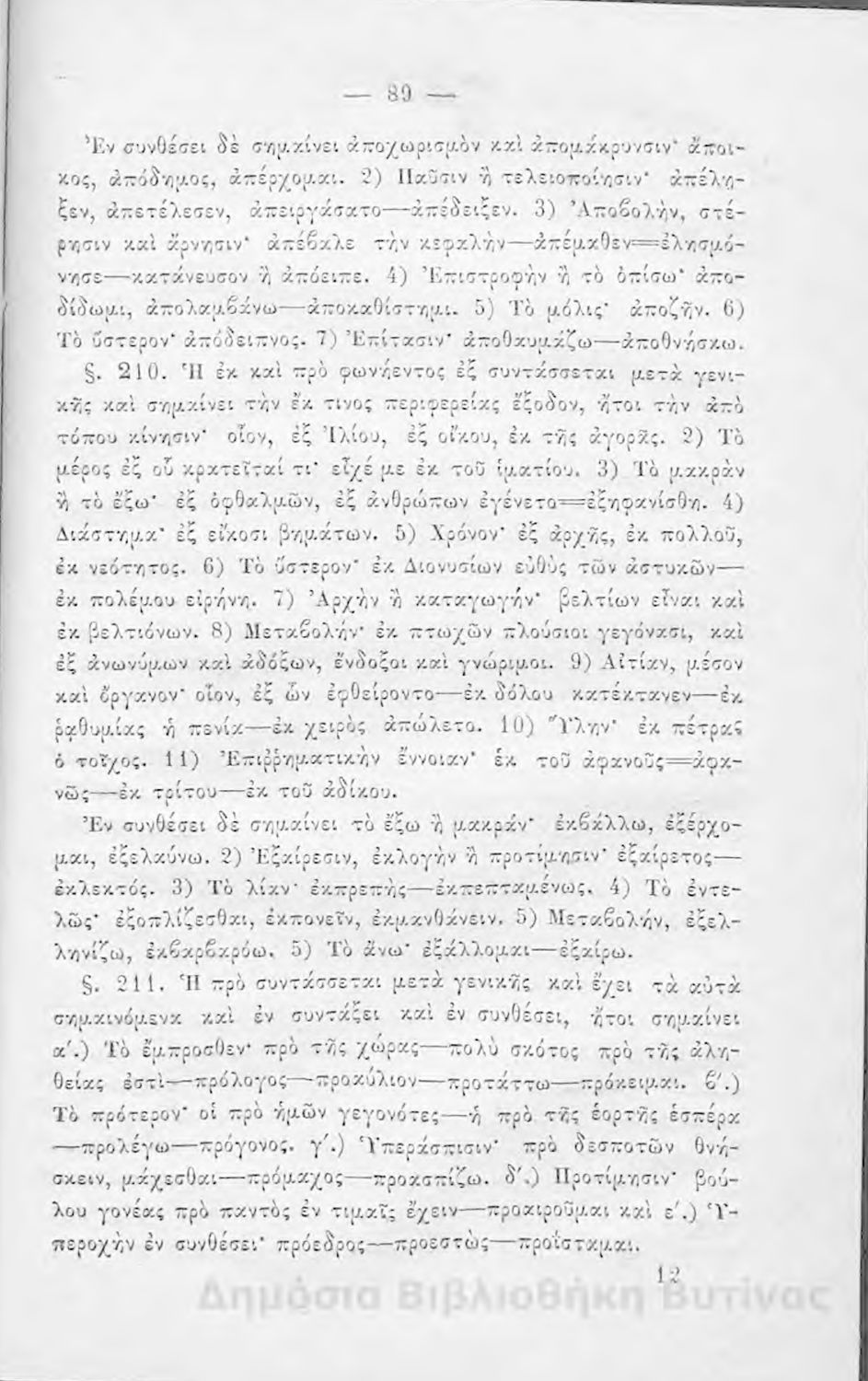 Σχολικό εγχειρίδιο Αρχαίων Ελληνικών για τους μαθητές των Ελληνικών Σχολείων και Παρθεναγωγείων που εξετάζει τα μέρη του λόγου και την σύνταξή τους.