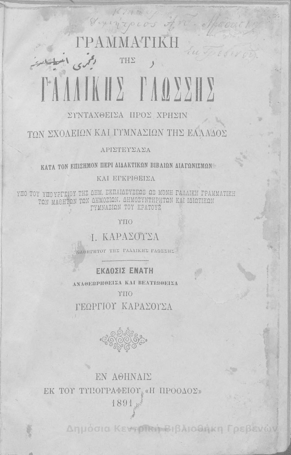 Γραμματική της γαλλικής γλώσσης : συνταχθείσα προς χρήσιν των σχολείων της Ελλάδος