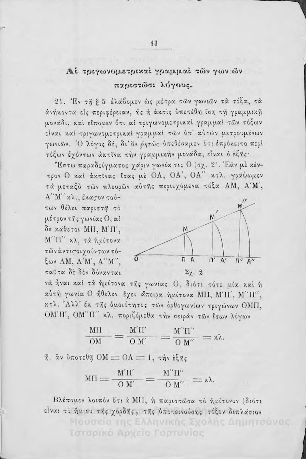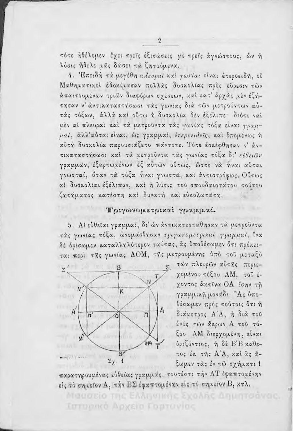 Σχολικό εγχειρίδιο Ευθύγραμμης Τριγωνομετρίας για τα Κλασσικά Γυμνάσια που εστιάζει στις τριγωνομετρικές γραμμές και την μέτρηση των ευθύγραμμων τριγώνων.