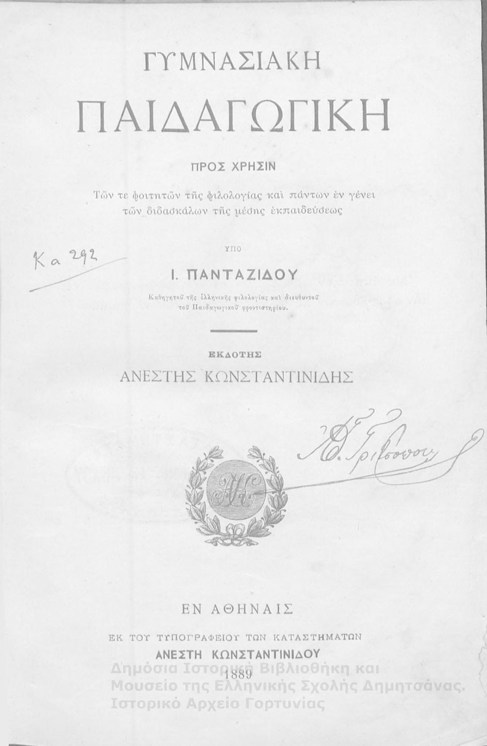 Τίτλος: Γυμνασιακή παιδαγωγική : προς χρήσιν των τε φοιτητών της φιλολογίας και πάντων εν γένει των διδασκάλων της μέσης εκπαιδεύσεως