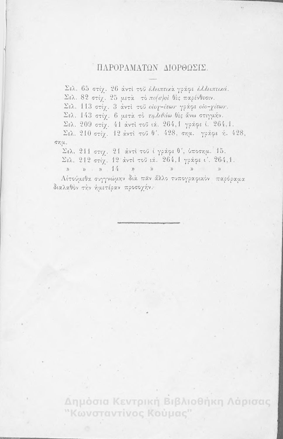 Μαθητικό βοήθημα Αρχαίων Ελληνικών για τα Ελληνικά Σχολεία, Παρθεναγωγεία και Γυμνάσια που περιλαμβάνει γραμματική της αρχαίας ελληνικής και κατάλογο ανωμάλων ρημάτων.