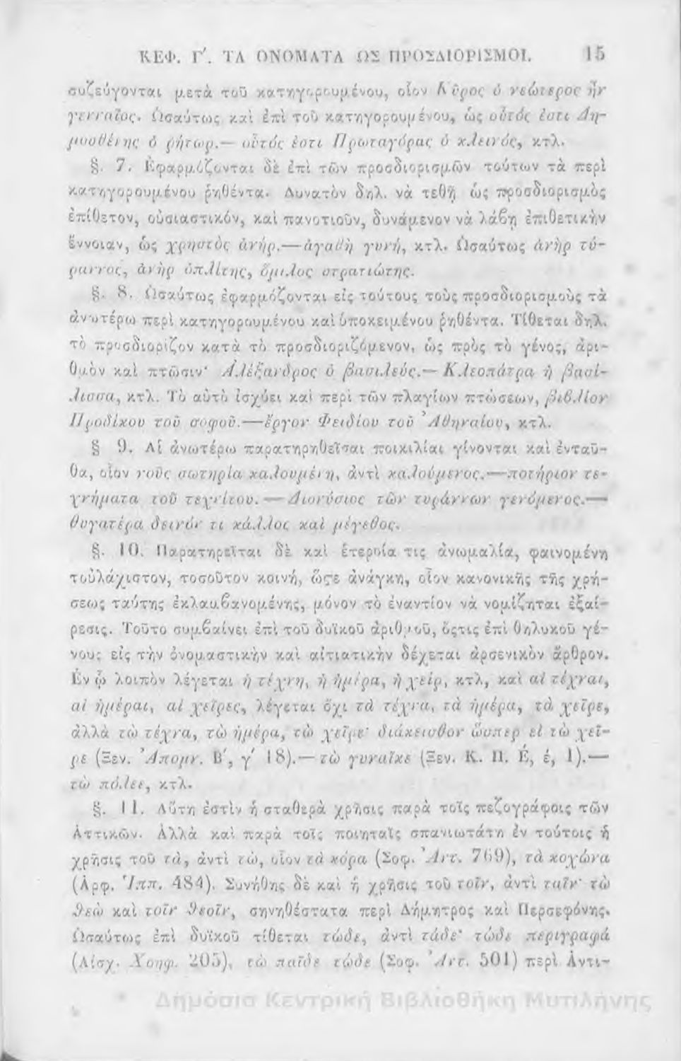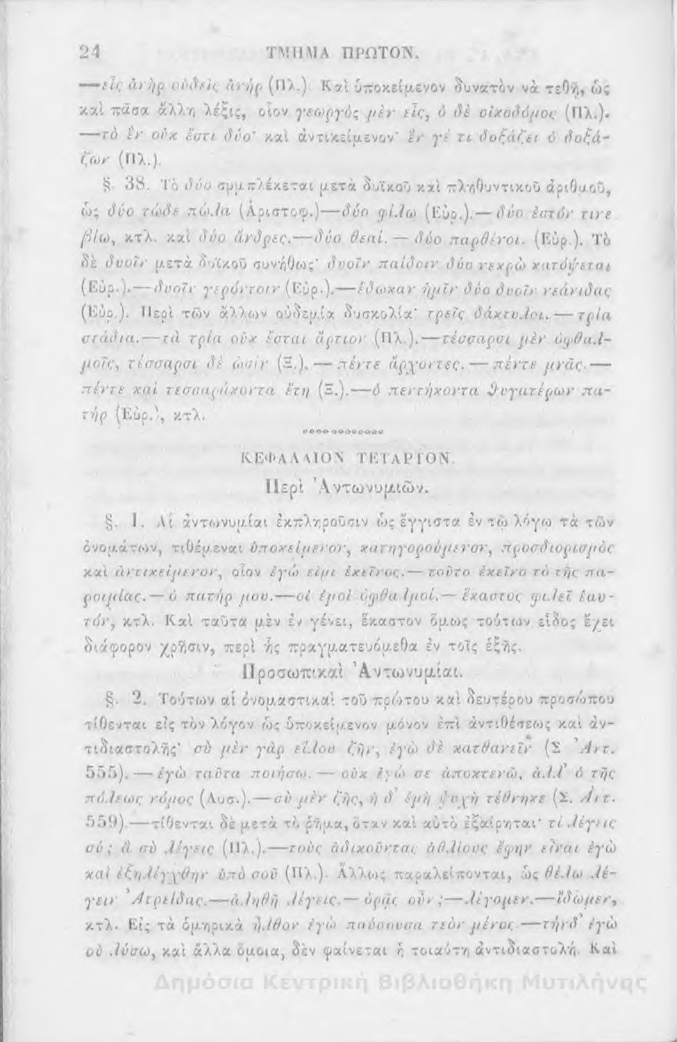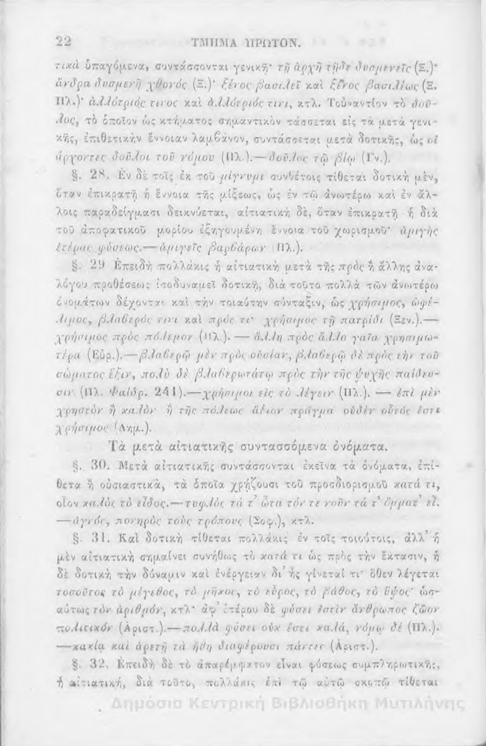 Σχολικό εγχειρίδιο Αρχαίων Ελληνικών για τα Ελληνικά Σχολεία, Παρθεναγωγεία και Γυμνάσια που περιέχει τους κανόνες γραμματικής και είναι χωρισμένο σε φθογγολογικό, τυπολογικό και ετυμολογικό μέρος.