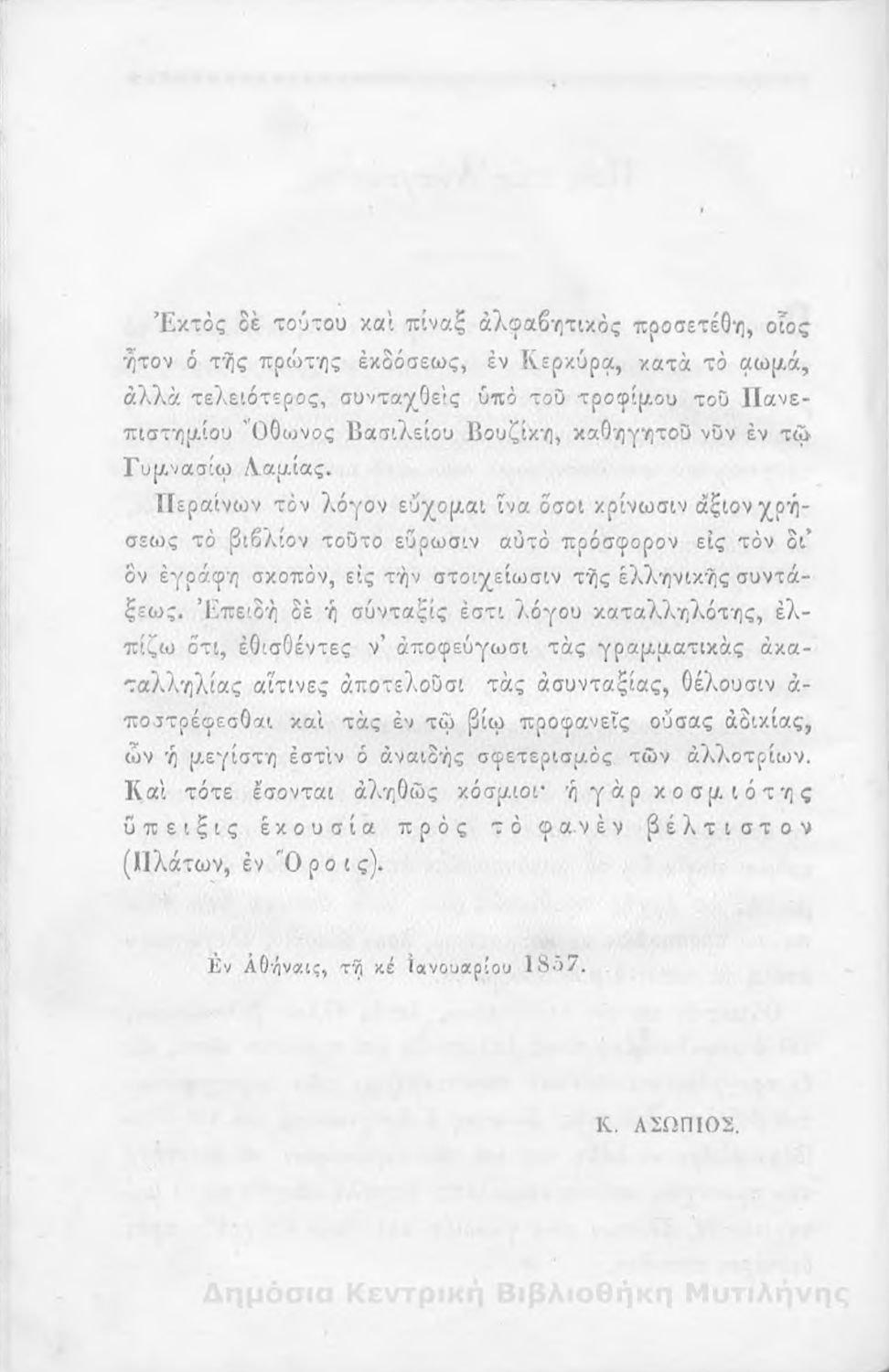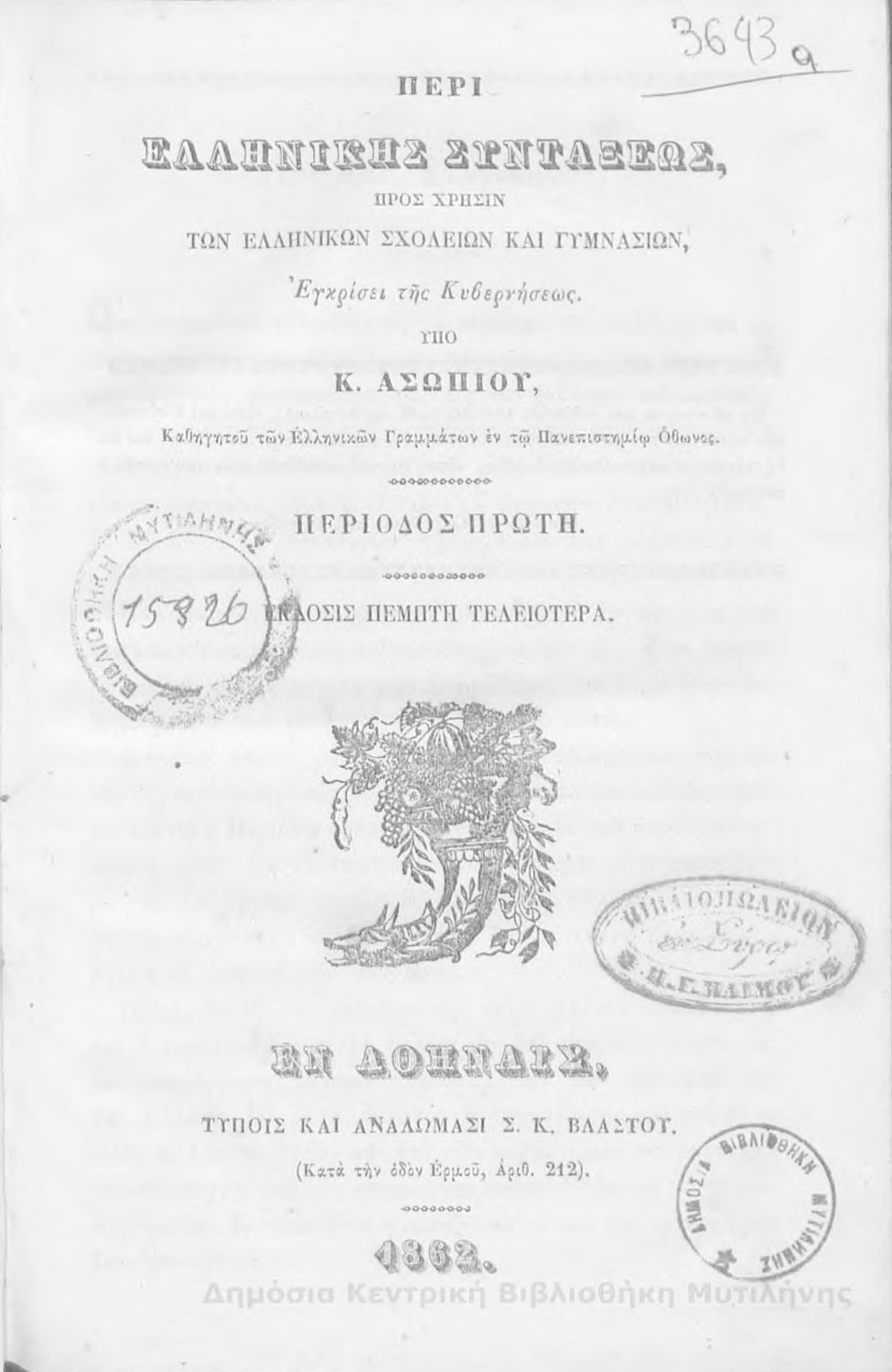 Εκδότης: Τύποις Σ. Κ. Βλαστού Έτος έκδοσης: 1862 |