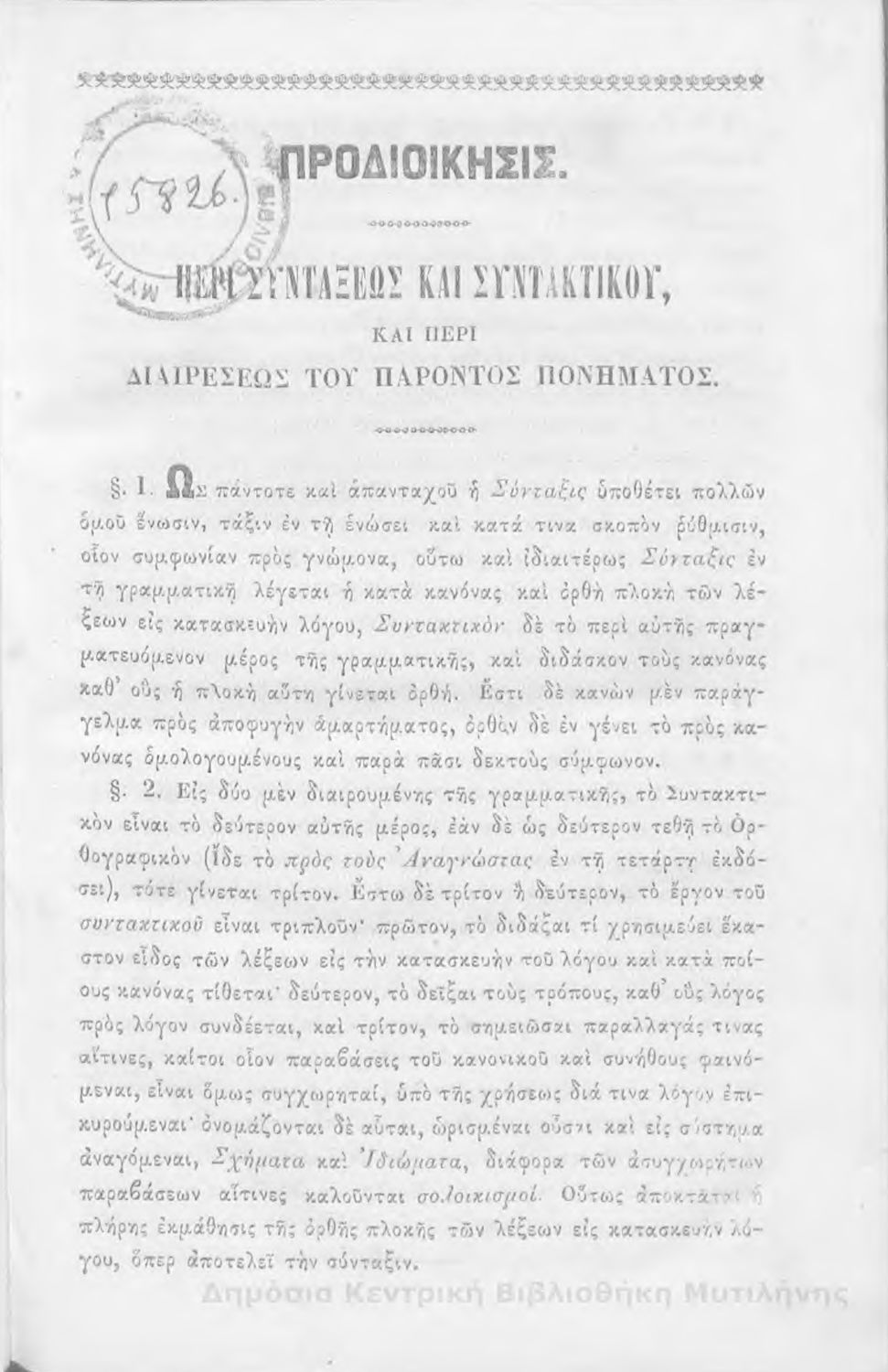 Κωδικός αναγνώρισης: 82-71807 Τίτλος: Περί ελληνικής συντάξεως : προς χρήσιν των ελληνικών σχολείων και γυμνασίων εγκρίσει της κυβερνήσεως Συγγραφέας: Κωνσταντίνος Ασώπιος Μέγεθος και υπόστρωμα: Σχολικό εγχειρίδιο. |