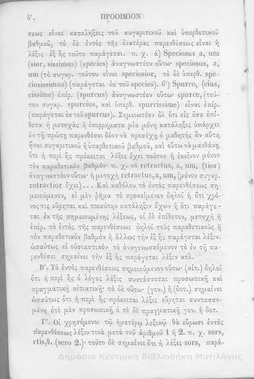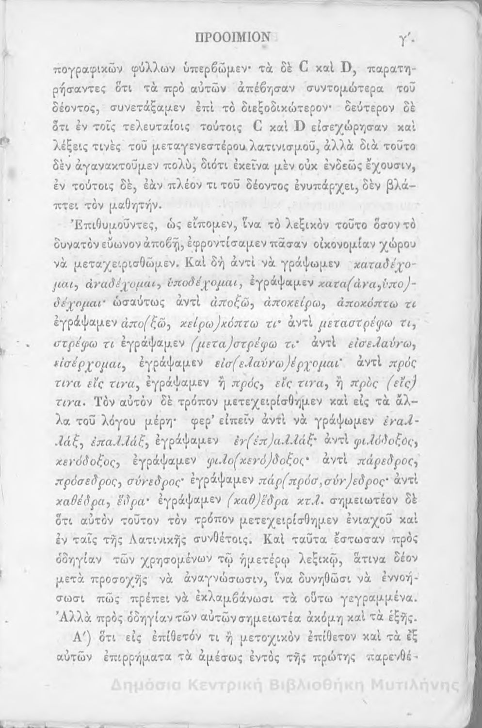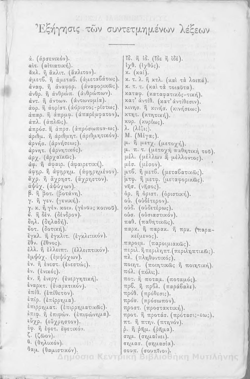 Μαθητικό βοήθημα Αρχαίων Ελληνικών για τα Ελληνικά Σχολεία, Παρθεναγωγεία και Γυμνάσια που περιλαμβάνει γραμματική της αρχαίας ελληνικής και κατάλογο ανωμάλων ρημάτων.