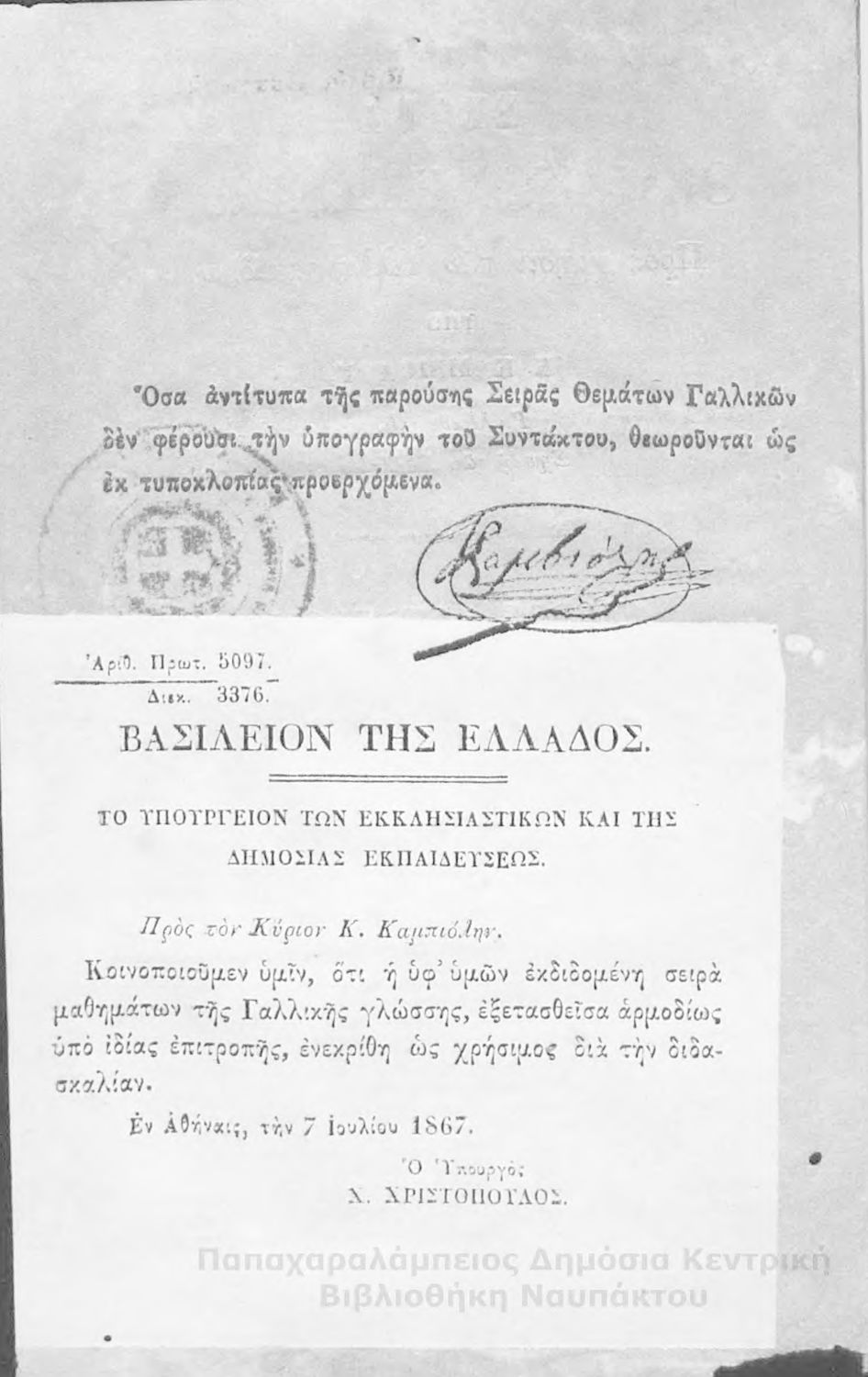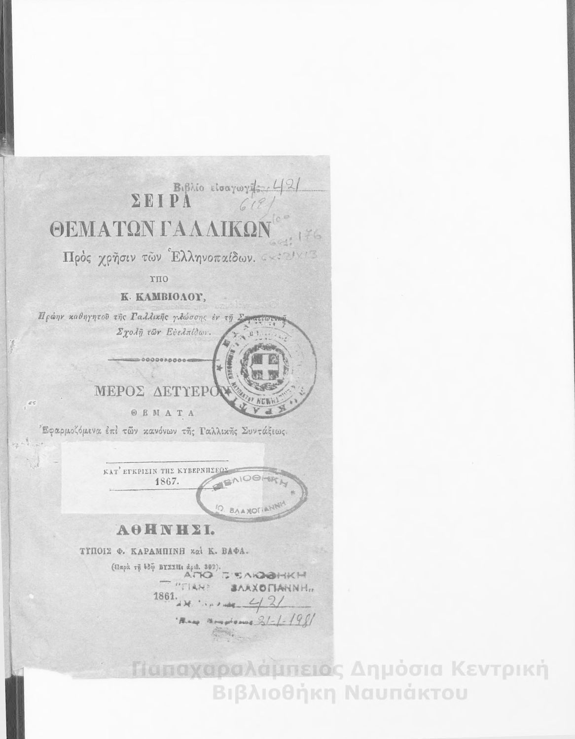 Τίτλος: Σειρά θεμάτων Γαλλικών: προς χρήσιν των Ελληνοπαίδων