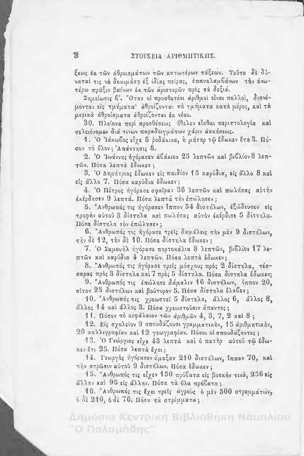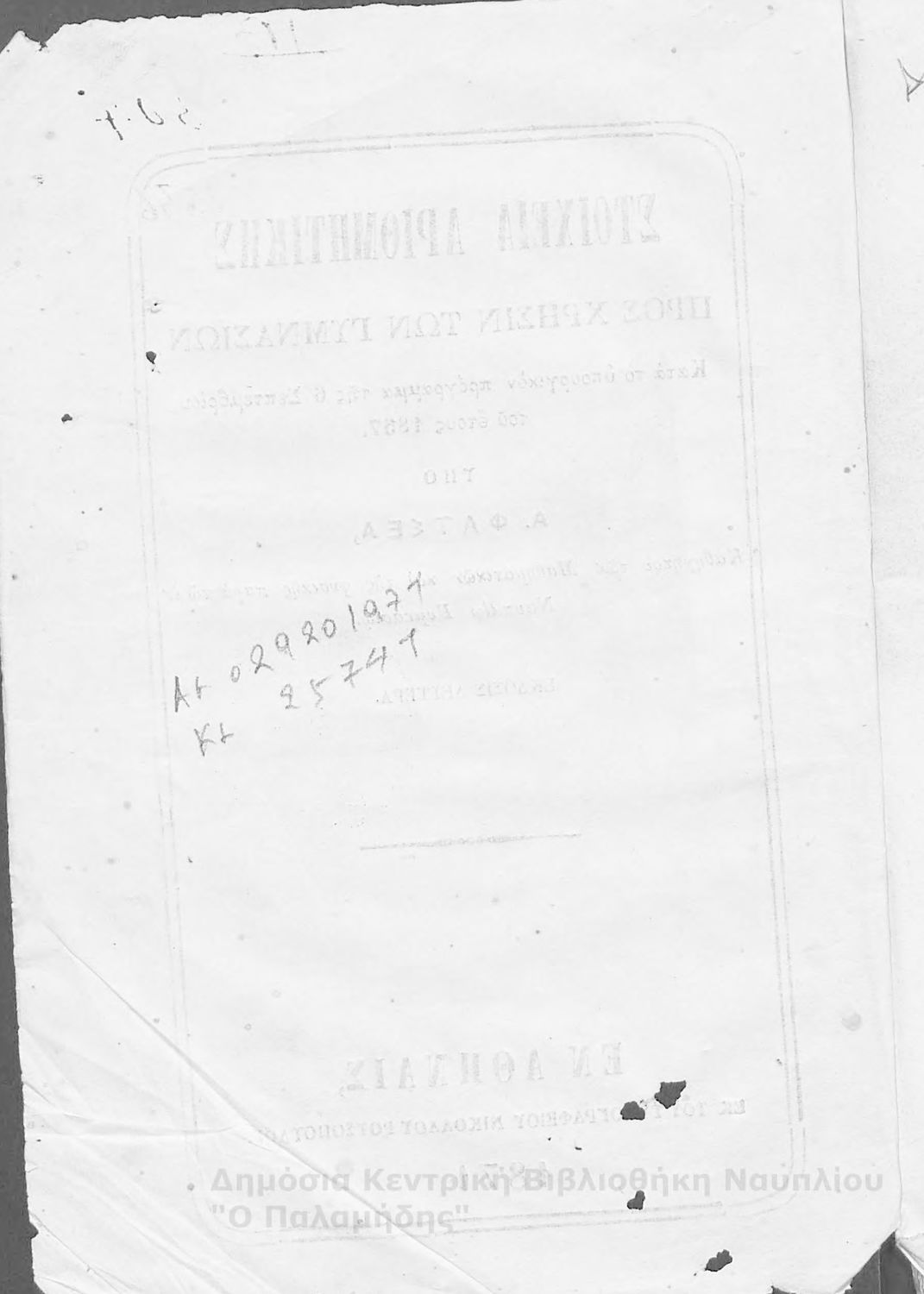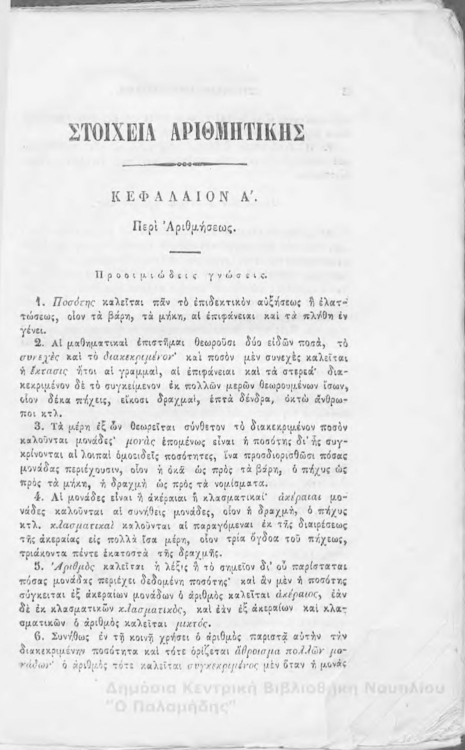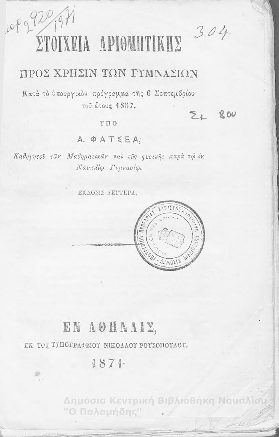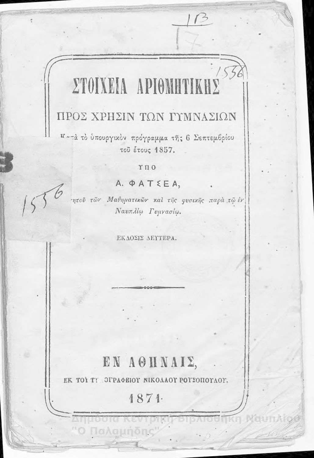 Τίτλος: Στοιχεία Αριθμητικής προς χρήσιν των Γυμνασίων