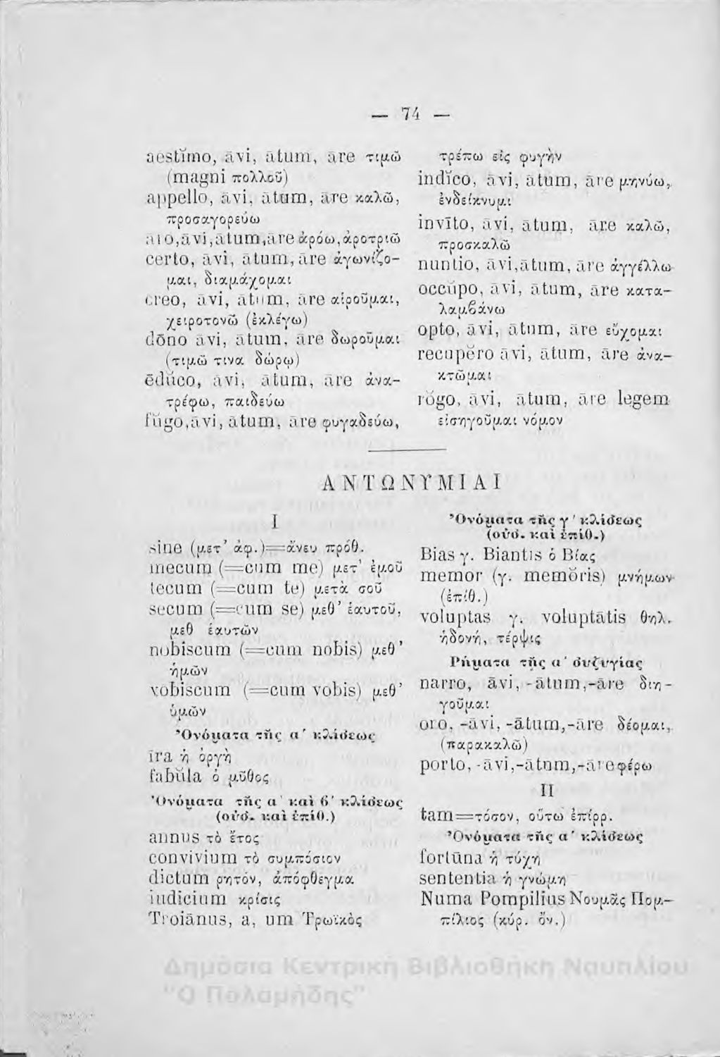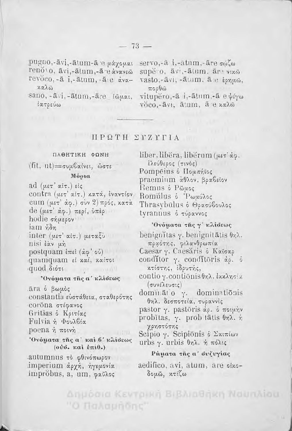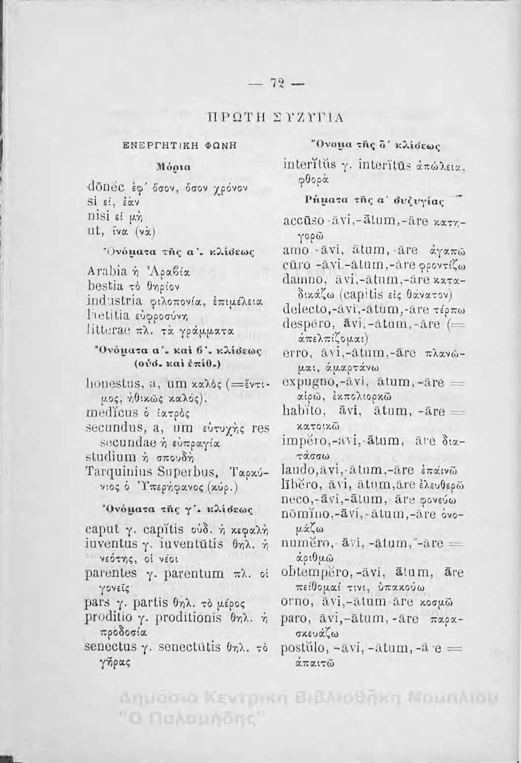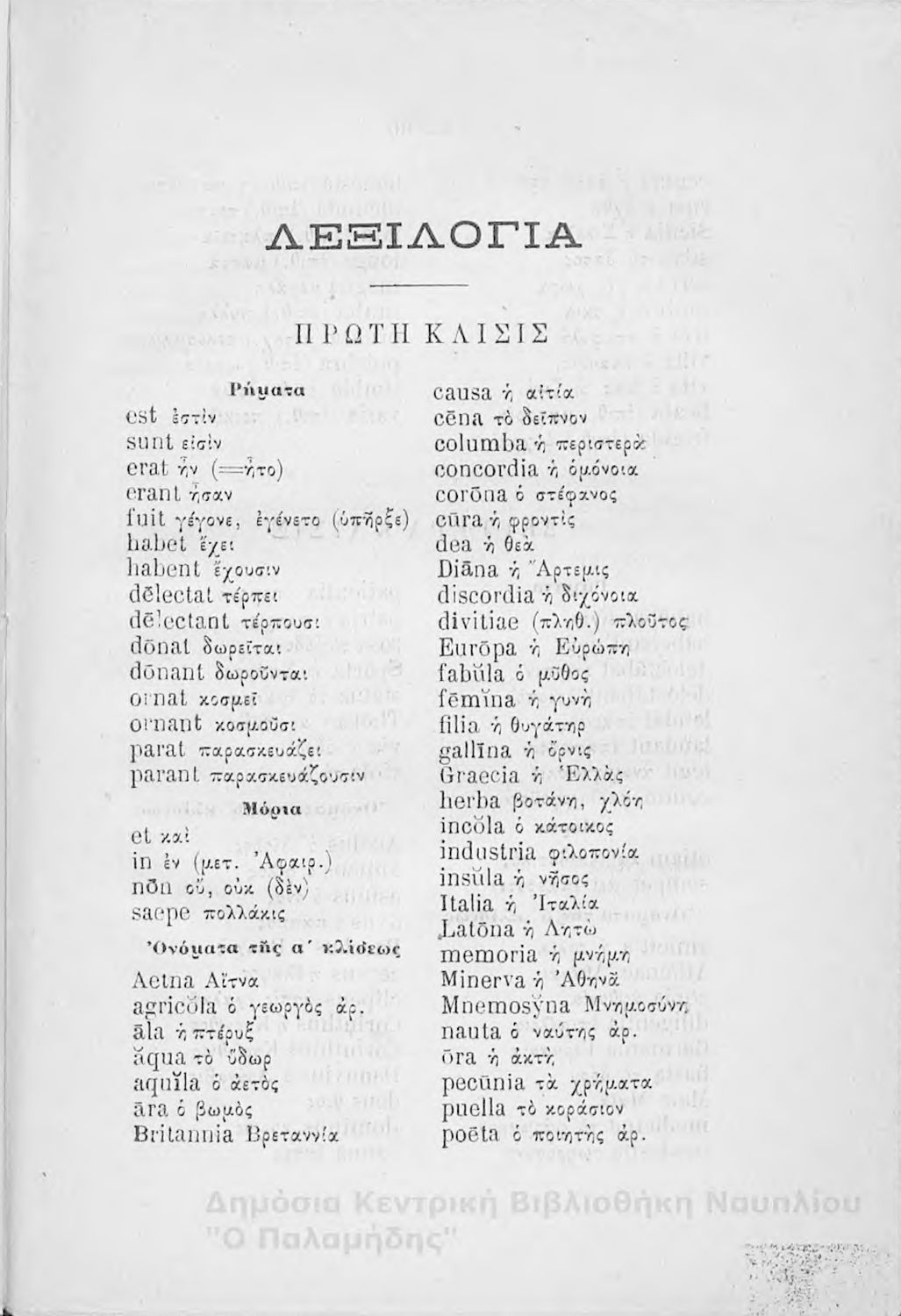 Σχολικό εγχειρίδιο Λατινικών που περιλαμβάνει γραμματική, συντακτικό, κείμενα και λεξιλόγιο.