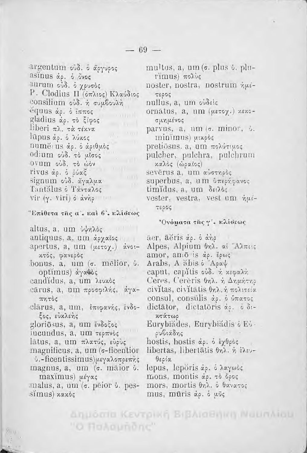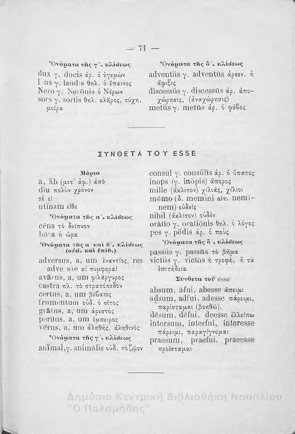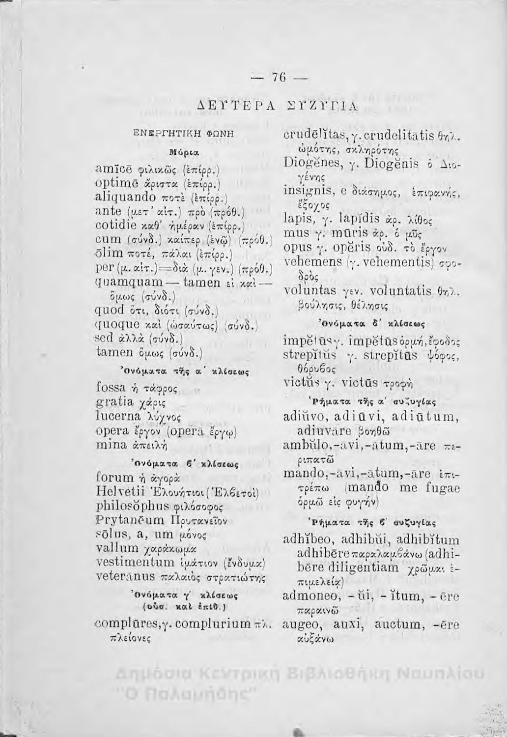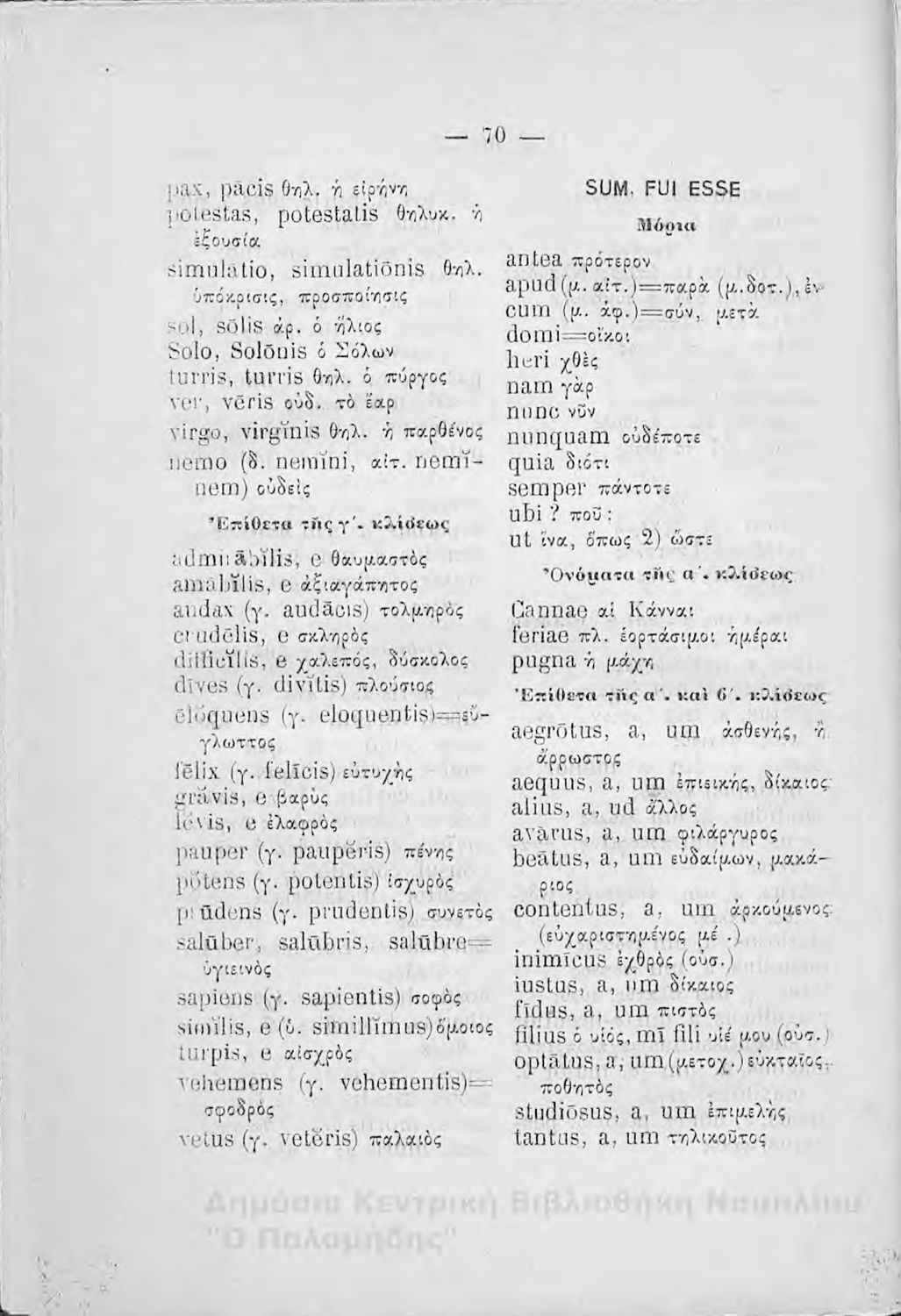 Σχολικό εγχειρίδιο Λατινικών που περιλαμβάνει γραμματική, συντακτικό, κείμενα και λεξιλόγιο.
