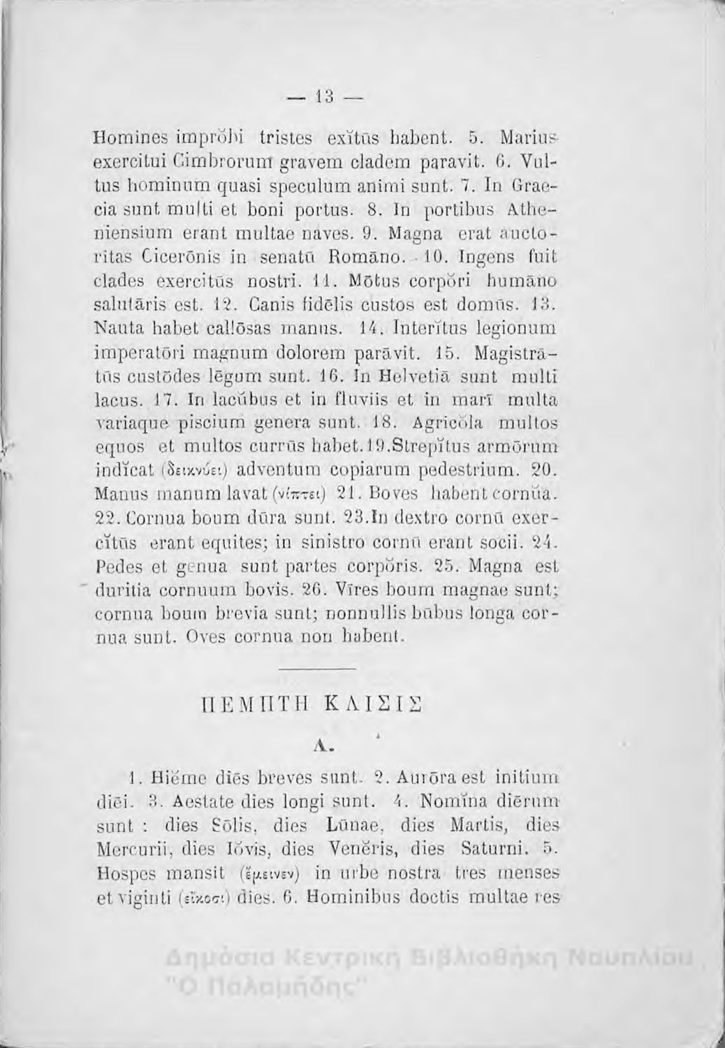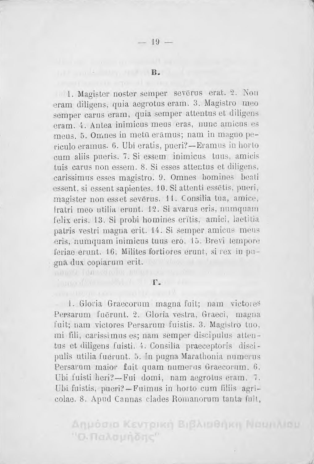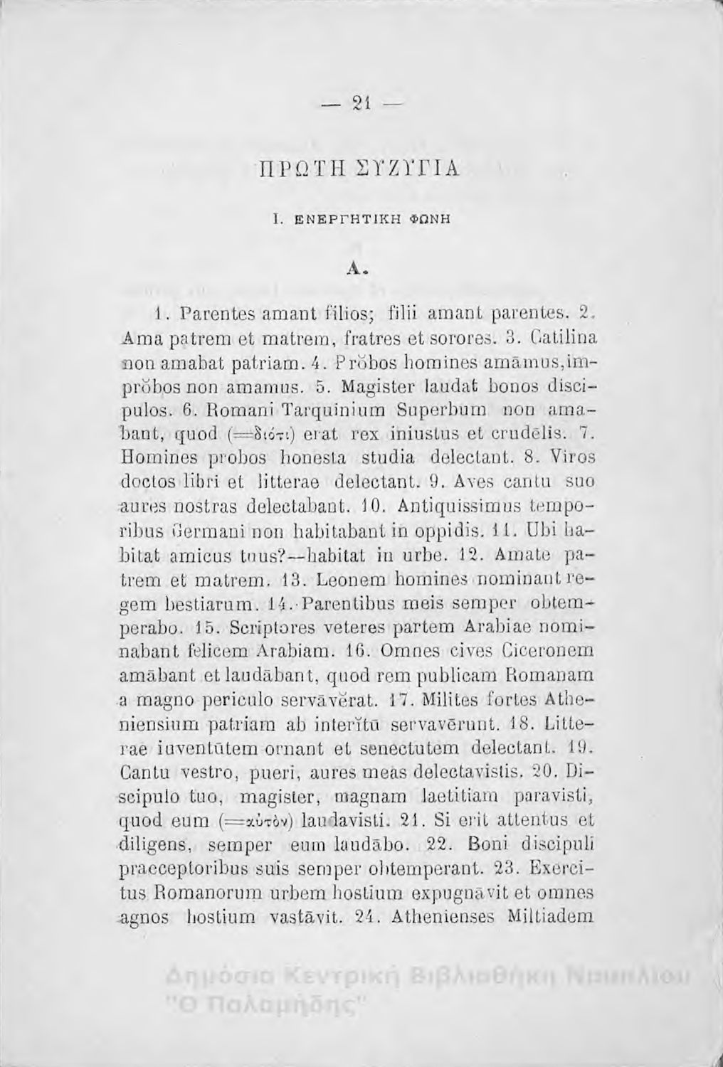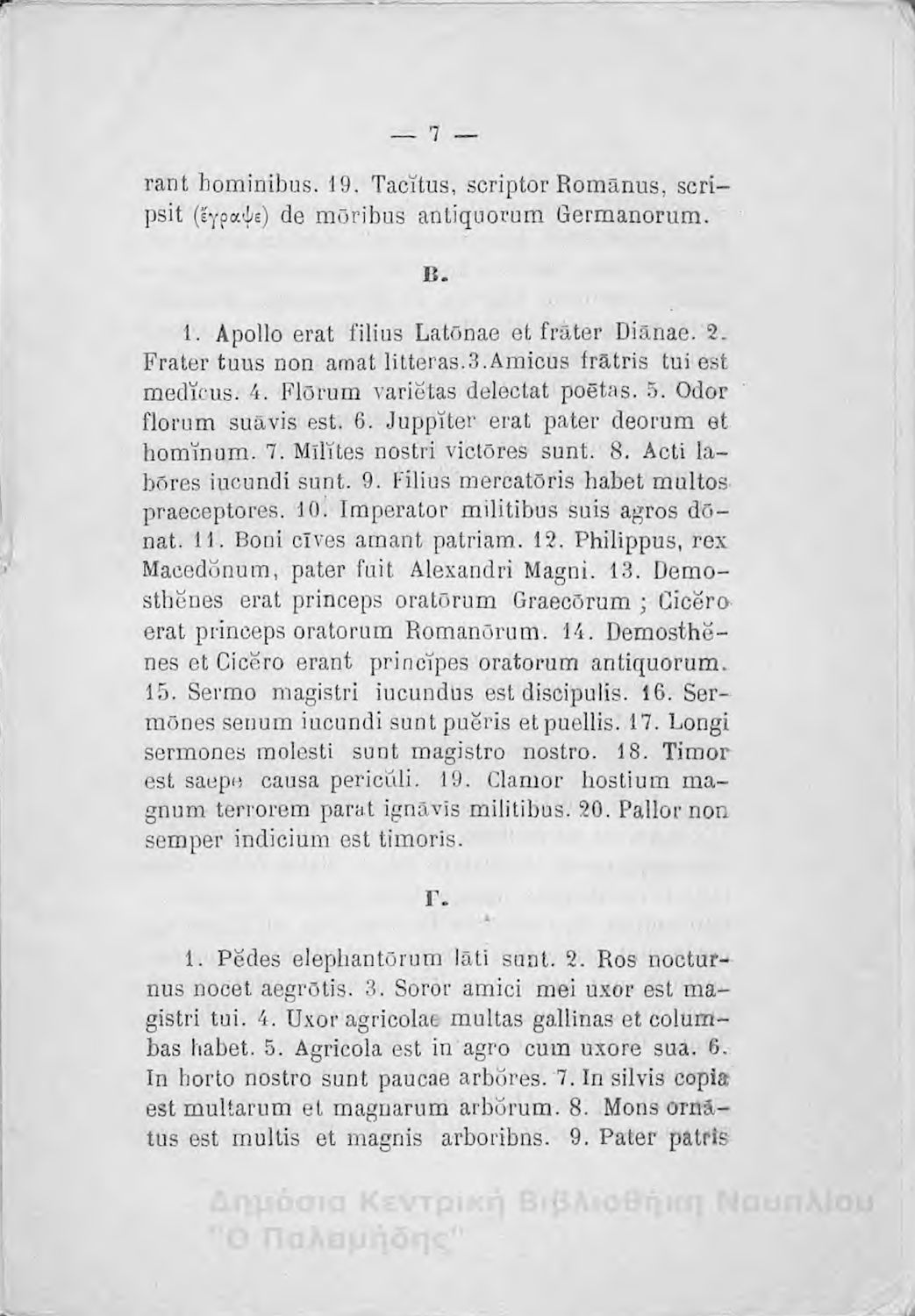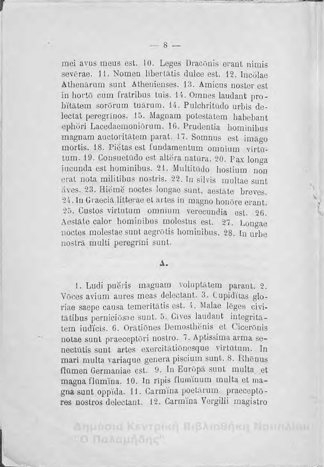Σχολικό εγχειρίδιο Λατινικών για τα Ελληνικά Σχολεία που περιλαμβάνει τη γραμματική της λατινικής γλώσσας.
