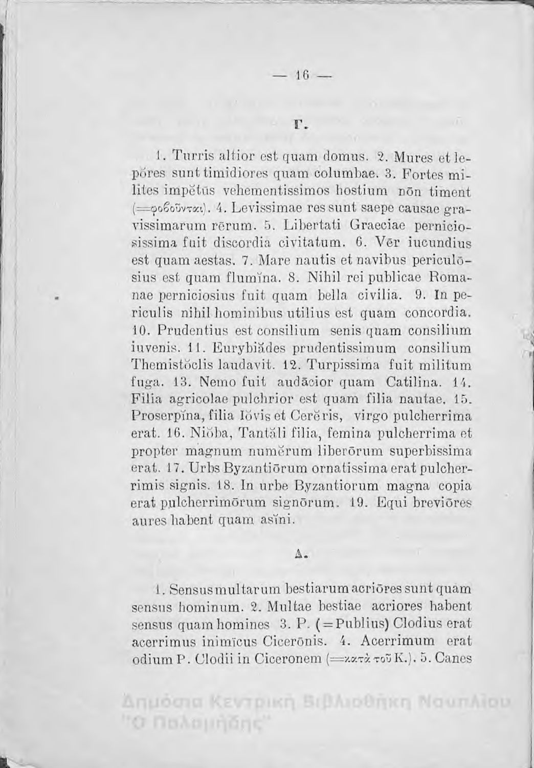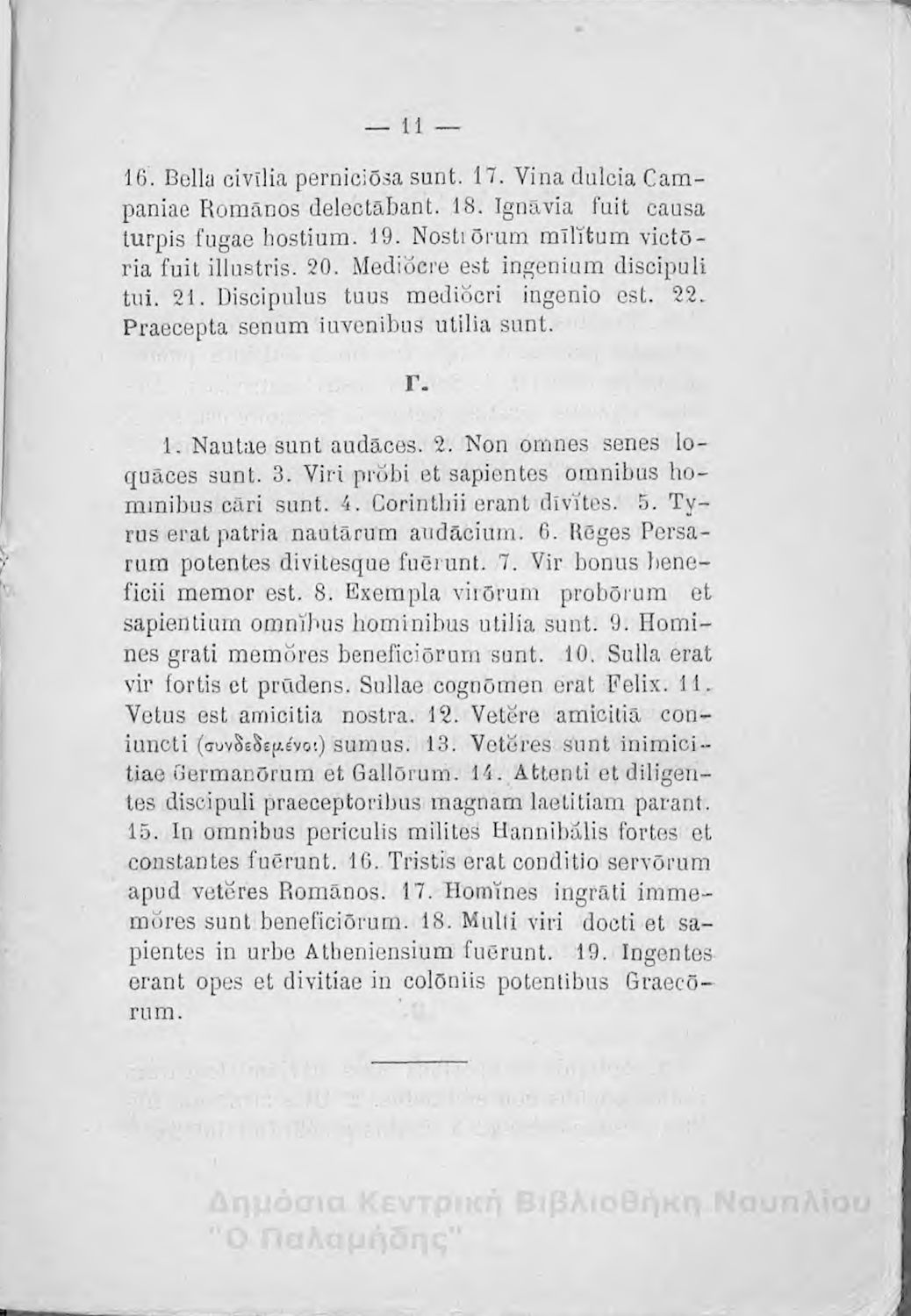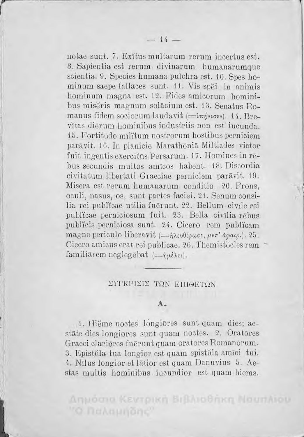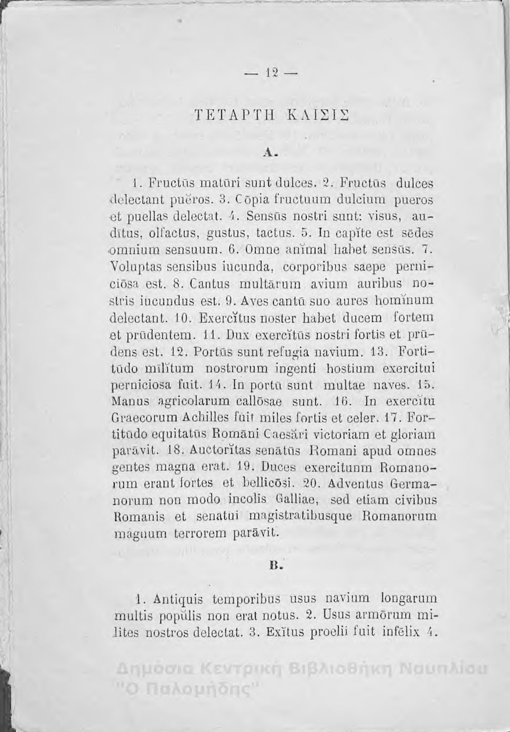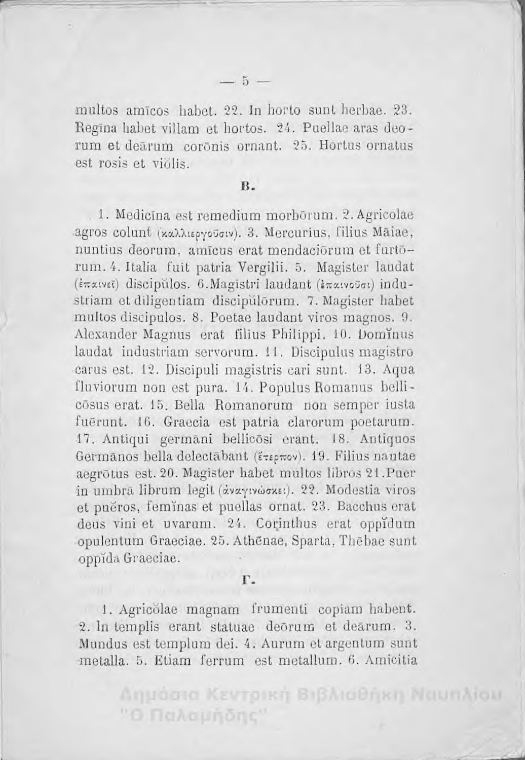 Σχολικό εγχειρίδιο Λατινικών που περιλαμβάνει γραμματική, συντακτικό, κείμενα και λεξιλόγιο.