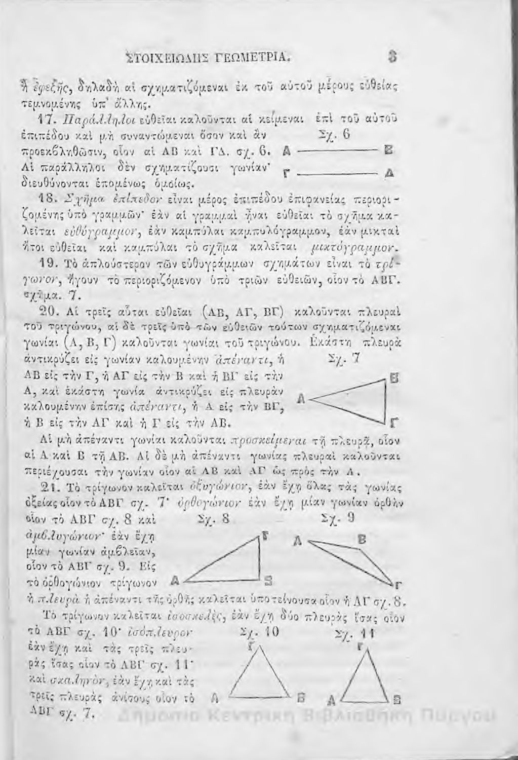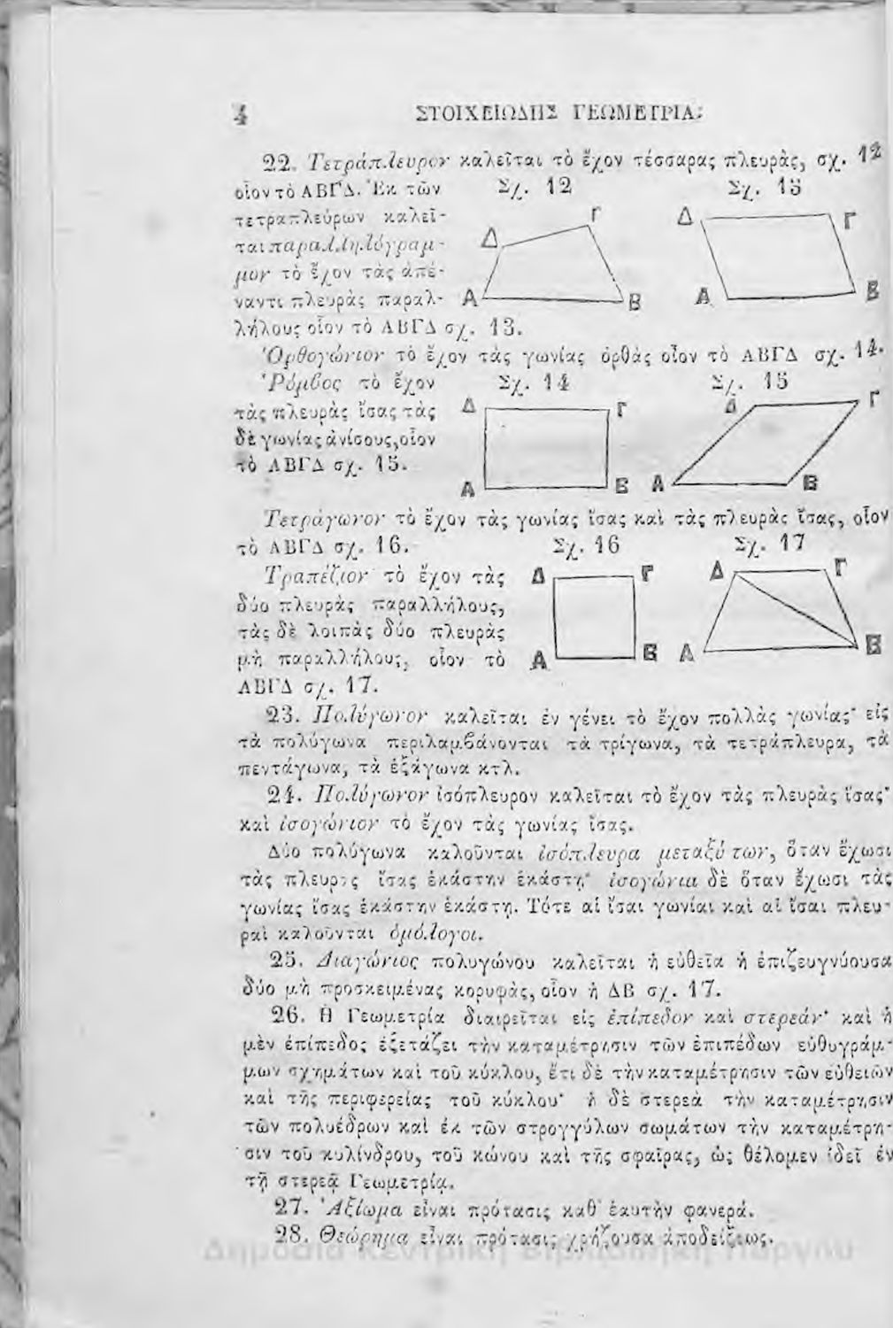 Σχολικό εγχειρίδιο Γεωμετρίας για την Α΄, Β΄ και Γ΄ τάξη των Ελληνικών και Αστικών Σχολείων και Παρθεναγωγείων που είναι χωρισμένο σε Επιπεδομετρία και Στερεομετρία και περιλαμβάνει θεωρία και ασκήσεις.