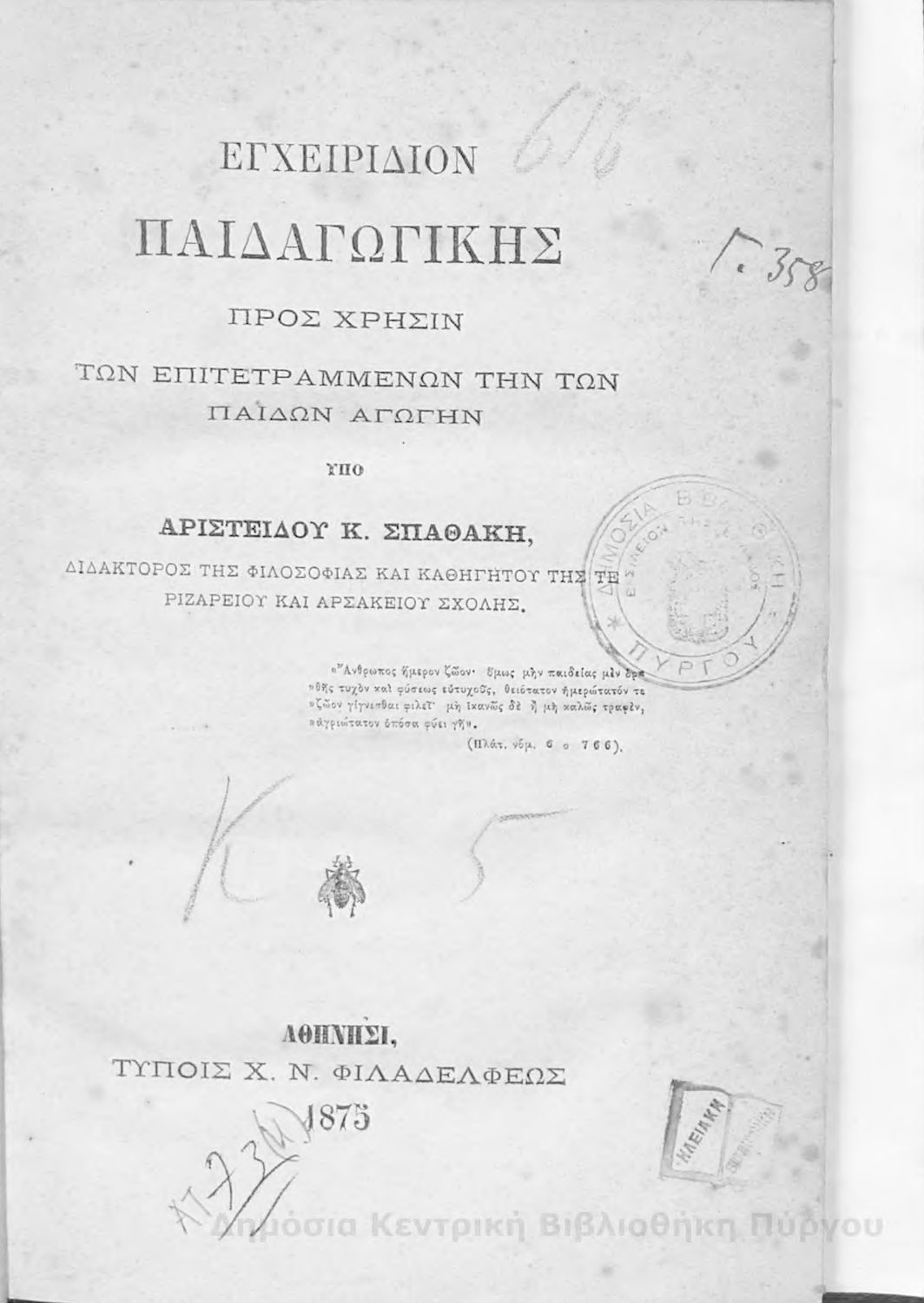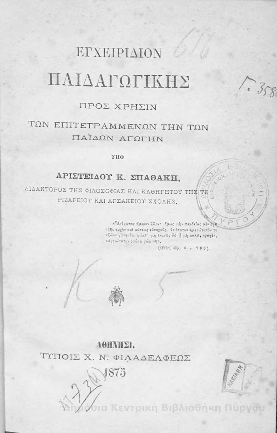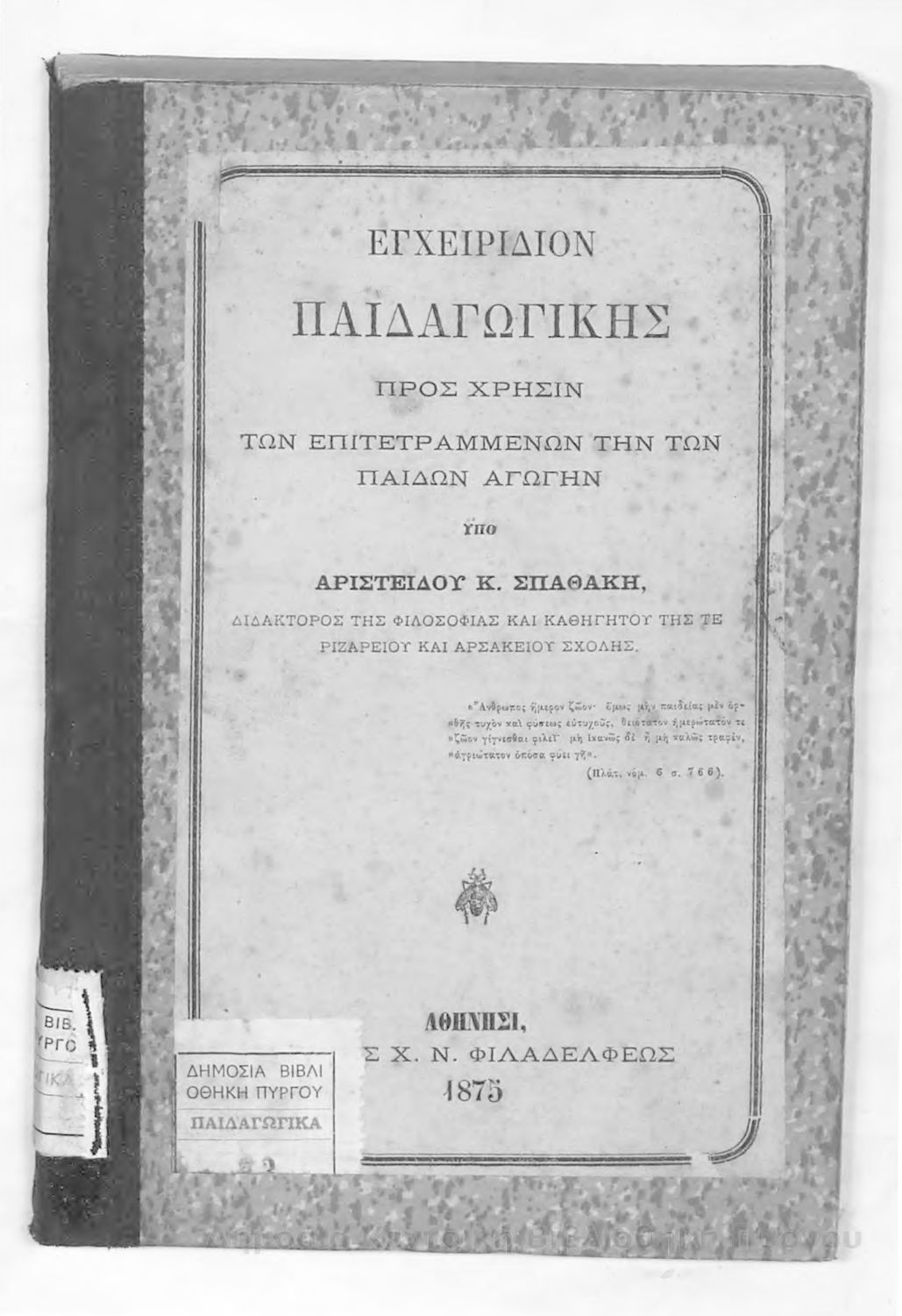 Τίτλος: Εγχειρίδιον παιδαγωγικής : προς χρήσιν των επιτετραμμένων την των παίδων αγωγήν