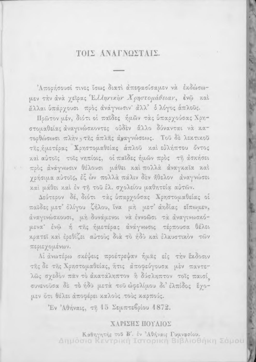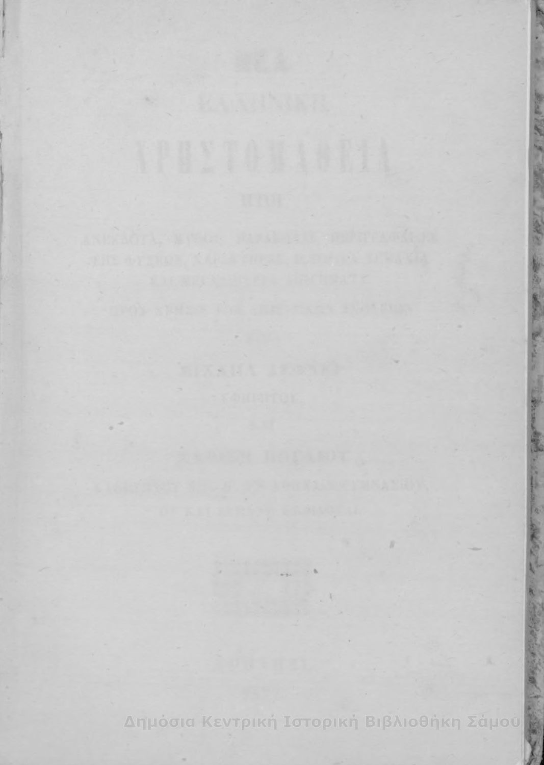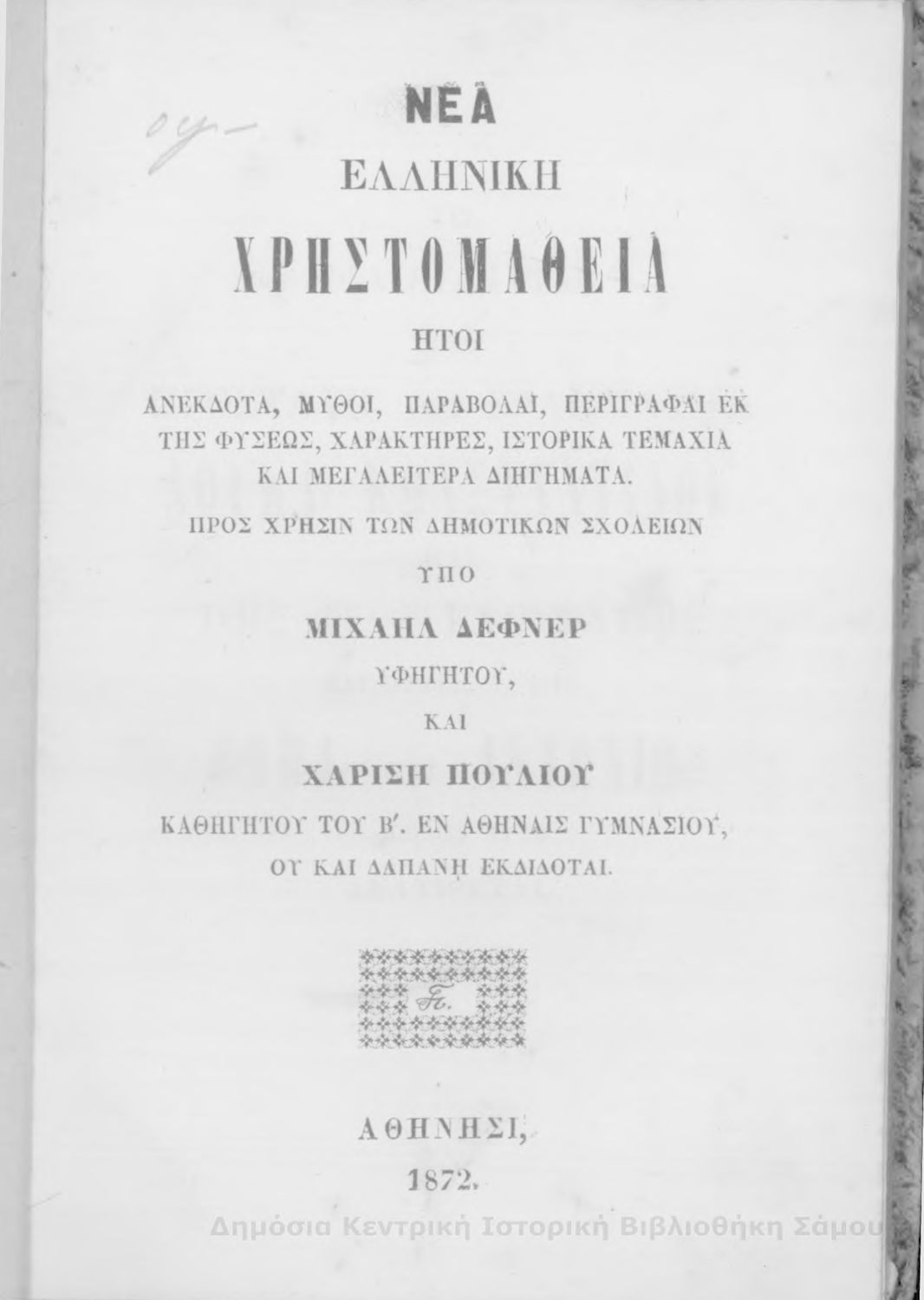 Κωδικός αναγνώρισης: 89-91941 Τίτλος: Νεα Ελληνική χρηστομάθεια ήτοι ανέκδοτα, μύθοι παραβολαί, περιγραφαί εκ της φύσεως, χαρακτήρες, ιστορικά τεμάχια και μεγαλείτερα [sic] διηγήματα : προς χρήσιν των δημοτικών σχολείων Συγγραφέας: Michael Deffner, Χαρίσης Πούλιος Μέγεθος και υπόστρωμα: Σχολικό εγχειρίδιο. |