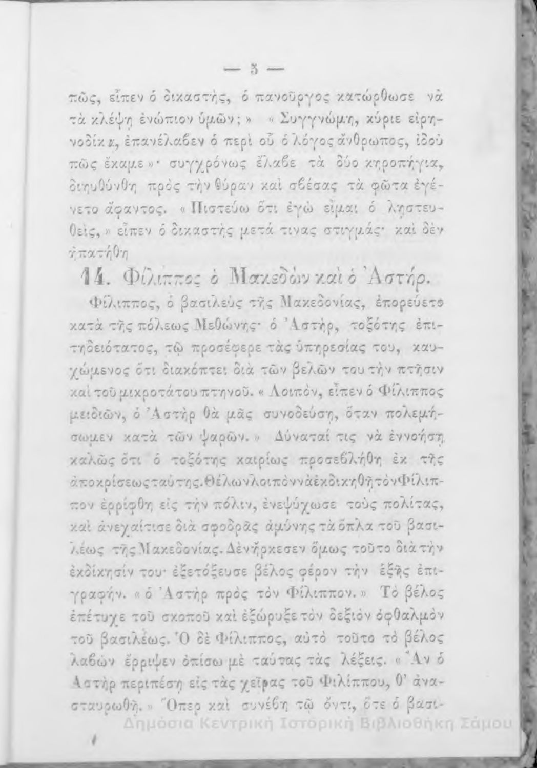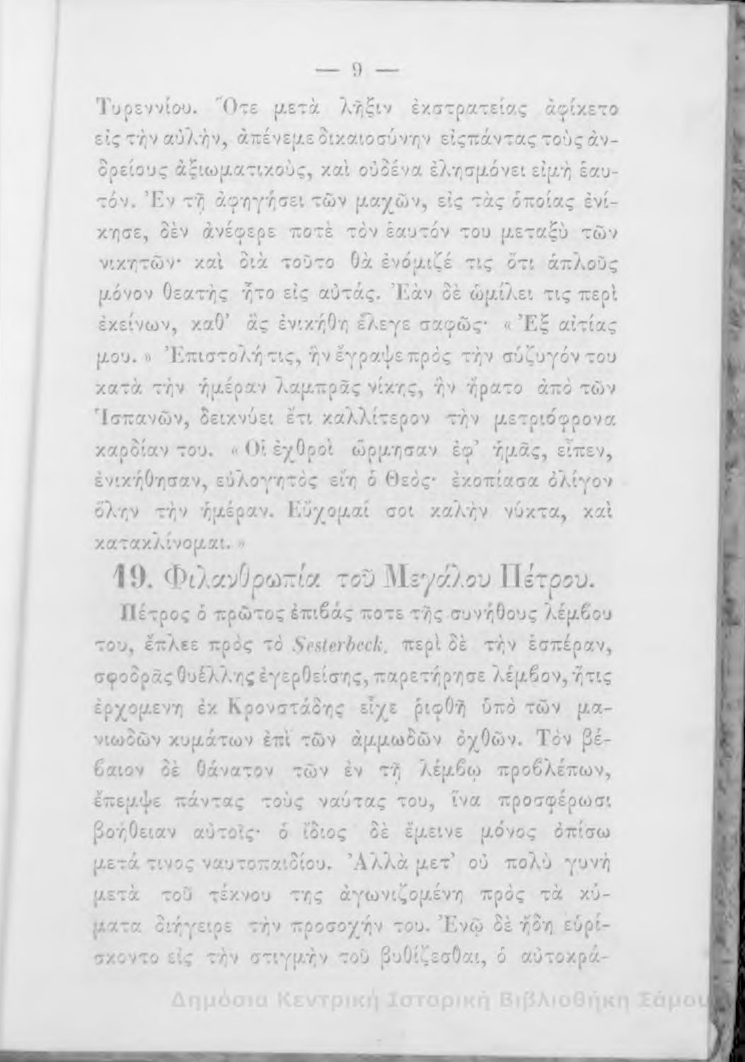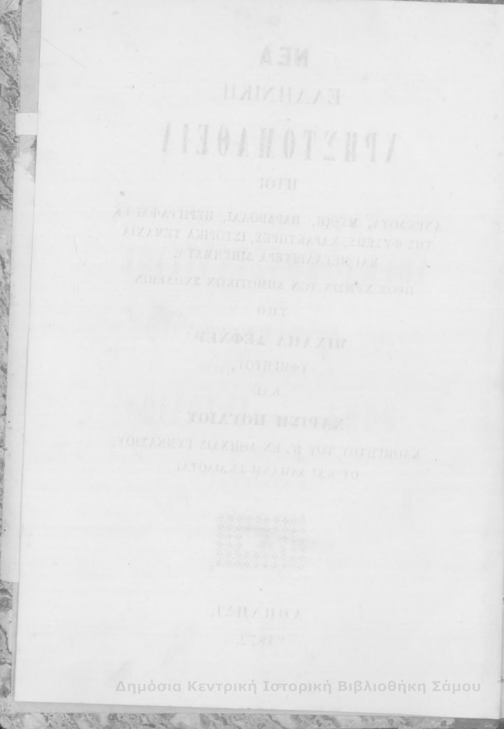 Κωδικός αναγνώρισης: 89-91941 Τίτλος: Νεα Ελληνική χρηστομάθεια ήτοι ανέκδοτα, μύθοι παραβολαί, περιγραφαί εκ της φύσεως, χαρακτήρες, ιστορικά τεμάχια και μεγαλείτερα [sic] διηγήματα : προς χρήσιν των δημοτικών σχολείων Συγγραφέας: Michael Deffner, Χαρίσης Πούλιος Μέγεθος και υπόστρωμα: Σχολικό εγχειρίδιο. |