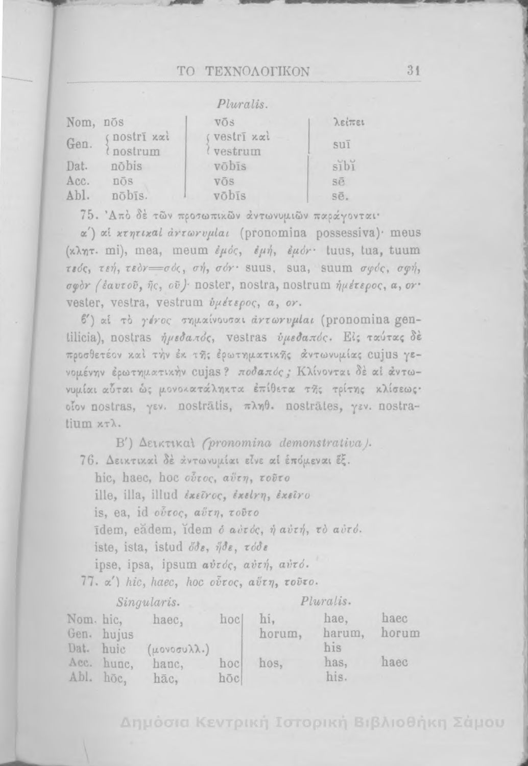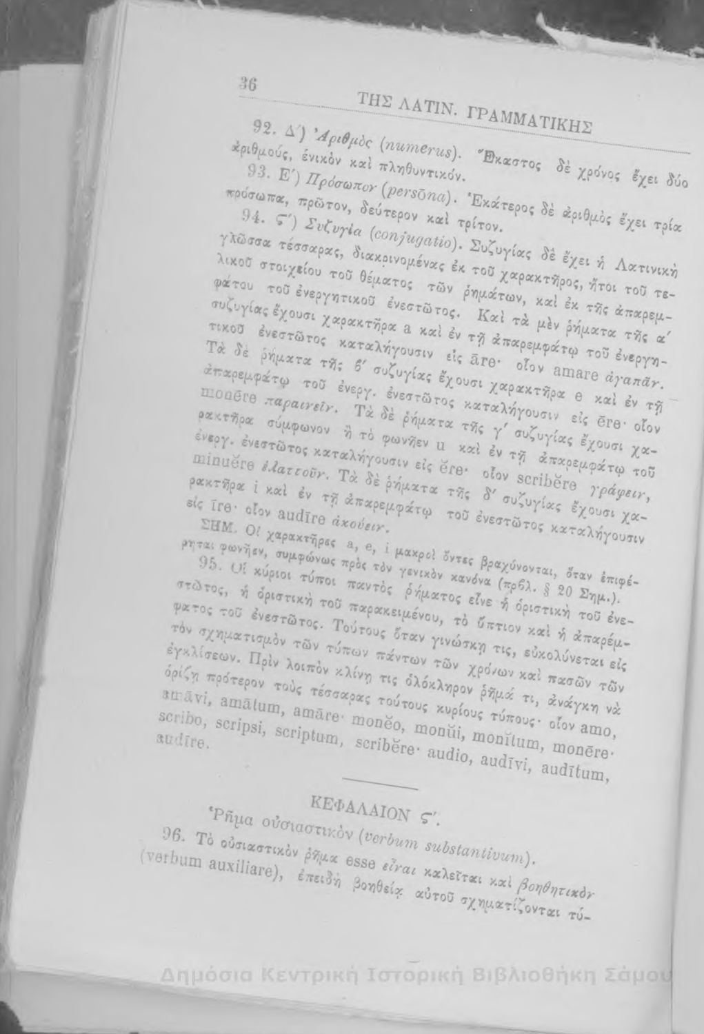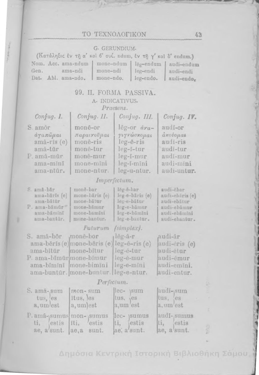 Γραμματικής της λατινικής γλώσσας για τα Ελληνικά Σχολεία και Γυμνάσια που περιέχει δύο τμήματα: το τεχνολογικό που εστιάζει στα μέρη του λόγου και το συντακτικό που ασχολείται με τις πτώσεις, τις εγκλίσεις, ...
