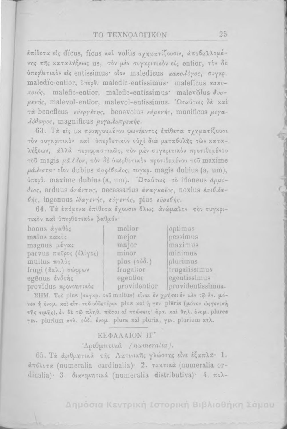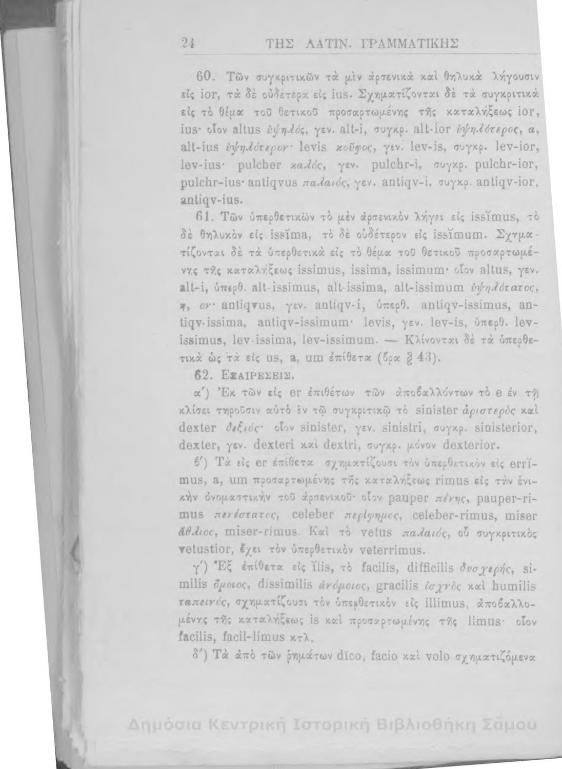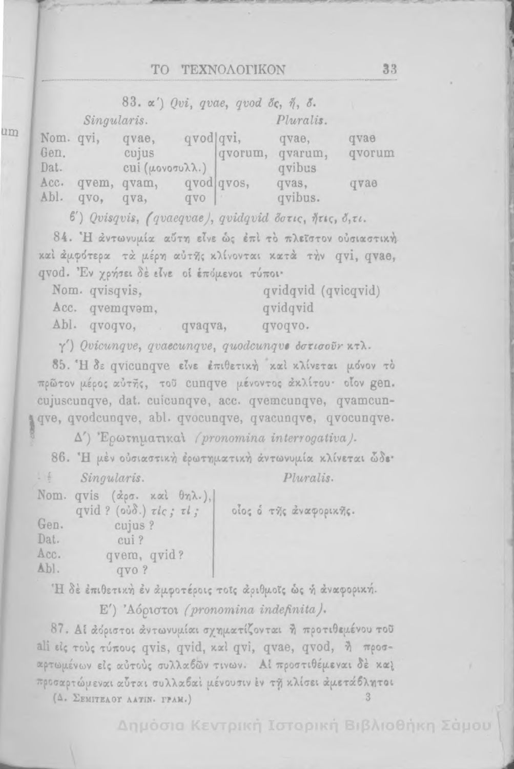 Γραμματικής της λατινικής γλώσσας για τα Ελληνικά Σχολεία και Γυμνάσια που περιέχει δύο τμήματα: το τεχνολογικό που εστιάζει στα μέρη του λόγου και το συντακτικό που ασχολείται με τις πτώσεις, τις εγκλίσεις, ...