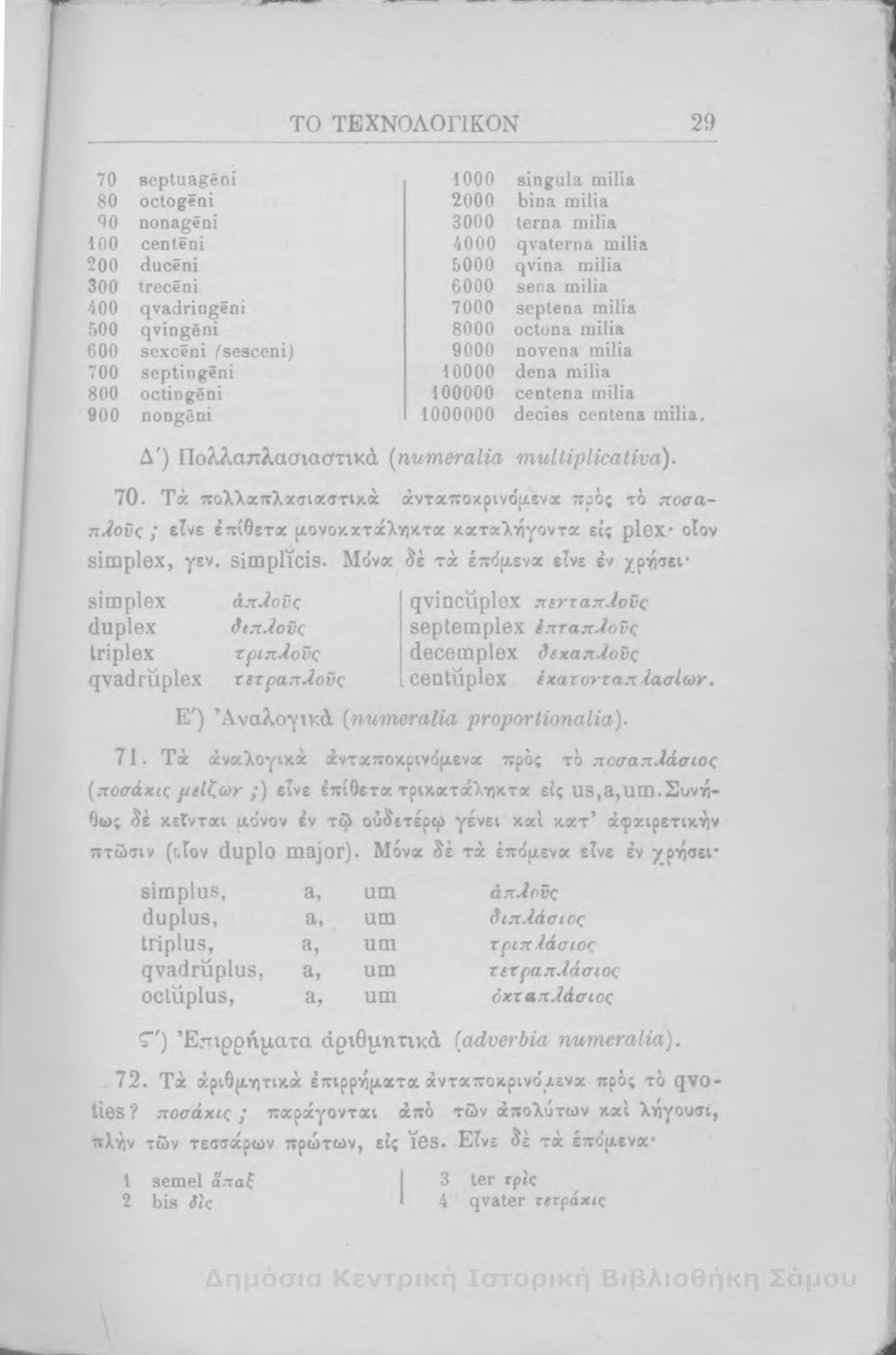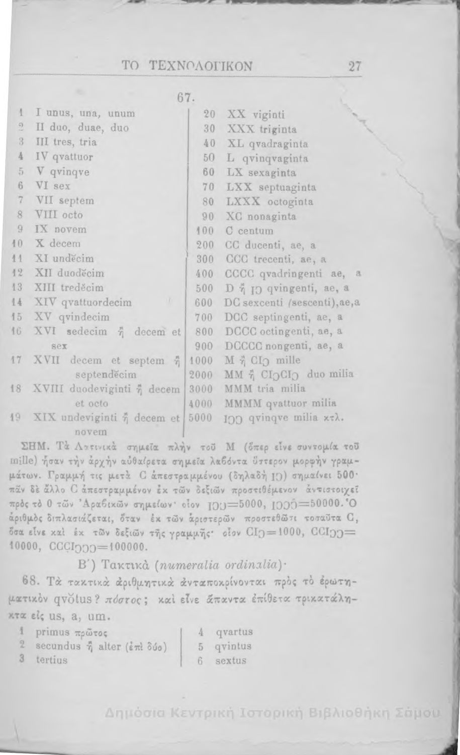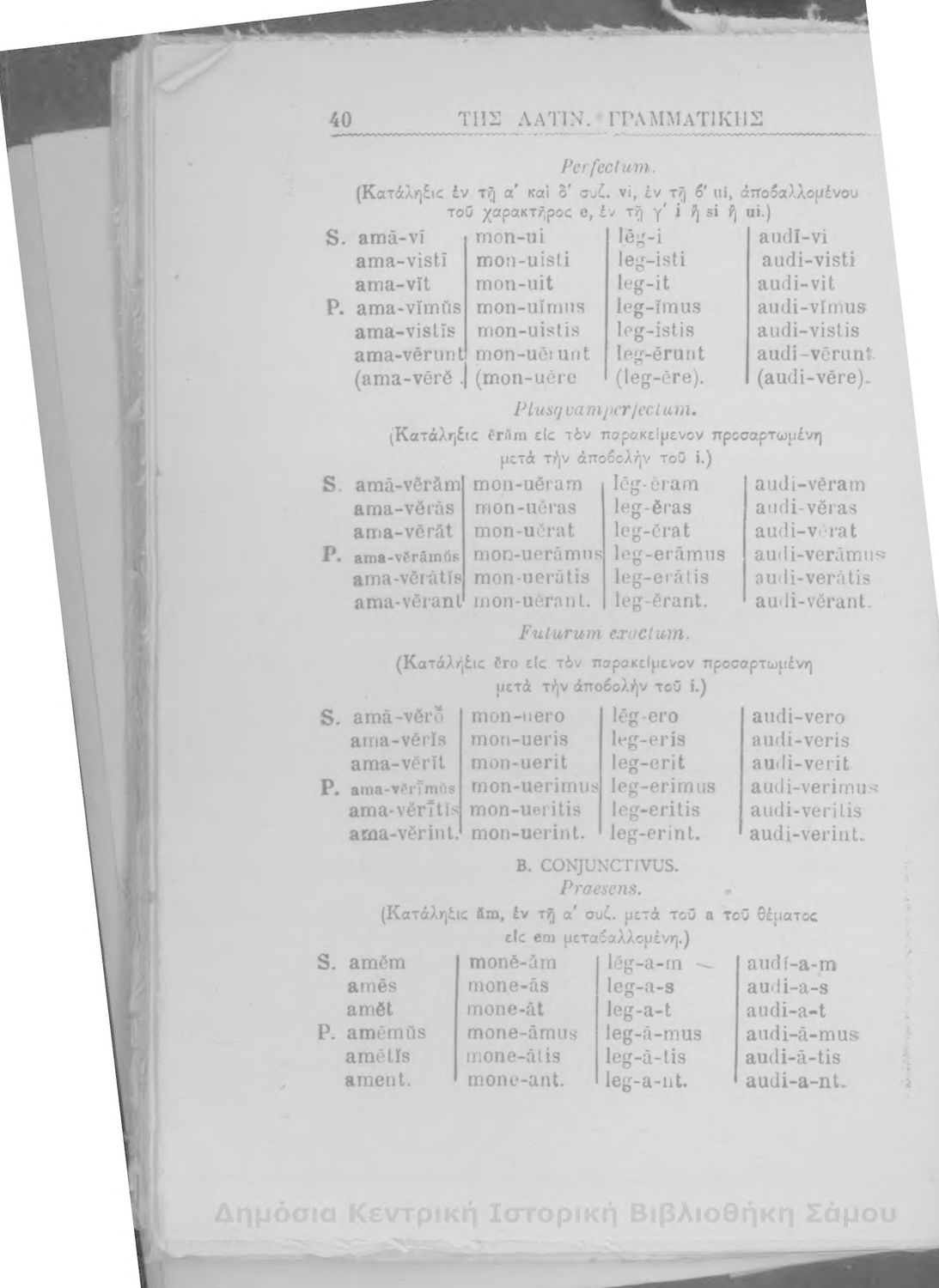 Σχολικό εγχειρίδιο Λατινικών που περιλαμβάνει γραμματική, συντακτικό, κείμενα και λεξιλόγιο.