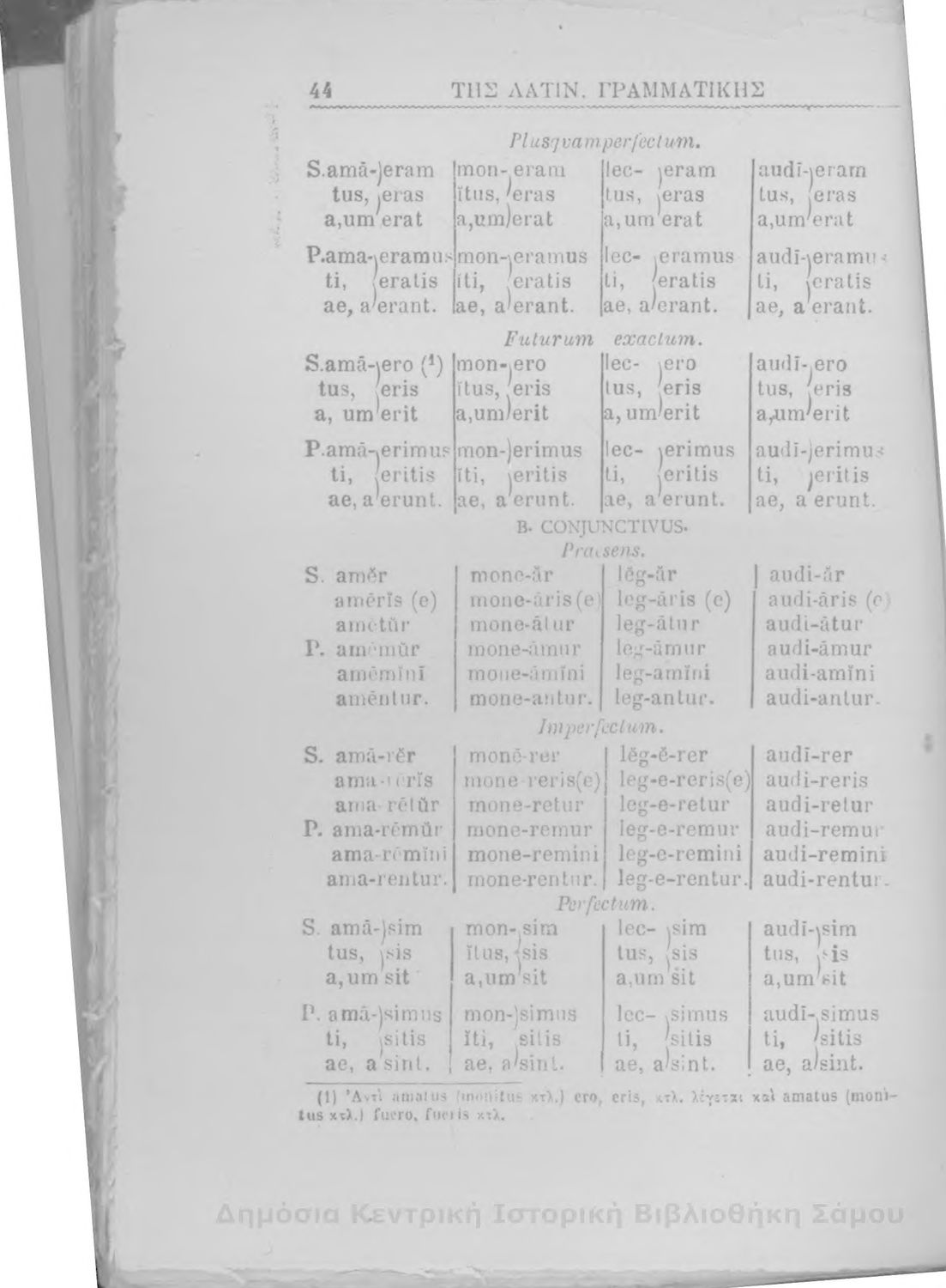 Σχολικό εγχειρίδιο Λατινικών που περιλαμβάνει γραμματική, συντακτικό, κείμενα και λεξιλόγιο.