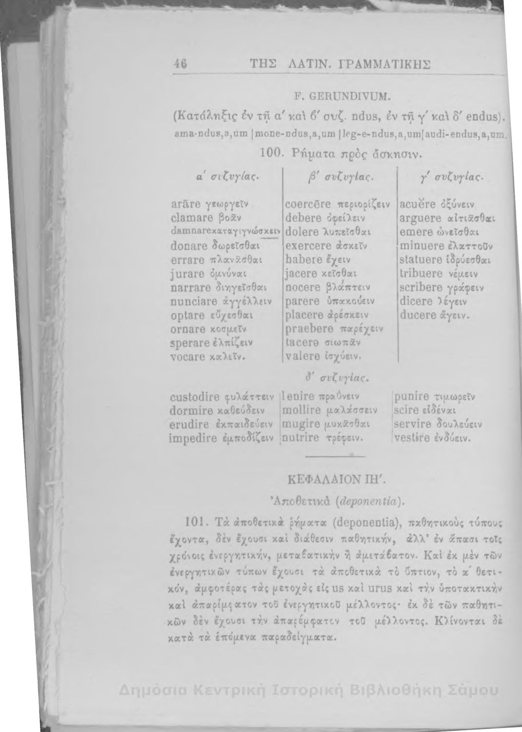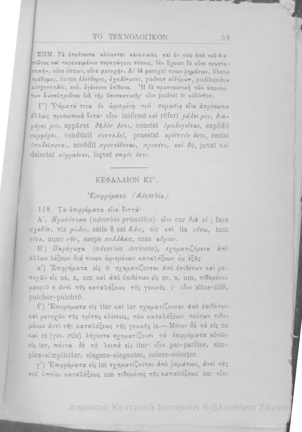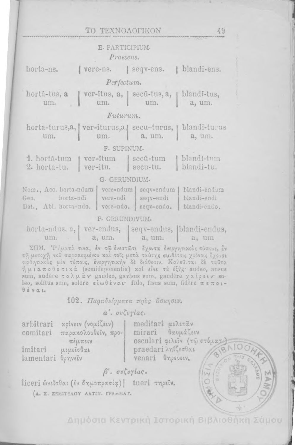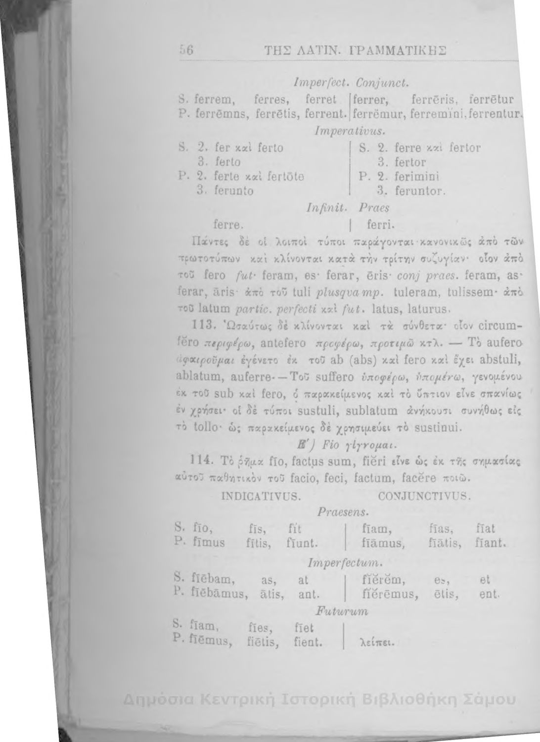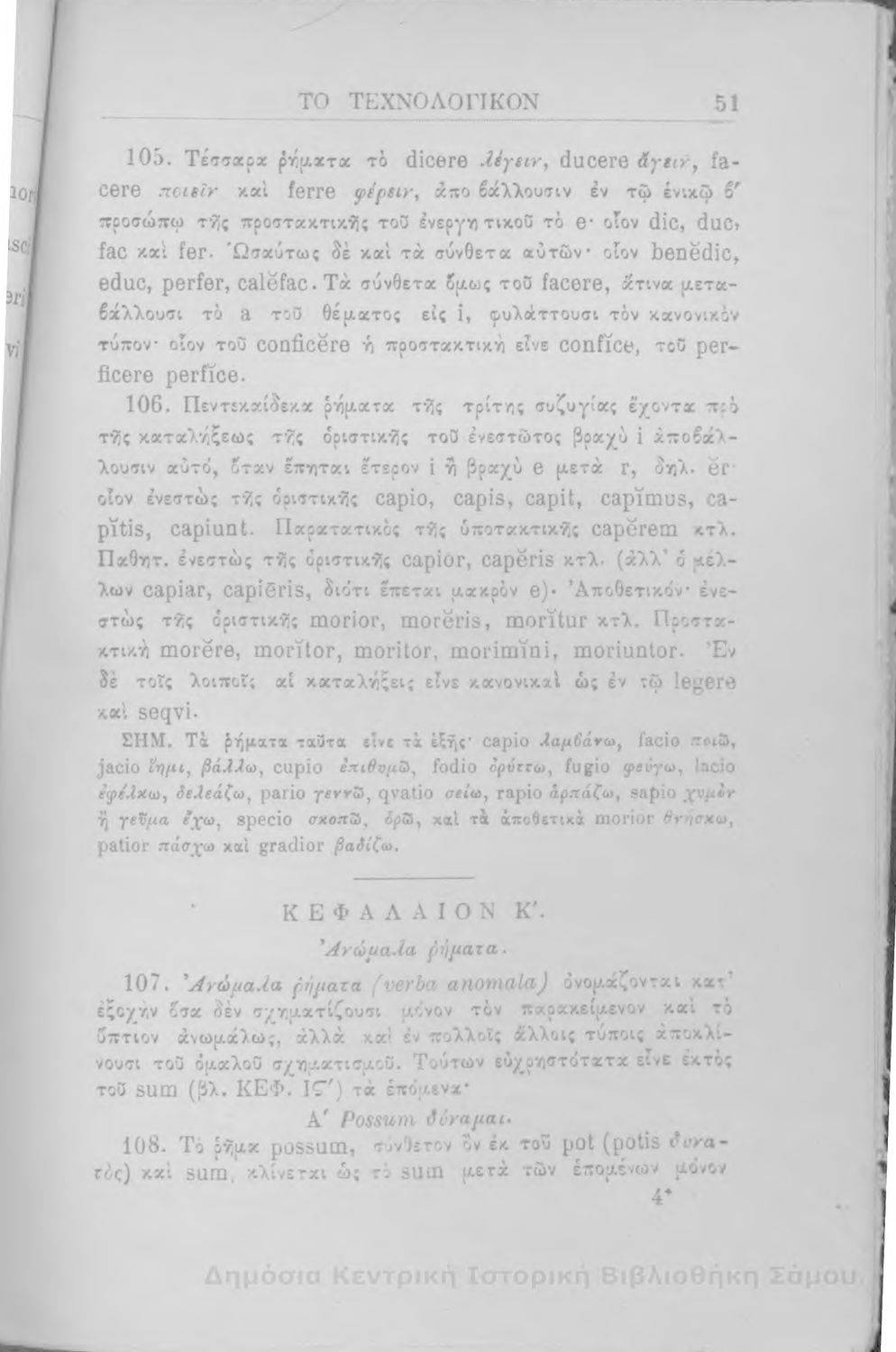 Γραμματικής της λατινικής γλώσσας για τα Ελληνικά Σχολεία και Γυμνάσια που περιέχει δύο τμήματα: το τεχνολογικό που εστιάζει στα μέρη του λόγου και το συντακτικό που ασχολείται με τις πτώσεις, τις εγκλίσεις, ...