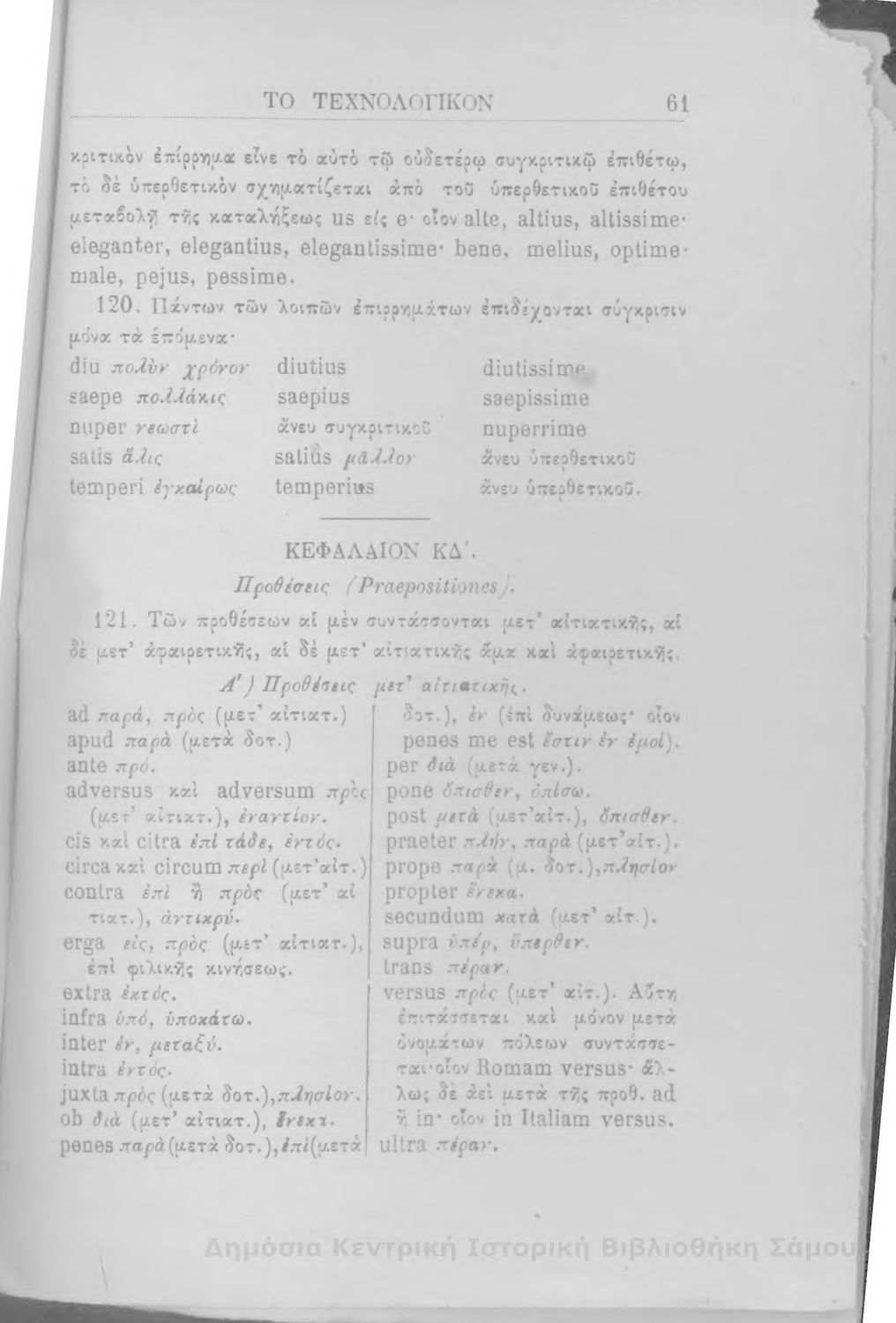 Γραμματικής της λατινικής γλώσσας για τα Ελληνικά Σχολεία και Γυμνάσια που περιέχει δύο τμήματα: το τεχνολογικό που εστιάζει στα μέρη του λόγου και το συντακτικό που ασχολείται με τις πτώσεις, τις εγκλίσεις, ...
