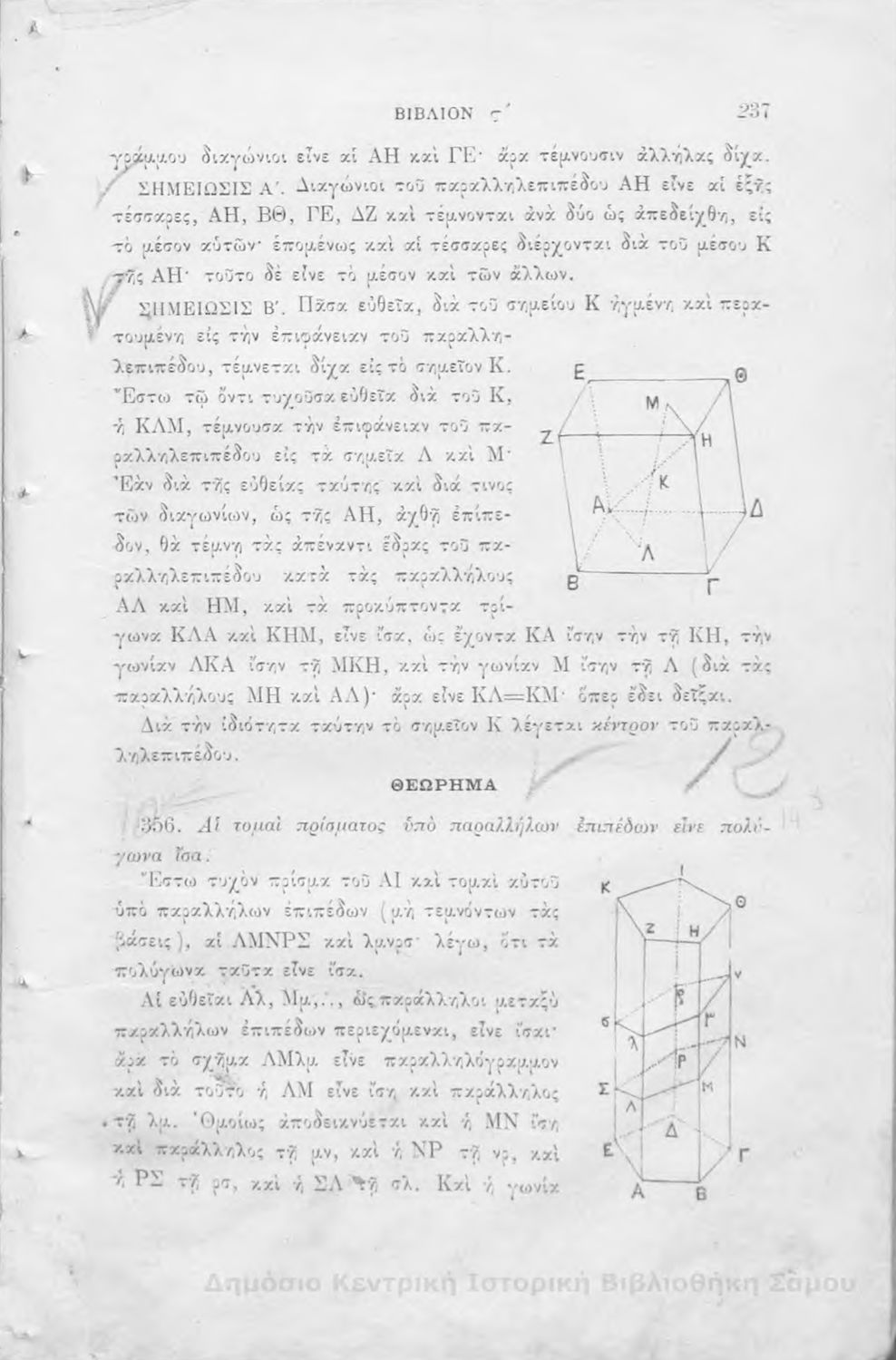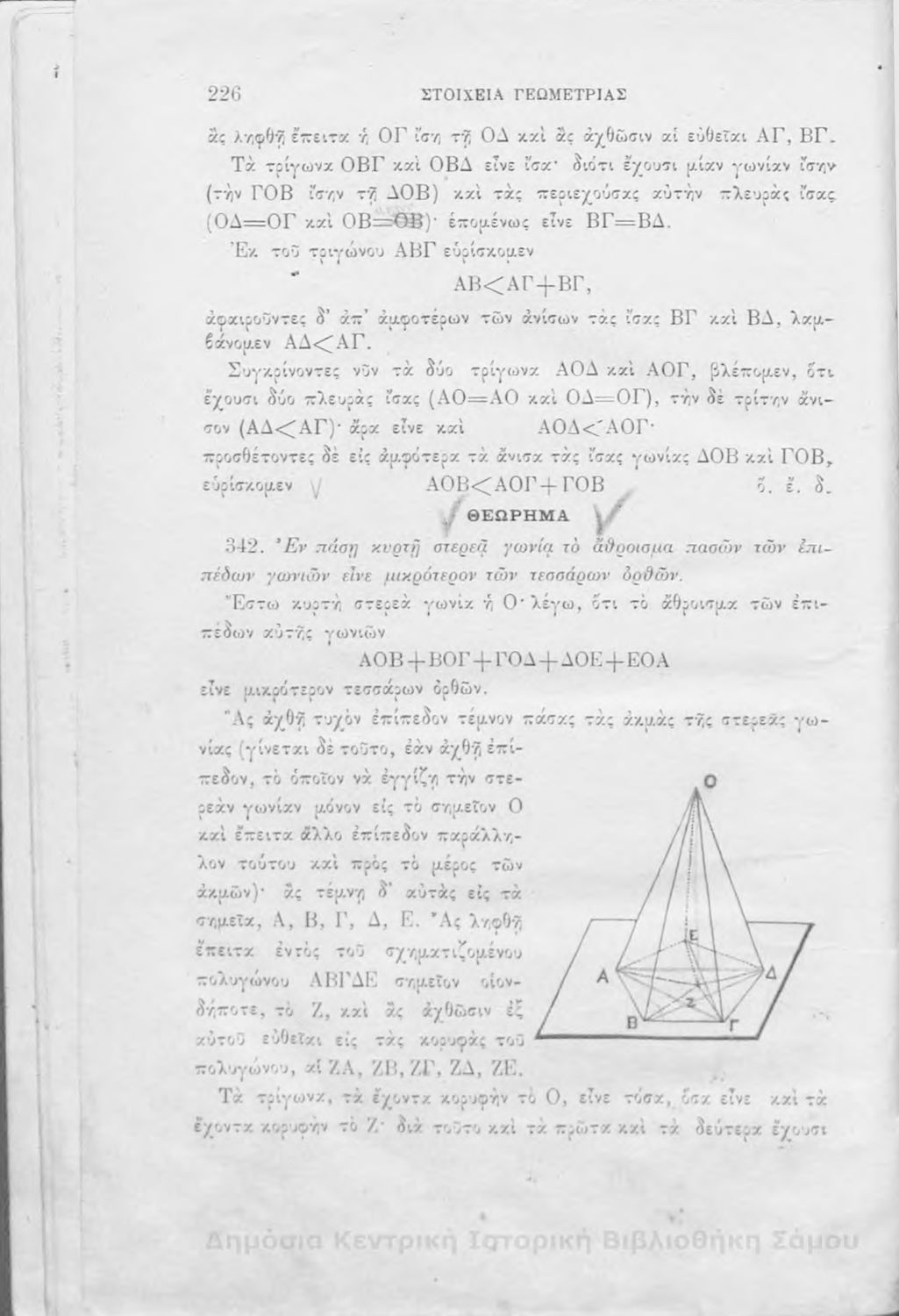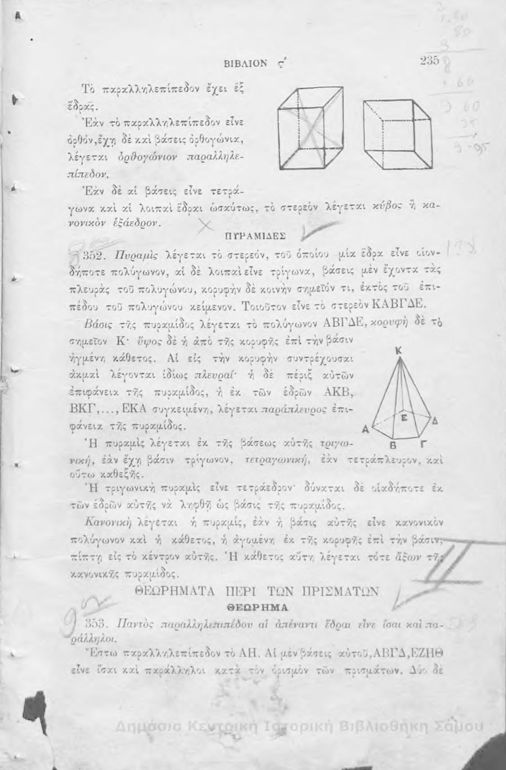 Σχολικό εγχειρίδιο Γεωμετρίας Γυμνασίου χωρισμένο σε ορισμούς, θεωρήματα, πορίσματα και ασκήσεις που εστιάζει στην Επιπεδομετρία και τη Στερεομετρία. Διαθέτει και παράρτημα με στοιχεία Αναλυτικής Γεωμετρίας.