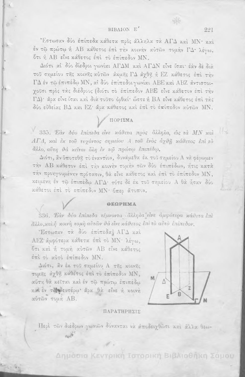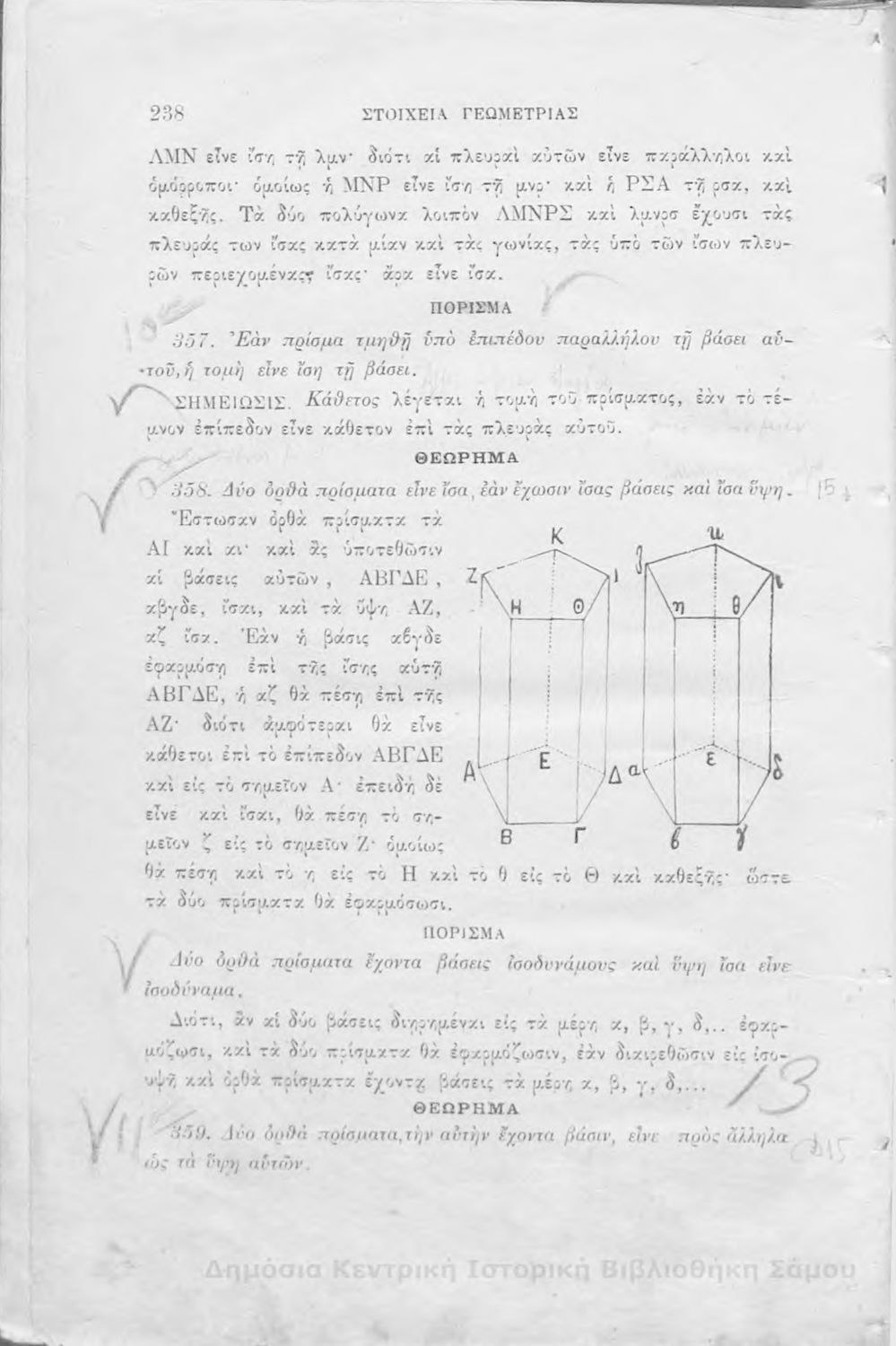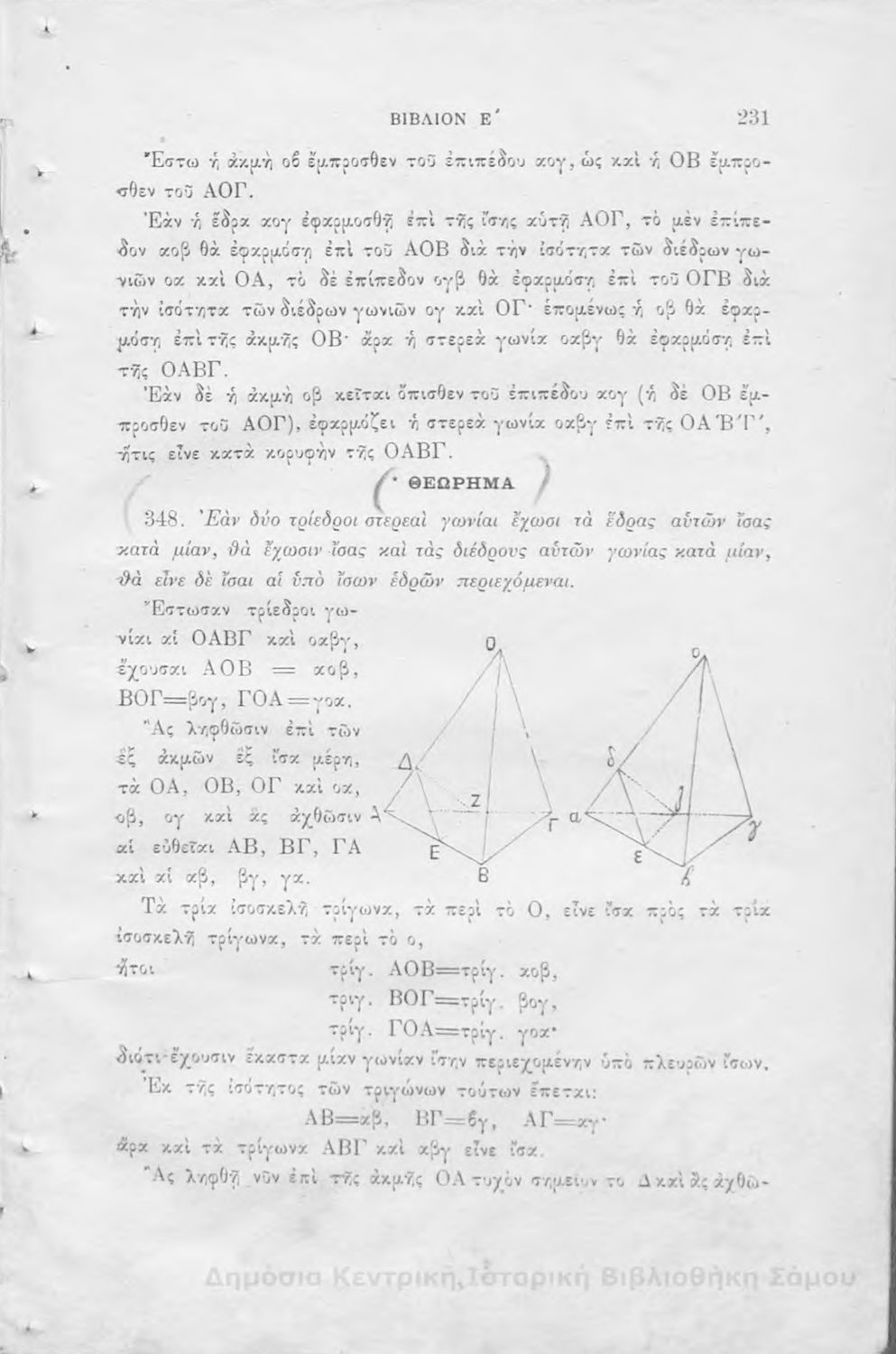 Σχολικό εγχειρίδιο Γεωμετρίας Γυμνασίου χωρισμένο σε ορισμούς, θεωρήματα, πορίσματα και ασκήσεις που εστιάζει στην Επιπεδομετρία και τη Στερεομετρία. Διαθέτει και παράρτημα με στοιχεία Αναλυτικής Γεωμετρίας.